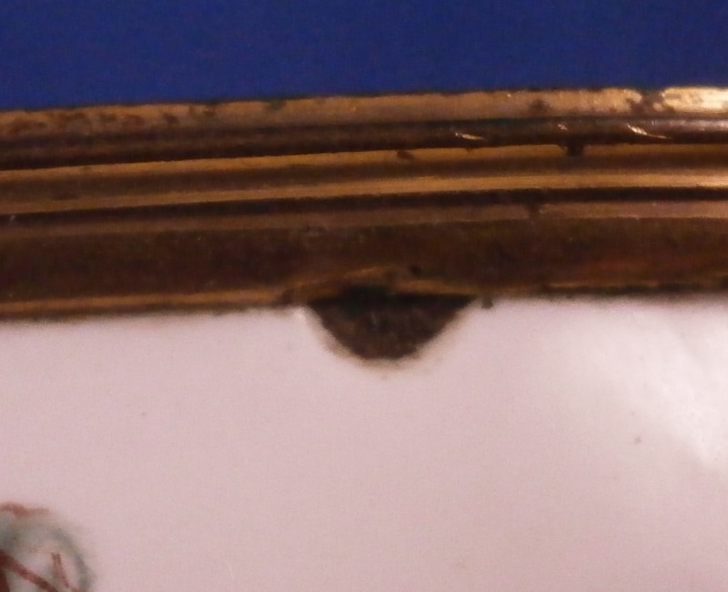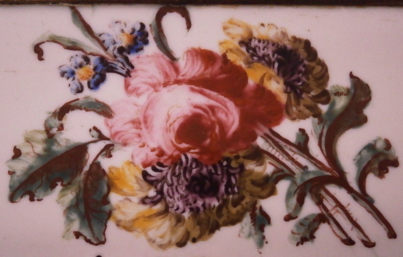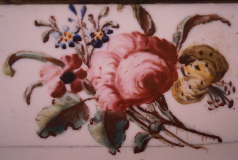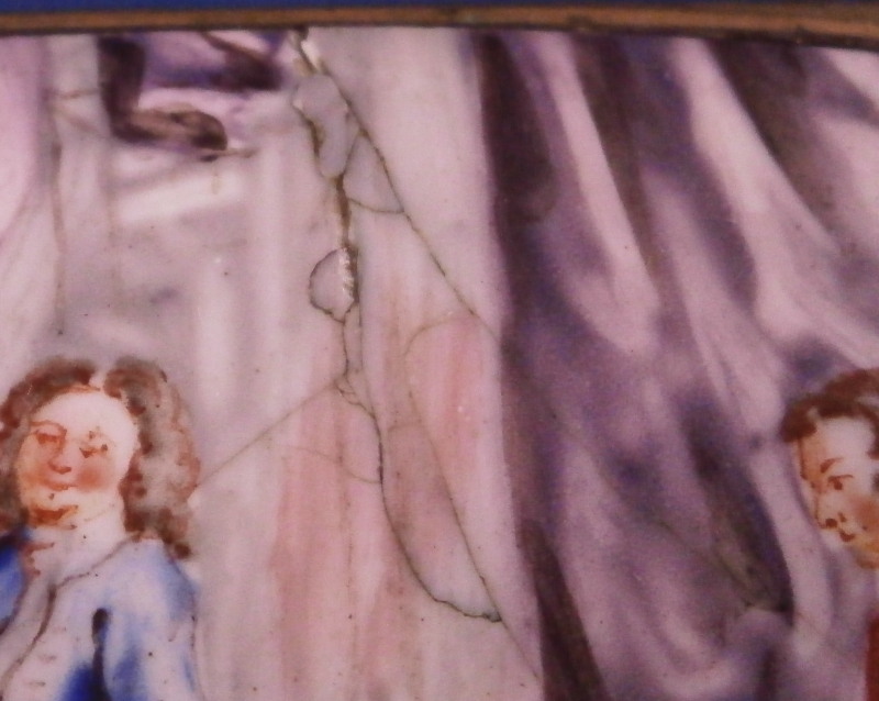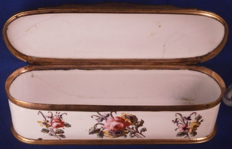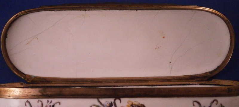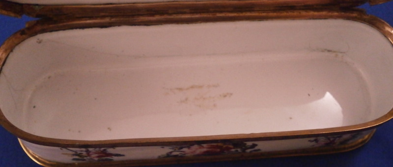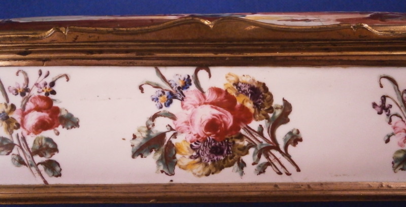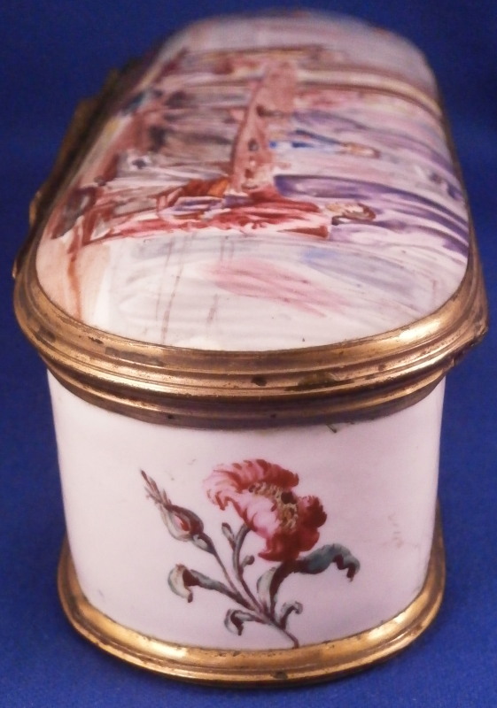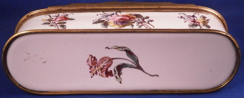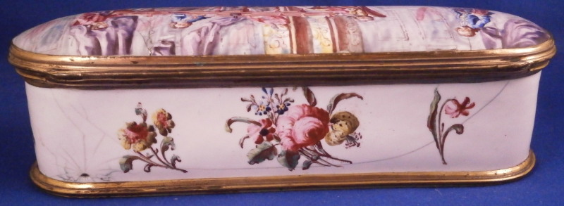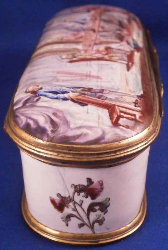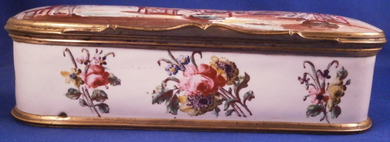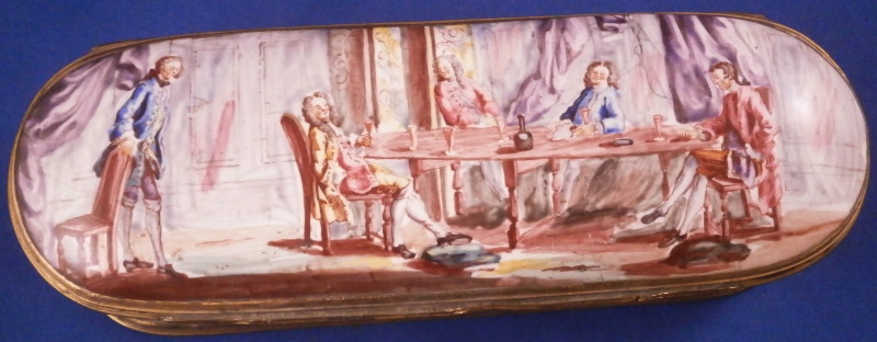 This is a really superb large box made in England,- probably in the Birmingham or London area or maybe the Bilston area of South Staffordshire region in the 18th century. They are all famous for their Battersea enamel boxes, etc. This is the one of the nicest and largest ones I have ever come across. The piece has gilded copper mounts and is hand painted with a large scene on top of aristocrats sitting around a table with another one pulling up a chair. The bottom part of the box has lots of hand painted floral arrangements all around and a very nice large single tulip to the underside. The inside is blank. The scene to the top is superb as are the flowers! The box is in great condition with a few hairlines to the enamel and two or three small spots of missing enamel. The gilding of the mounts is worn in places. The lid closes nicely and stays shut. All in all an amazing example! The box is 2 inches tall, 6.375 inches wide and 2.375 inches deep.Please email me for more information or other pictures.