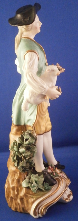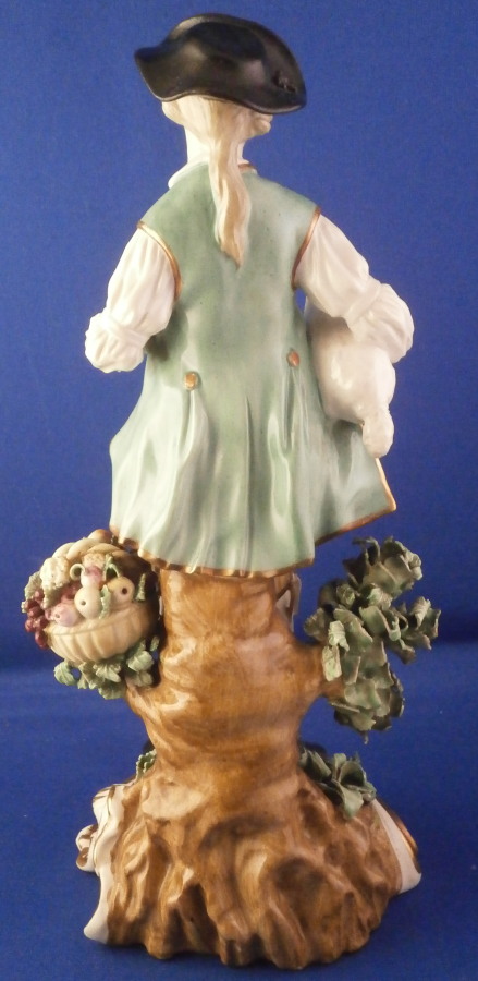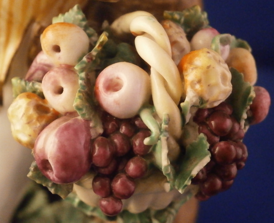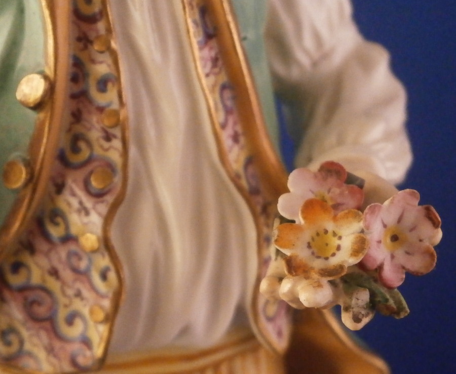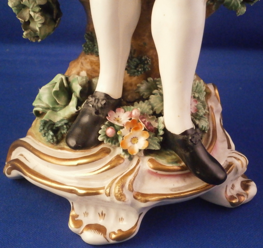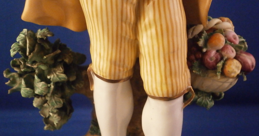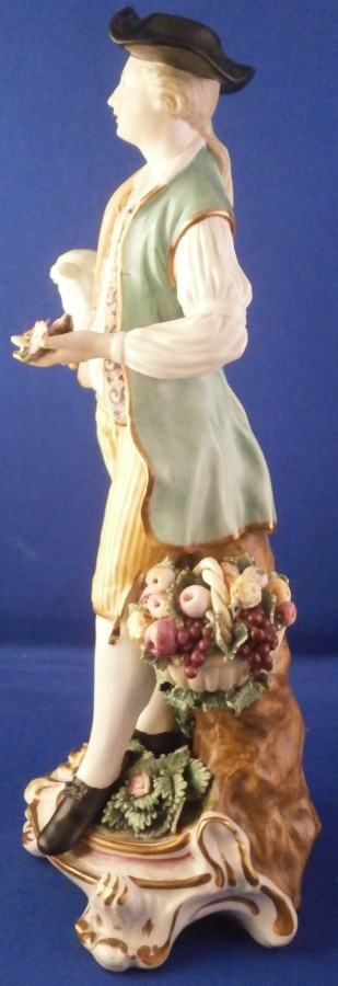 This is a figurine of a gentleman made by Derby during the Bloor period of the early 19th century. A really nice and early example with a lot of detail. He is very well modeled and nicely painted especially his vest! The detail and amount of flowers and fruit is truly superb. He has a basket next to him on the left side filled with fruit, a small floral arrangement in his left hand and a flower and small lamb in his right hand. A large leaf arrangement on his right side. The figure is standing on a nice base more reminiscent of 18th century Derby than most of the Bloor period pieces . More flowers and leaves to the base. The figurine is in amazing condition considering his age and the fragile nature of the decoration. He has no damage to him but off course there is some damage to flower petals, etc. but it is much less than one would expect. The flower under the lamb is hipped as are two petals on the base. A stem in his left hand is chipped and a bunch of elaves in the basket and the leaf arrangement are chipped as well. All in all as nice an example as I would ever expect to find! A truly stunning and cheery figurine. The figurine is marked underneath with an incised number 1056 as well as a blue crossed swords mark often found on early Bloor period figurines and meant to imitate Meissen. I also have his lady friend on the site if anyone would like the pair. The figurine is 9.625 inches tall, 4.5 inches wide and 3.5 inches deep. Please email me for more information or other pictures.