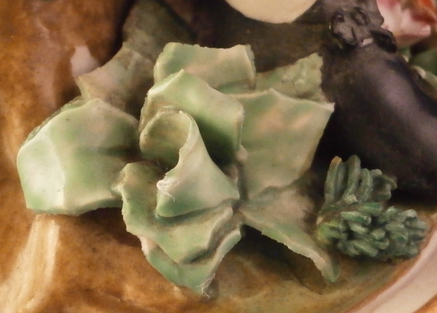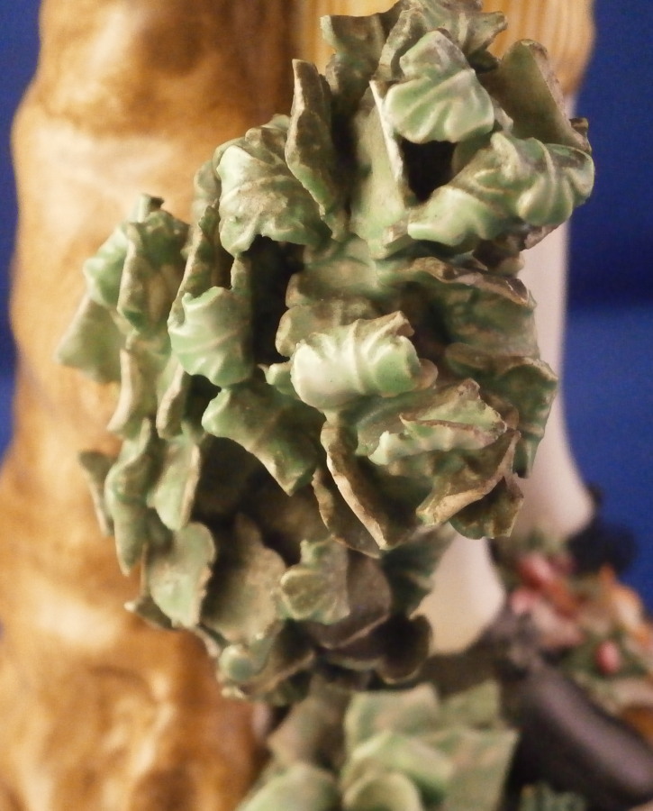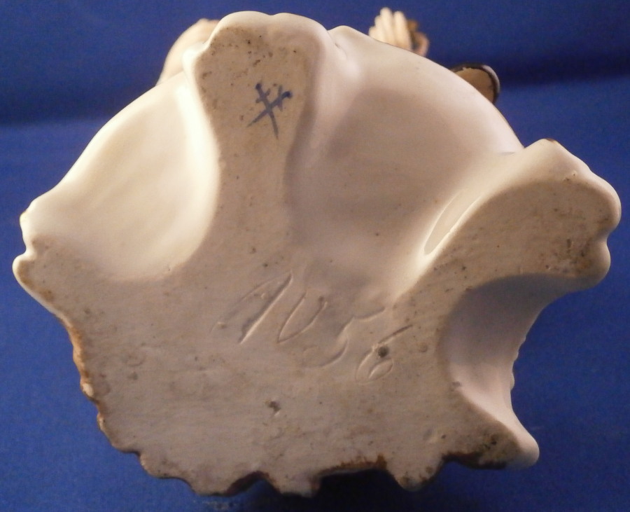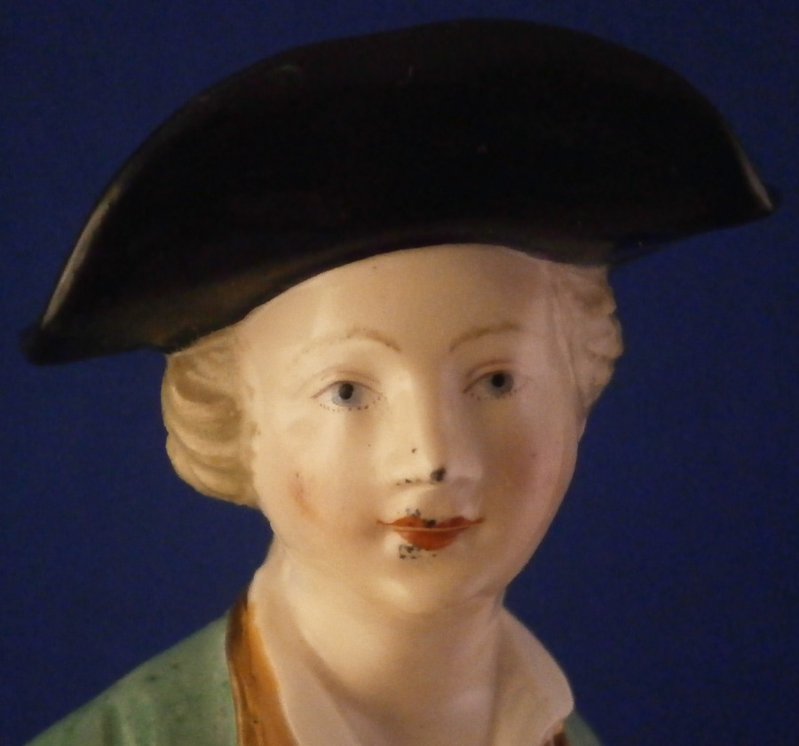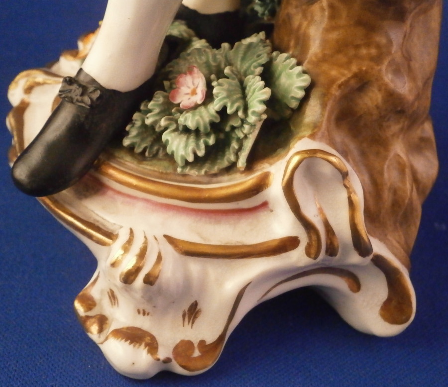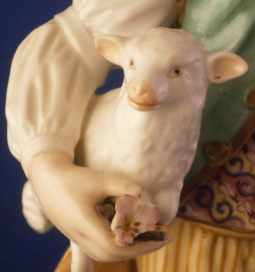 This is a figurine of a gentleman made by Derby during the Bloor period of the early 19th century. A really nice and early example with a lot of detail. He is very well modeled and nicely painted especially his vest! The detail and amount of flowers and fruit is truly superb. He has a basket next to him on the left side filled with fruit, a small floral arrangement in his left hand and a flower and small lamb in his right hand. A large leaf arrangement on his right side. The figure is standing on a nice base more reminiscent of 18th century Derby than most of the Bloor period pieces . More flowers and leaves to the base. The figurine is in amazing condition considering his age and the fragile nature of the decoration. He has no damage to him but off course there is some damage to flower petals, etc. but it is much less than one would expect. The flower under the lamb is hipped as are two petals on the base. A stem in his left hand is chipped and a bunch of elaves in the basket and the leaf arrangement are chipped as well. All in all as nice an example as I would ever expect to find! A truly stunning and cheery figurine. The figurine is marked underneath with an incised number 1056 as well as a blue crossed swords mark often found on early Bloor period figurines and meant to imitate Meissen. I also have his lady friend on the site if anyone would like the pair. The figurine is 9.625 inches tall, 4.5 inches wide and 3.5 inches deep. Please email me for more information or other pictures.