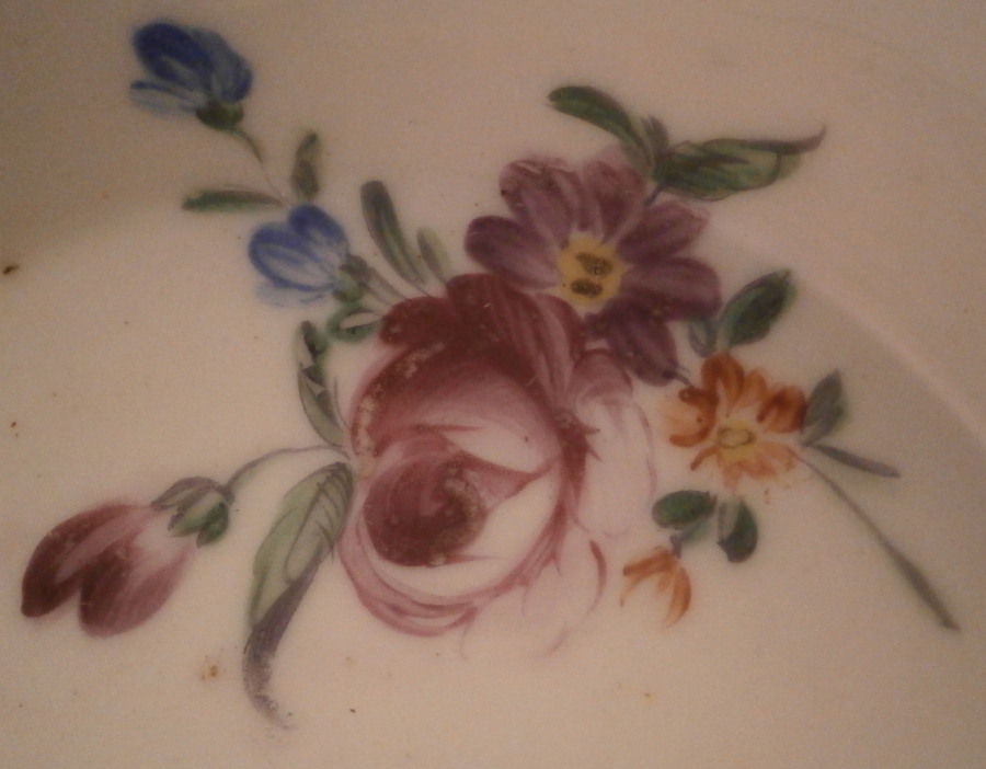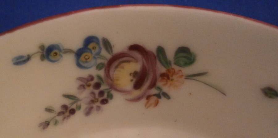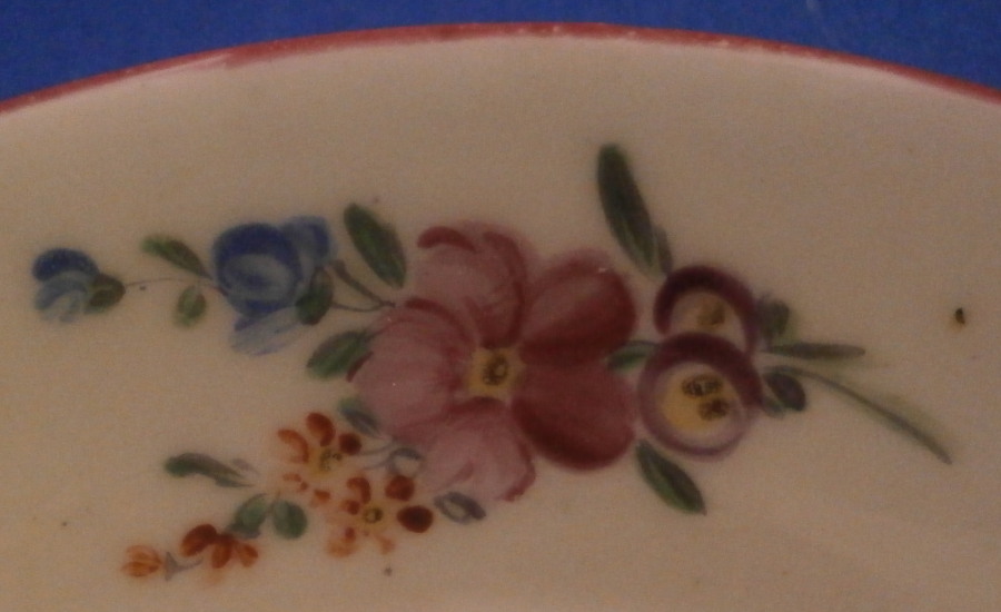 This is a superb saucer made by Bourg la Reine in the 18th century. It was started by Chalres Symphorien Jacques and Joseph Jullien around 1773 and is considered the continuation of the Mennecy factory which is why the two are very similar especially early on. It colsed its doors around 1805. The saucer is made of soft paste porcelain and thus has a creamy warm white color and the enamel colors of the flowers look quite different from the usual hard paste one sees much more often by other makers. Just superb. The piece is hand painted with three polychrome floral arrangements and a puce trim to the edge. The piece is marked with the incised letters BR mark as shown. Not a maker one sees very often and it's nice to ahve an example in my collection. The saucer is in great condition with some very minor wear and some tiny firing imperfection all common to early soft paste porcelain. It displays perfectly and is a great example. The piece is 1.25 inches tall and 4.625 inches in diameter. Please email me for more information or other pictures.