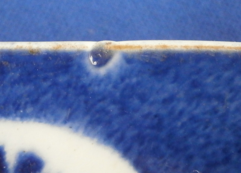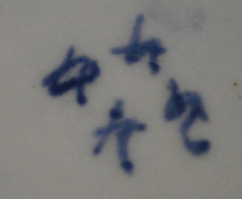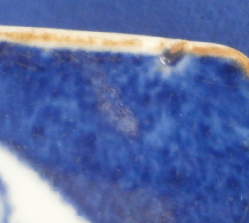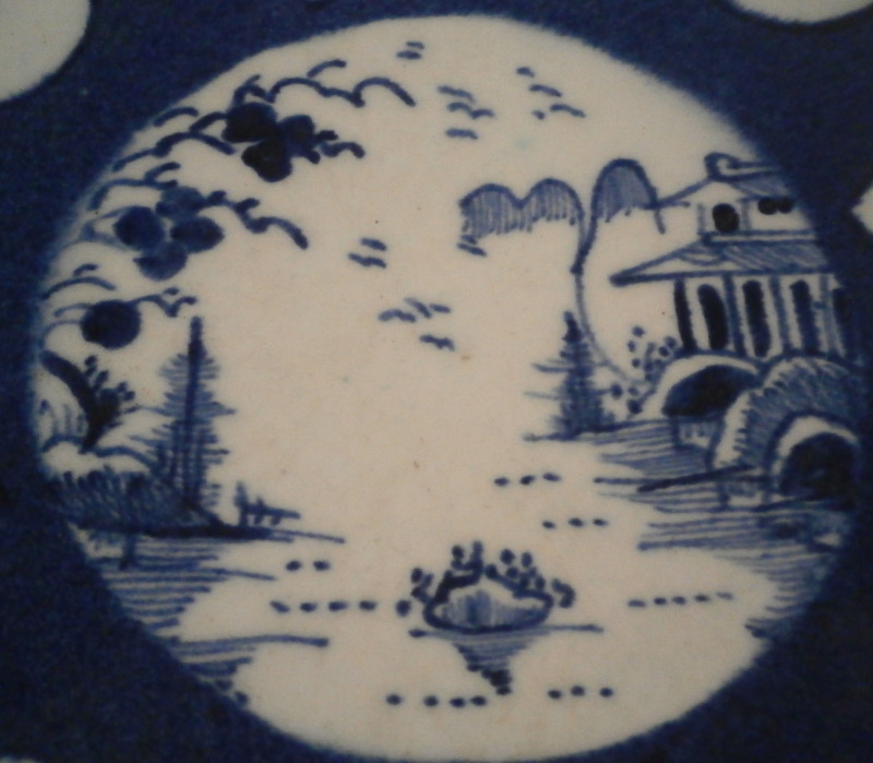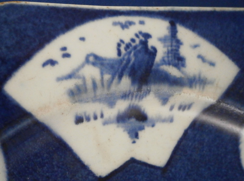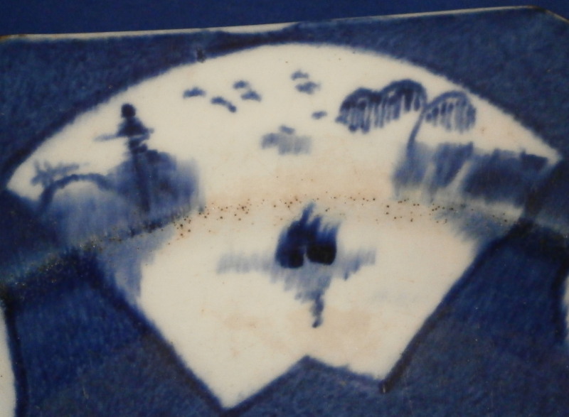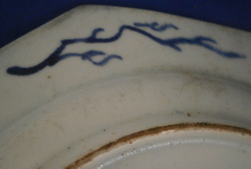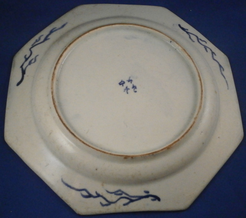 This is a fun octagonal plate made by Bow around 1765. It is hand painted with under glaze blue Chinoiserie or Asian inspired scenes on white ground with the rest of the plate around the white panels having a blue ground color. Nice shape to the plate that is very typical of Bow porcelain. The piece is in great condition with some flaws from the making such as extra porcelain dimples near the rim and some brown color along the edge and the foot ring which is very typical for this maker. Some stacking and use wear but it displays wonderfully! The plate is marked underneath with the chop marks style mark meant to imitate Chinese porcelain marks. The piece is 1 inch tall and 7.875 inchesin diameter. Please email me for more information or other pictures.