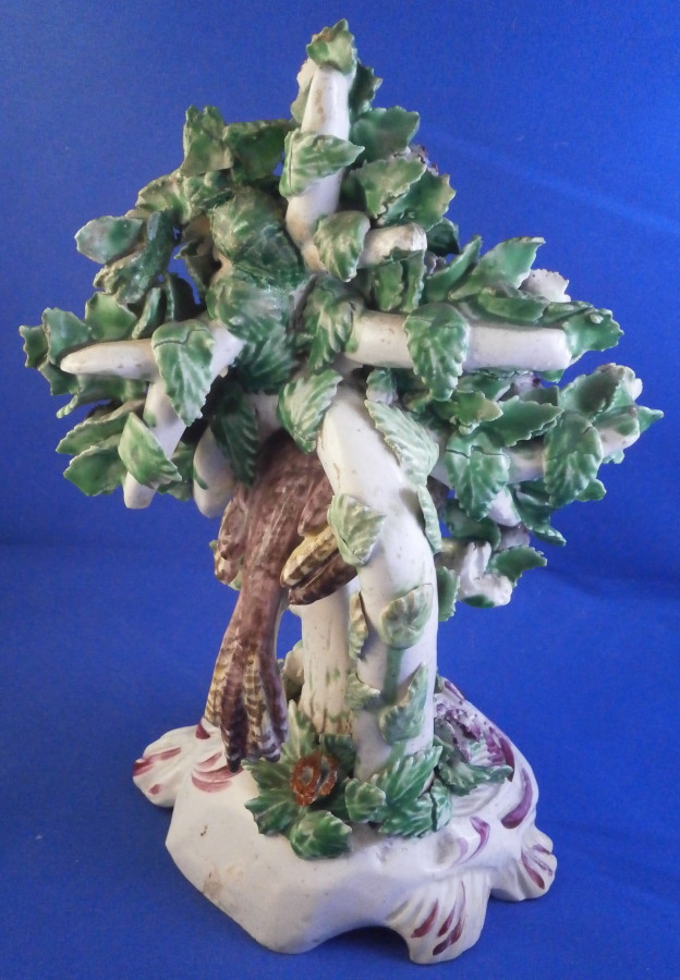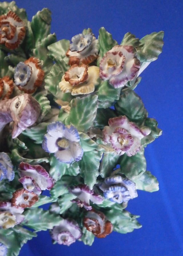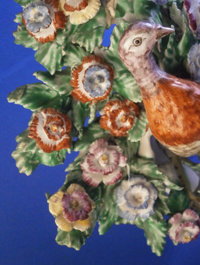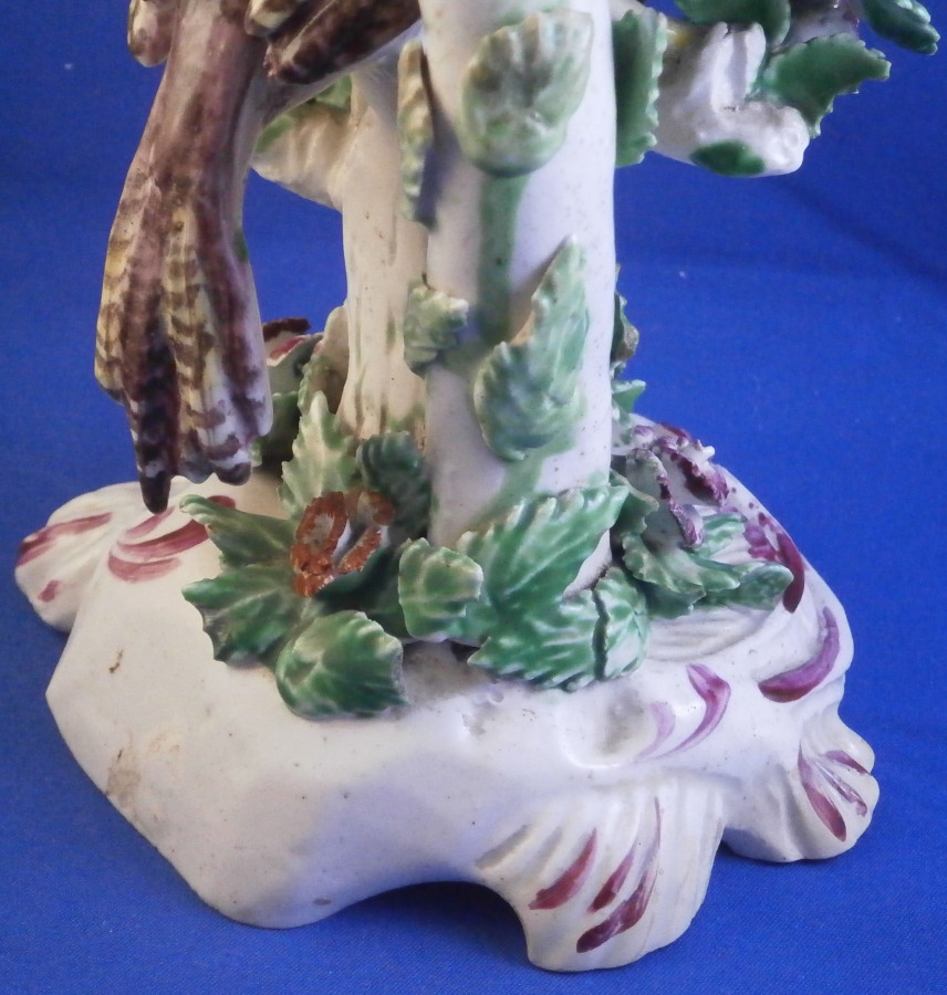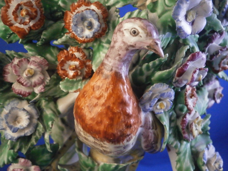 This is a really nice figurine of colorful pheasant type bird perched in a tree made by Bow around the mid 18th century. He is hiding in the center of the tree with the bocage all around him on a nice base with puce highlighted scrolls. The figure is nicely modeled and hand painted. The flowers and bird are especially nice! The piece is in superb condition with a few minor chips and an odd looking area to the back in one area of the bocage - it seems like a factory repair to me rather than a restoration. From the front that is invisible. A firing crack to the edge of the base but all in all as nice as you can find! The piece is unmarked underneath but that's the norm. The figurine is 8.5 inches tall, 5.75 inches wide and 4.5 inches deep. Please email me for more information or other pictures.