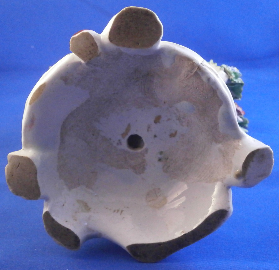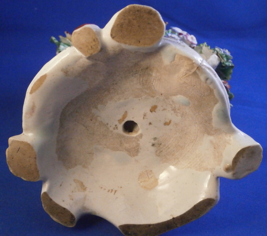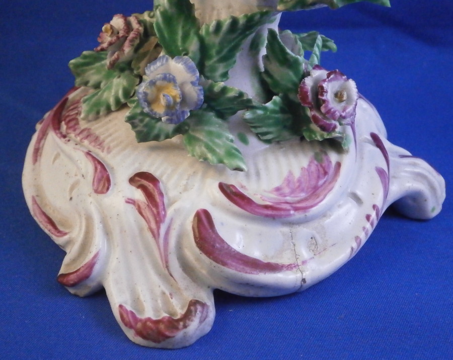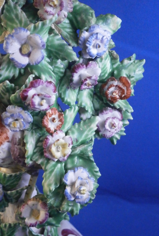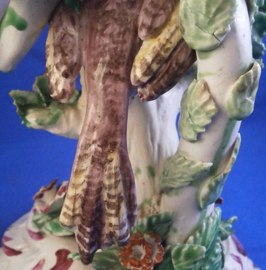 This is a really nice figurine of colorful pheasant type bird perched in a tree made by Bow around the mid 18th century. He is hiding in the center of the tree with the bocage all around him on a nice base with puce highlighted scrolls. The figure is nicely modeled and hand painted. The flowers and bird are especially nice! The piece is in superb condition with a few minor chips and an odd looking area to the back in one area of the bocage - it seems like a factory repair to me rather than a restoration. From the front that is invisible. A firing crack to the edge of the base but all in all as nice as you can find! The piece is unmarked underneath but that's the norm. The figurine is 8.5 inches tall, 5.75 inches wide and 4.5 inches deep. Please email me for more information or other pictures.