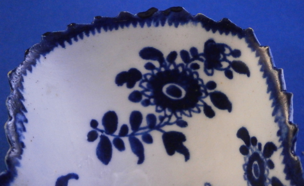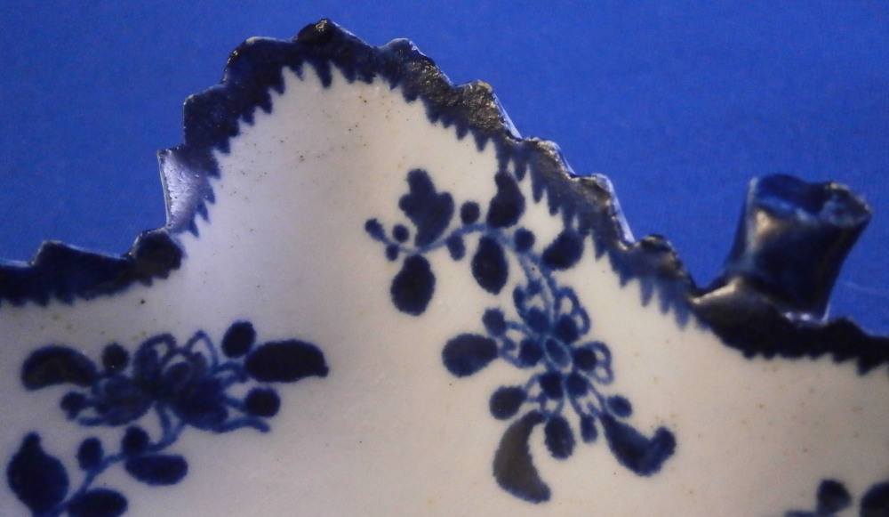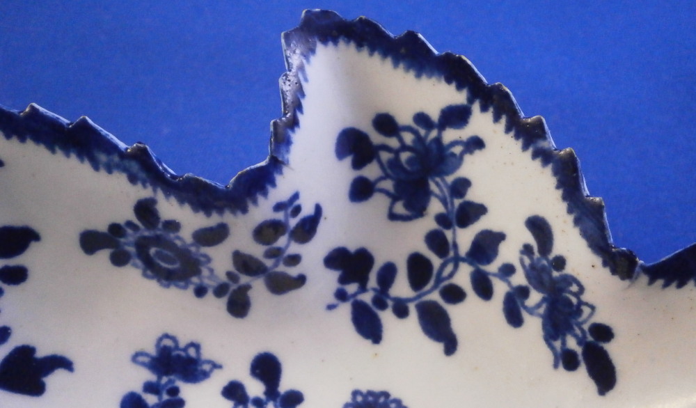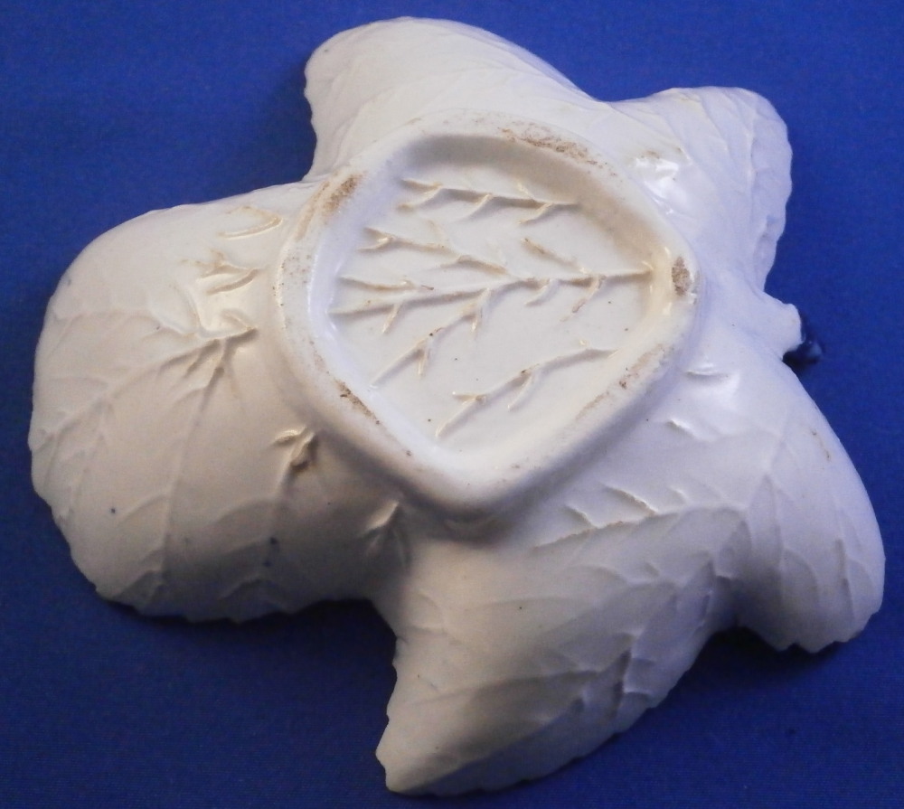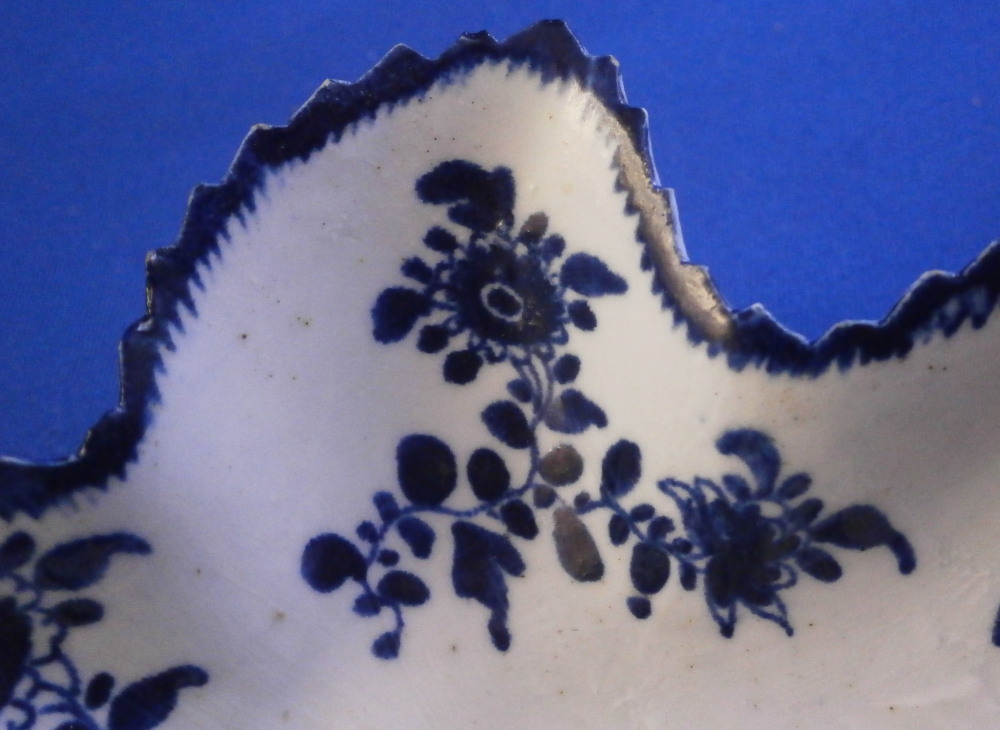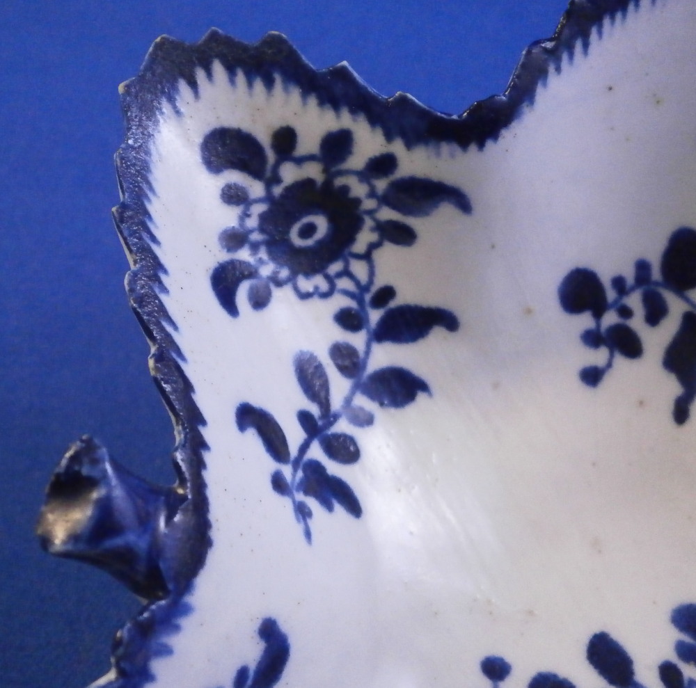 This is a really nice pickle dish made in the mid 18th century. I would say it was made by Bow but the flower at the tip is in th opposite direction of any other piece I could find in this pattern so it might be something more obscure. Eitehr way this piece is superbly modeled in the shape of a wine leaf with the veins in relief underneath. The top is hand painted with a ncie floral design in a really nice deep blue color. Nice crisp painting. No smears, etc. One of the nicest I have ever owned. The dish is in great condition with a few really minor nibbles to the edge some of which were colored in to hide them perfectly. Some minor stains to the underside normal to these early pieces. It displays perfectly and looks stunning! The piece is not marked which is the norm. It is 1.375 inches tall, 3.875 inches long and 4.125 inches wide. A touch larger than many pickle dishes. Please email me for more information or other pictures.