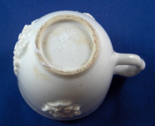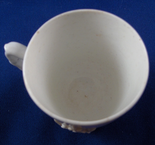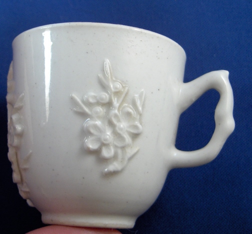 This is a cup made by Bow around 1755. It is simple yet very elegant being decorated with the famous prunus blossom design in relief on the outside of the cup. Nice handle which is a typical shape for Bow. These pieces are hard to find in decent shape if at all these days. This cup is in great condition with a 1mm chip on the inside rim and a short stained line on the rim about 5mm in length. I really don't think it is a hairline as the glaze looks totally OK but am not sure how the stain got there. There is also one flower that is missing a petal but it seems to be from the making as there is glaze underneath it. Also a spot near the bottom outside of the cup that has no glaze original to the making. The piece is unmarked underneath but that's the norm. It is 2.25 inches tall and 2.25 inches in diameter. Please email me for more information or other pictures.