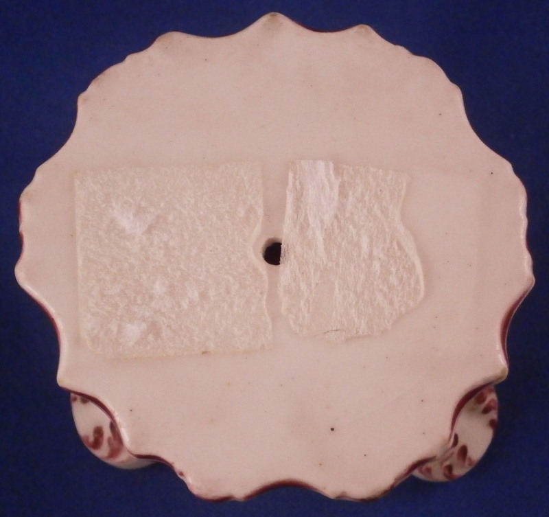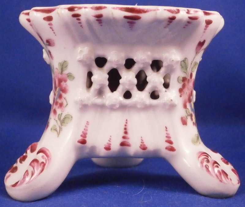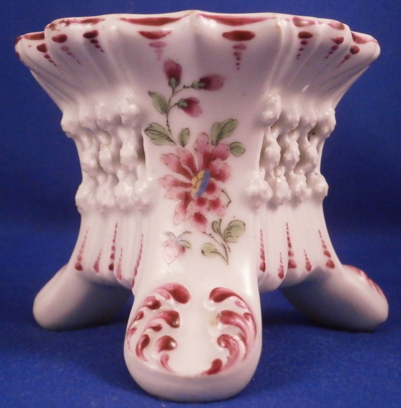 This is a rare and unusual little pedestal base for a small vase or figurine made of soft paste porcelain by Bow around 1760. An extremely fun piece which is nicely hand painted with a floral arrangement on each corneras well as some puce trim all around. There is a small hole in the center so they could affix a figure or vase to the base or anything else one might want to put on display that fit this pedestal. The piece has a triangular shape with a reticulated window to each side as well as some relief design to the paste. It sits on three feet and has a roundish top. The piece is just superb! The piece is in great condition with some very minor wear - it displays perfectly! The pedestal is unmarked underneath but that's the norm. It is 2.25 inches tall with a top diameter of about 2.75 inches at the widest. Please email me for more information or other pictures.