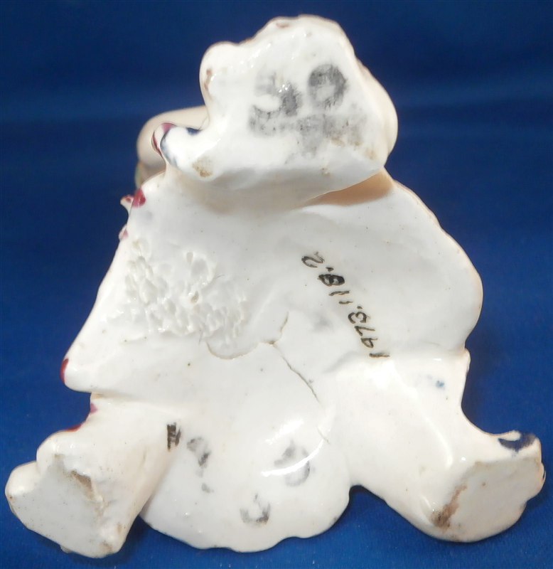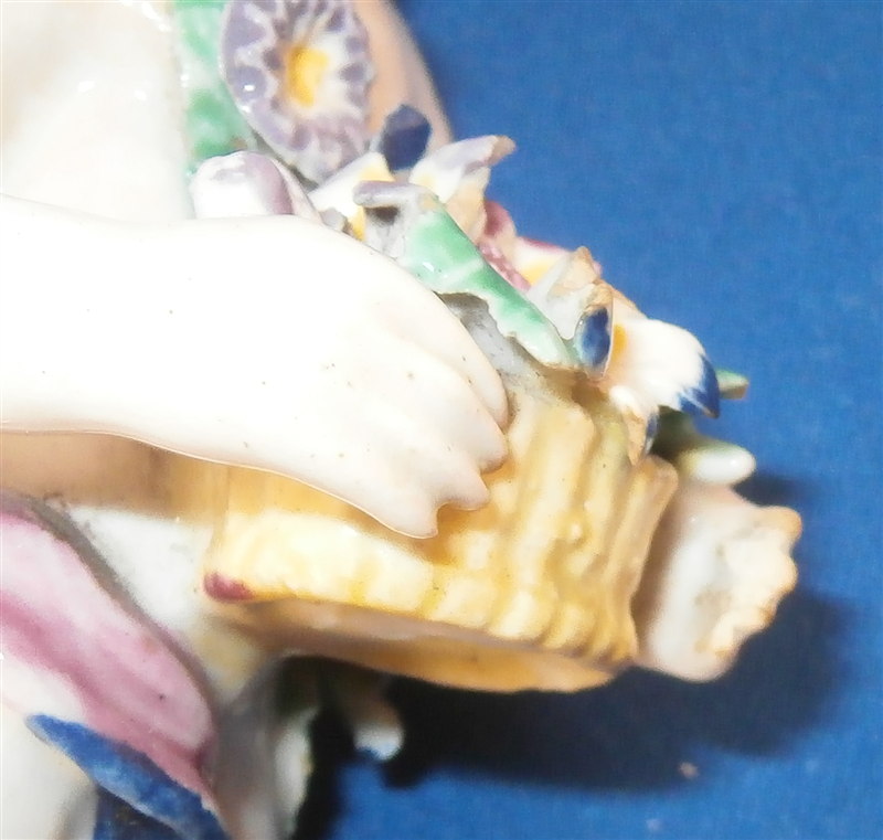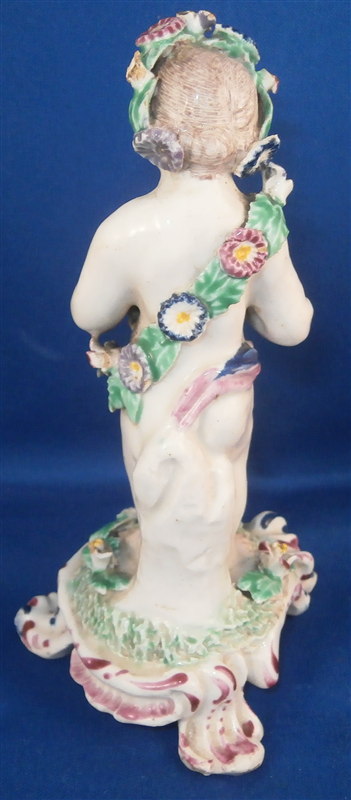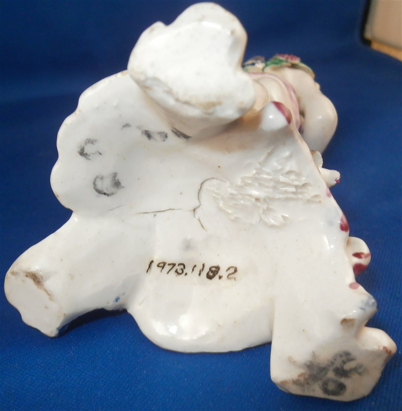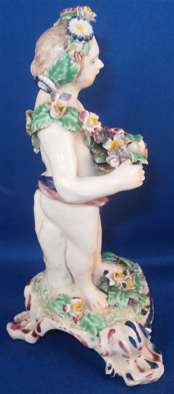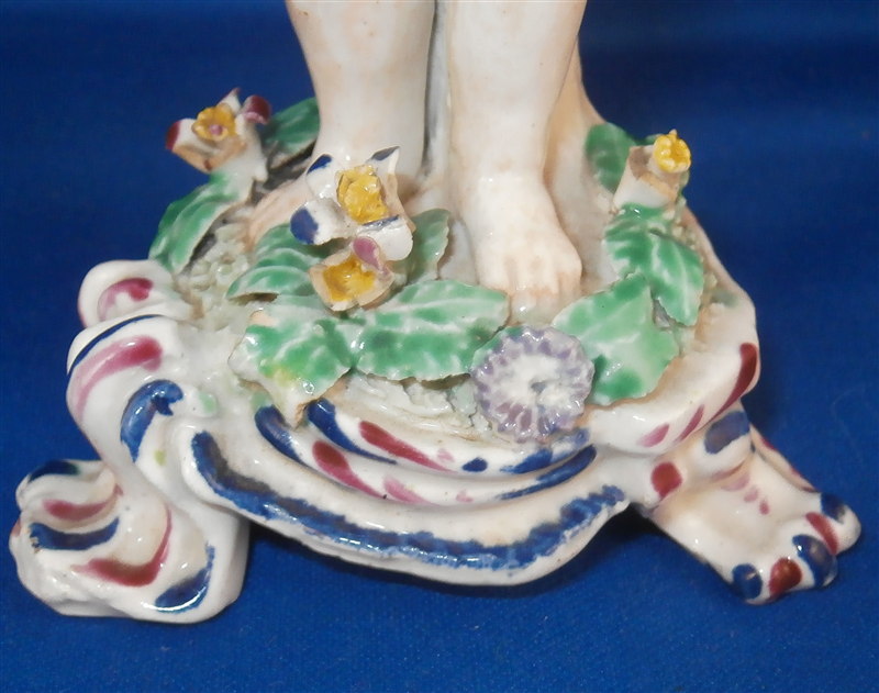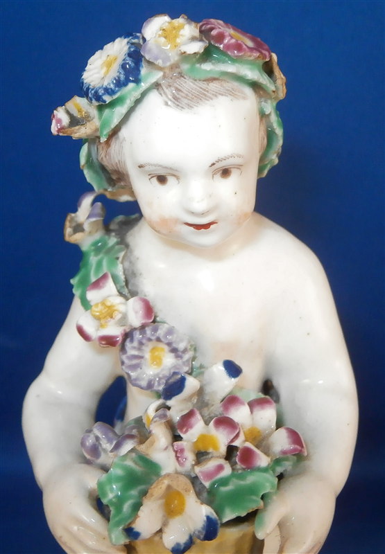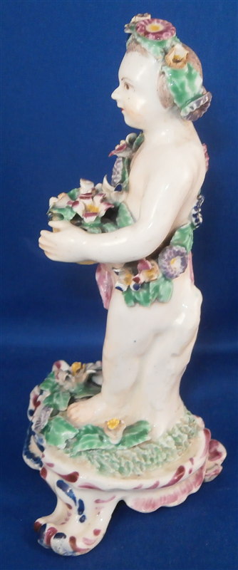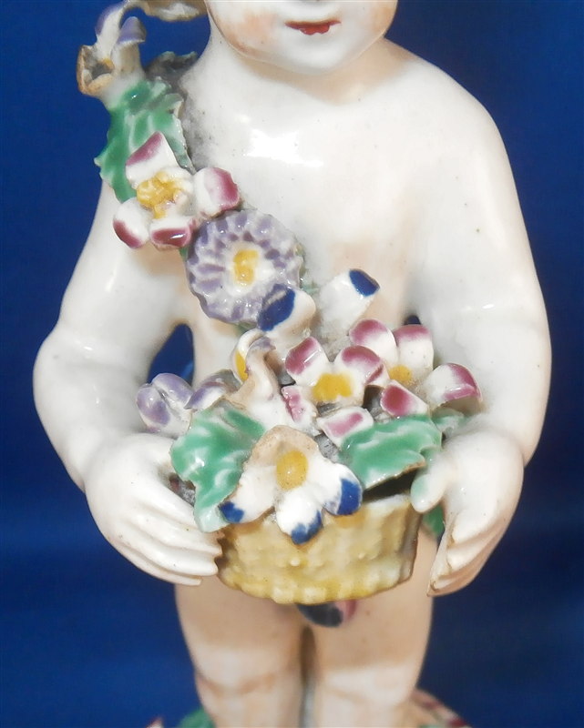 This is a nice figurine of a putto standing on a base made by Bow around the mid 18th century. He is nicely modeled with a basket in his hands full of flowers as well as a floral garland over his shoulder and around his head. The base stands on three feet with some more flwoers around the top. Beautifully painted in their typical colors. The figurine is in superb condition better than most one sees. Only small issue is three chipped petals on flowers in the basket, two chipped flowers on his head, one on the garland and some chipping to the flowers around the base and the tips of the fingers of his left hand are chipped but nothing that distracts from the piece at all. He displays very well. He is unmarked underneath but that's the norm - there is however an old museum ID underneath as shown. The figurine is 5.75 inches tall, 3.25 inches wide and 2.875 inches deep. Please email me for more information or other pictures.