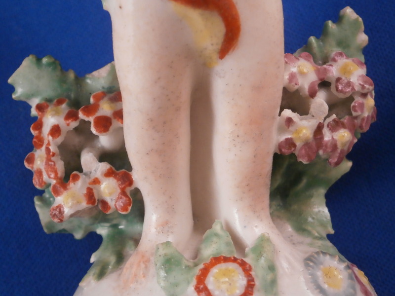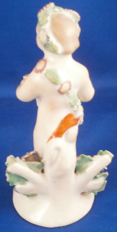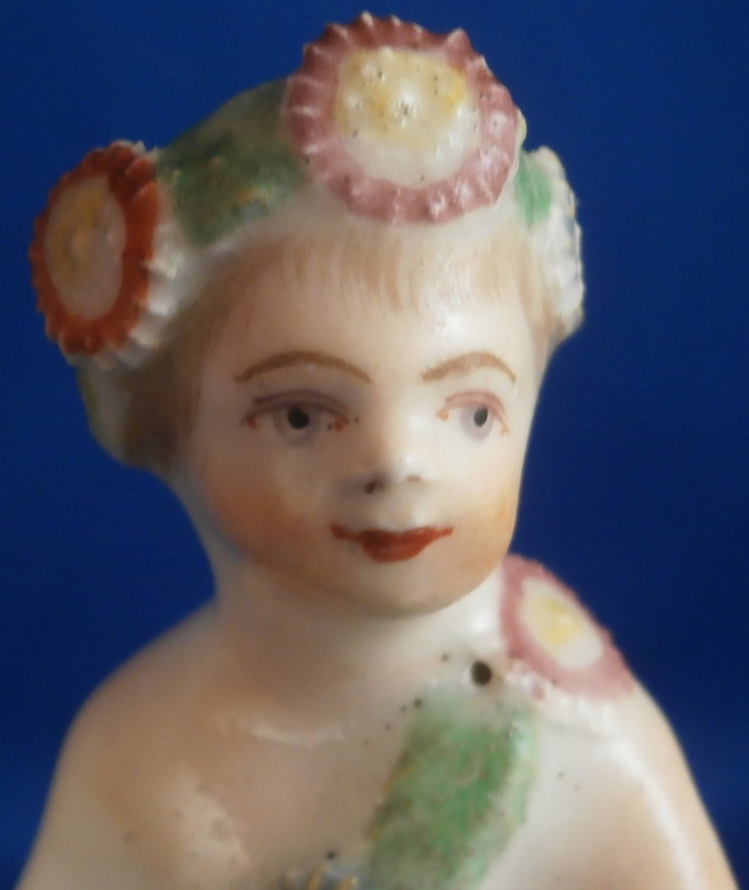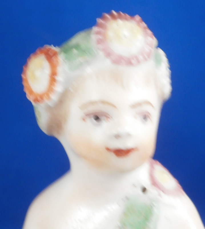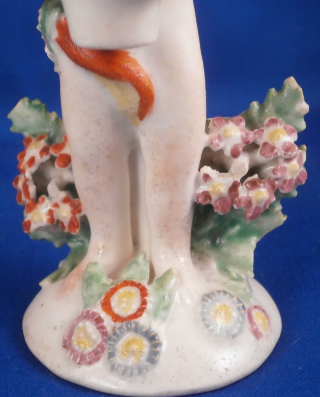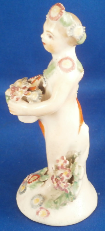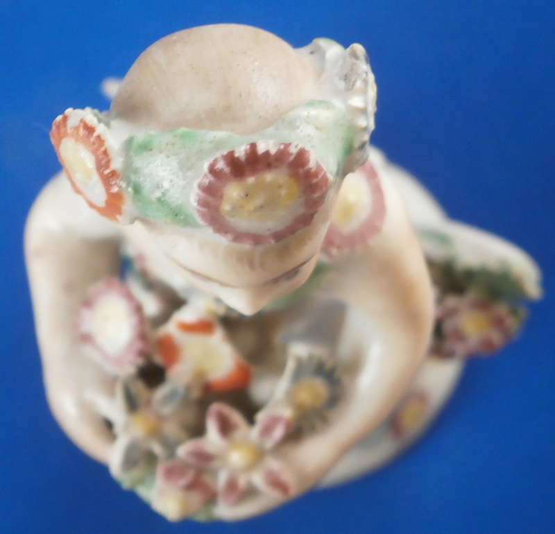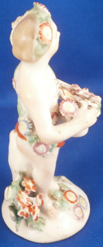 This is a figurine of a putto made by Bow around 1765. The figure is nicely modeled and painted. He is holding a basket of flowers in front of him with two small boccage type decorations to his sides. The putto has a garland of flowers around him and some flowers by his feet and on top of his head. The figurine is in good condition and diplays very well but the piece has some minor damage to flowers and leaves. All in all about as nice as one can hope for. He is unmarked underneath but that's the norm. The figurine is 4.75 inches tall, 2.25 inches wide and just under 2 inches deep. Please email me for more information or other pictures.