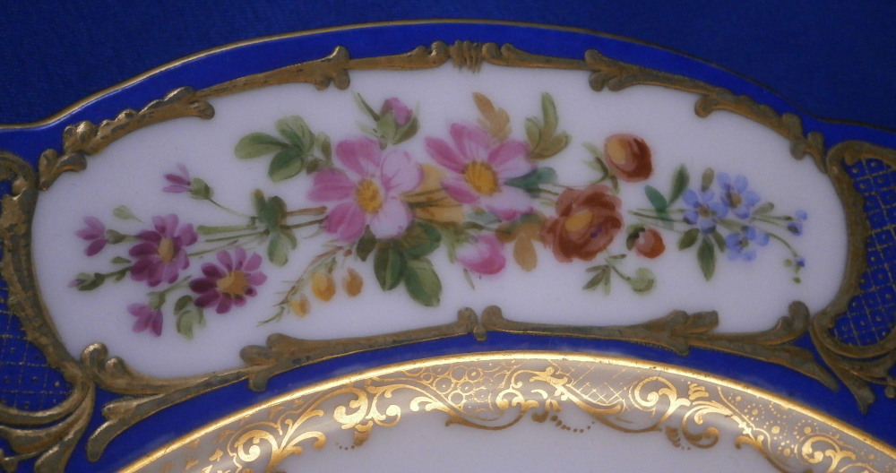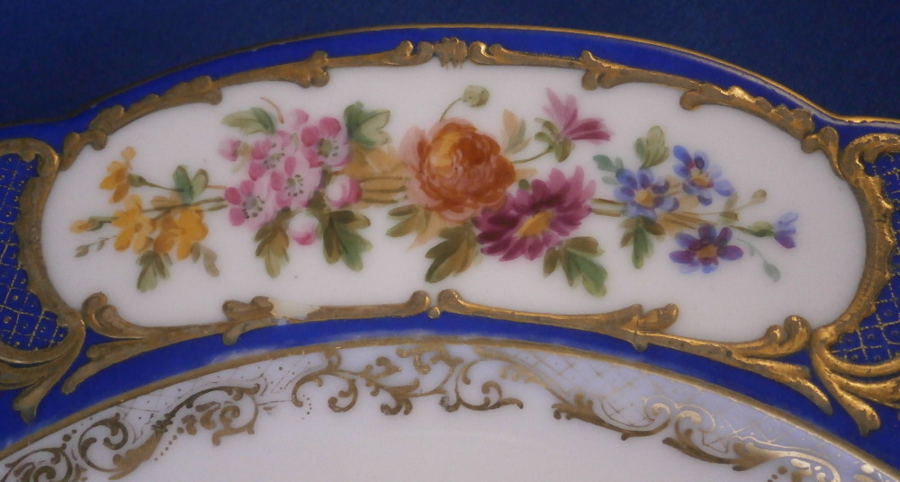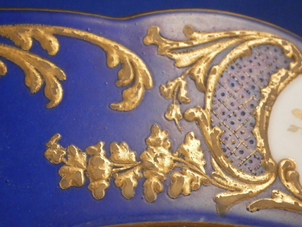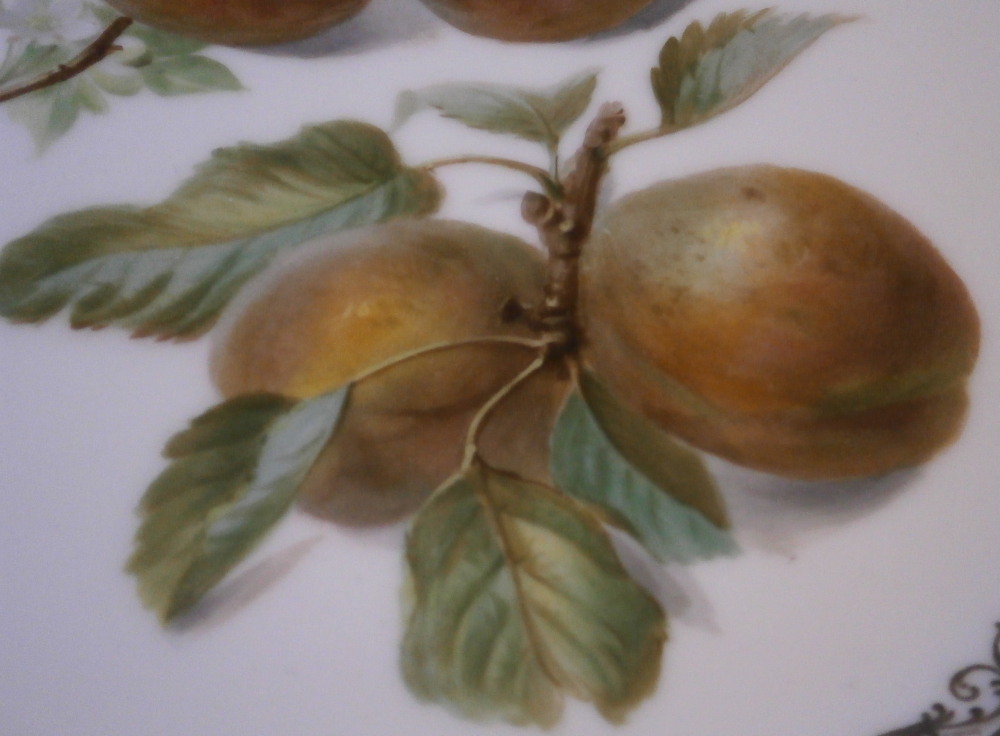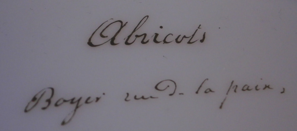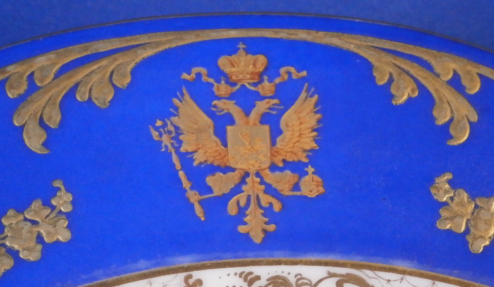 This is a really nice and interesting plate made in the Paris region of France and decorated at the workshop of Boyer Rue De La Paix in the mid 19th century around the late 1850s. This would place them in the time of Tsar Alexander II which fits the armorial used here. Jean-Pierre Feuillet started the studio and was very successful. He enjoyed patronage from the Prince de Condé among many others. In about 1834 Boyer joined him and eventually took over. The plate is superbly hand painted with two different apricot designs in the center. One having two whole fruit on a piece of branch with its leaves still attached and the other a flowering branch with a broken open apricot fruit next to it revealing the pit inside. The edge of the well has a fancy gold trim to it and the rim has this royal blue ground color to it with three panels of polychrome flowers on white ground with raised gilding on the blue ground. Off course the most exciting part of the plate is the red and gold Impreial Russian eagle cypher from the reign of Alexander II. Each eagle is wearing a small crown with a larger central crown above it, a scepter in one claw and the orb in the other with the central shield of the coat of arms of Moscow ( St. George slaying the dragon ). There are some French plates made for he Russian imperial family, usually for their summer residence in the south of France. Quite rare but you do see some from time to time though I ahve not come across any that are as nice as this example in a long time! A stunning looking piece! The plate is in great condition with some minor wear to the raised gilding along the rim of the plate. It displays perfectly and looks amazing plus not something you will find again anytime soon if ever. The piece is marked with the gold Boyer Rue de la paix mark as shown as well as Abricots for the title of the scene. The plate is 10 inches in diameter and 0.875 inches tall so a nice size for displaying. Please email me for more information or other pictures.