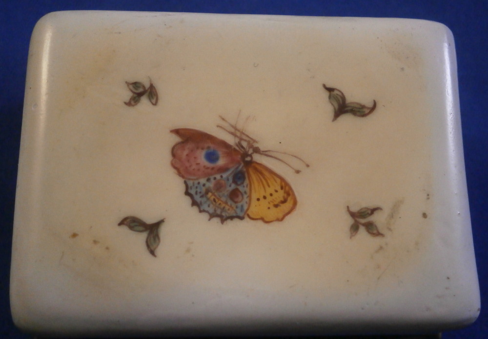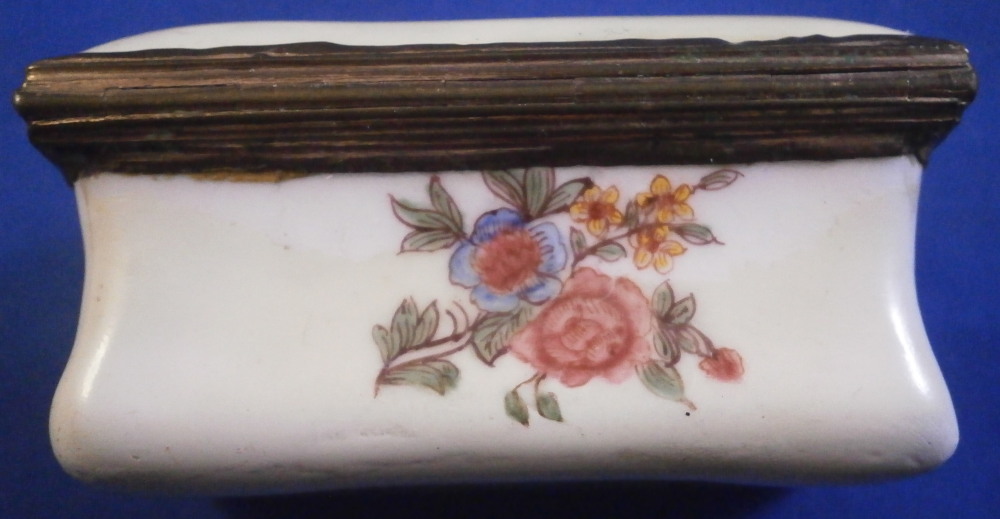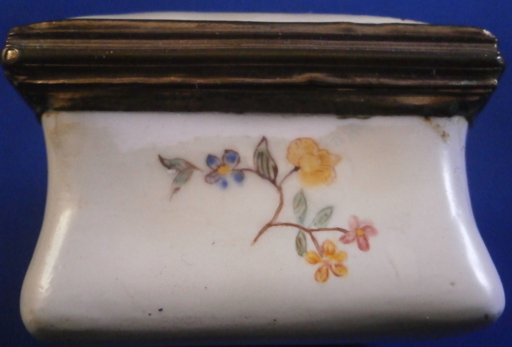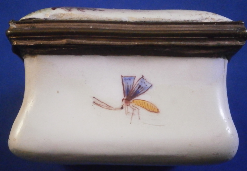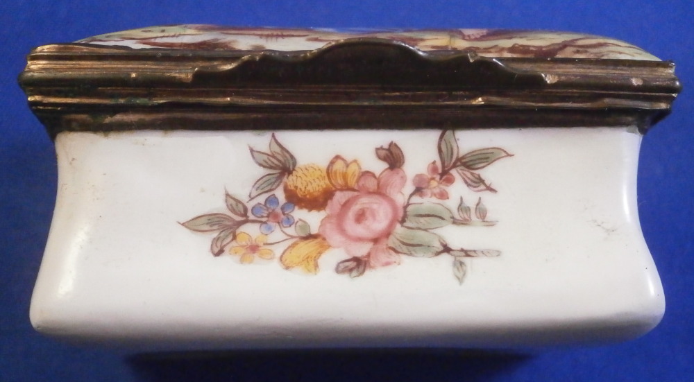 This is a small box made in England - probably in the South Staffordshire region - in the late 18th century. Probably in the Bilston area or possibly Birmingham or even London but definitely English from the 1700s. They are famous for their Battersea enamel boxes, etc. Not sure if this would be considered a patch box or tabatiere / snuff / pill box but either way it is a fun piece! Smaller than many one sees. The box is hand painted with a nice scene to the top of a gentleman next to a semi nude lady in a landscape surrounding. The sides have floral arrangements to the front and back, a small flower to one side and a bug to the other. The underside has another bug as well as some single leaves. Nice quality painting! The metal mounts are probably brass or gilded copper. They close nicely! The box displays nicely but has some of the usual cracks to the enamel and probably had some missing pieces of enamel as well though it is hard to tell as it has been restored. The top and underside for sure as they ahve yellowed from age. There is evidence of over painting to the sides though I think that was mostly done to match the to and bottom. The inside has been over painted as well though you still see the cracks and again some was probably done jsut to amtch the rest of the piece. All in all it displays very well and the yellowing kind of blends in and looks nice. All in all a great example! The box is 1.125 inches tall, 2.125 inches wide and 1.5 inches deep. Please email me for more information or other pictures.