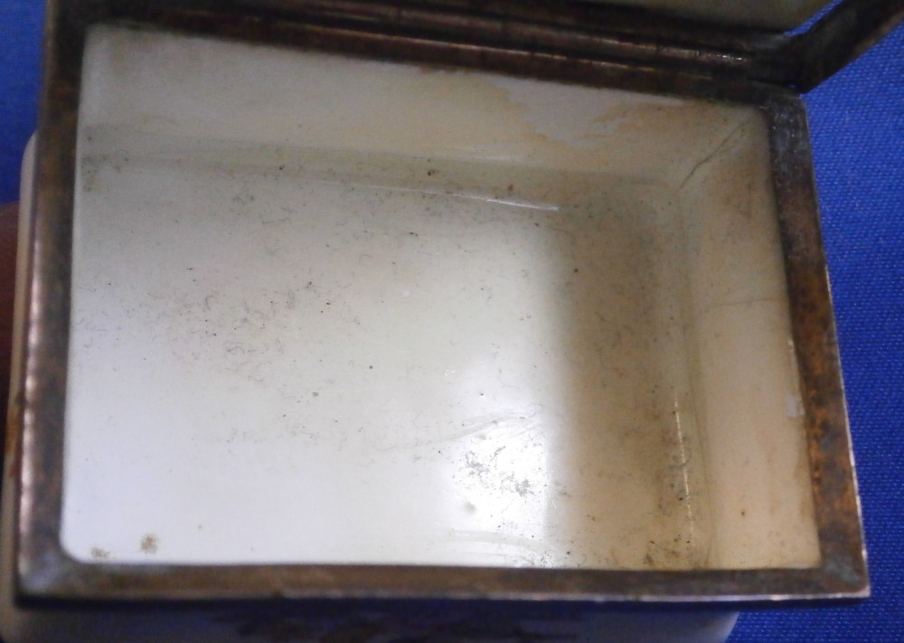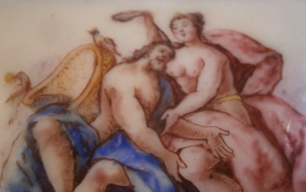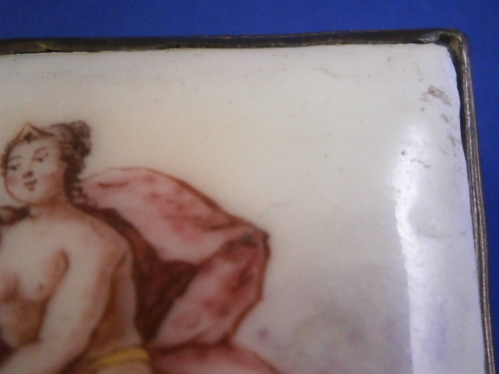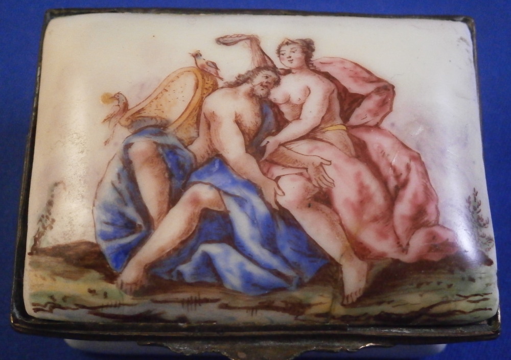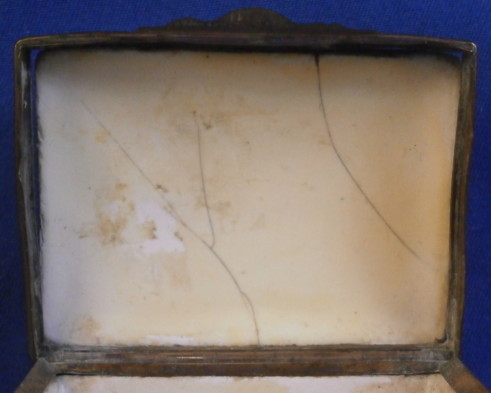 This is a small box made in England - probably in the South Staffordshire region - in the late 18th century. Probably in the Bilston area or possibly Birmingham or even London but definitely English from the 1700s. They are famous for their Battersea enamel boxes, etc. Not sure if this would be considered a patch box or tabatiere / snuff / pill box but either way it is a fun piece! Smaller than many one sees. The box is hand painted with a nice scene to the top of a gentleman next to a semi nude lady in a landscape surrounding. The sides have floral arrangements to the front and back, a small flower to one side and a bug to the other. The underside has another bug as well as some single leaves. Nice quality painting! The metal mounts are probably brass or gilded copper. They close nicely! The box displays nicely but has some of the usual cracks to the enamel and probably had some missing pieces of enamel as well though it is hard to tell as it has been restored. The top and underside for sure as they ahve yellowed from age. There is evidence of over painting to the sides though I think that was mostly done to match the to and bottom. The inside has been over painted as well though you still see the cracks and again some was probably done jsut to amtch the rest of the piece. All in all it displays very well and the yellowing kind of blends in and looks nice. All in all a great example! The box is 1.125 inches tall, 2.125 inches wide and 1.5 inches deep. Please email me for more information or other pictures.