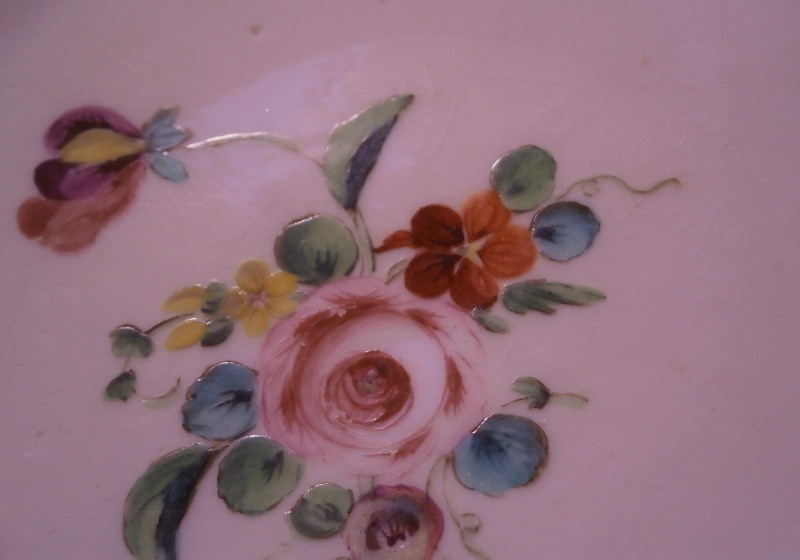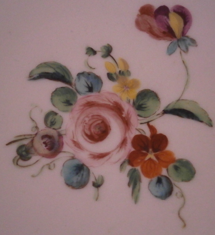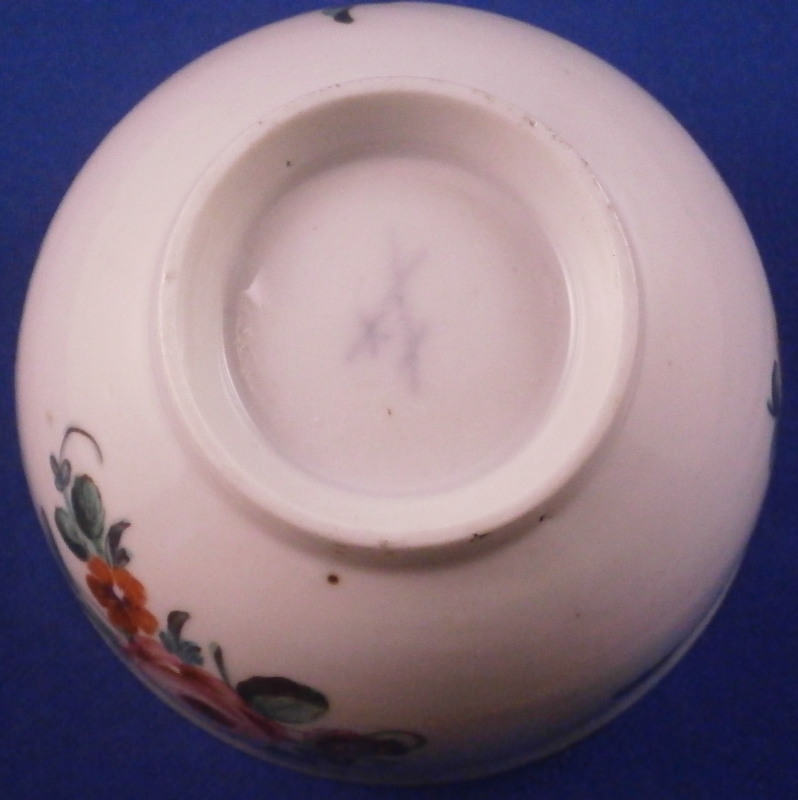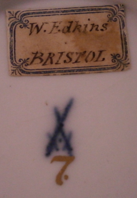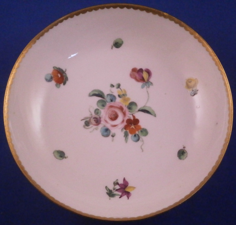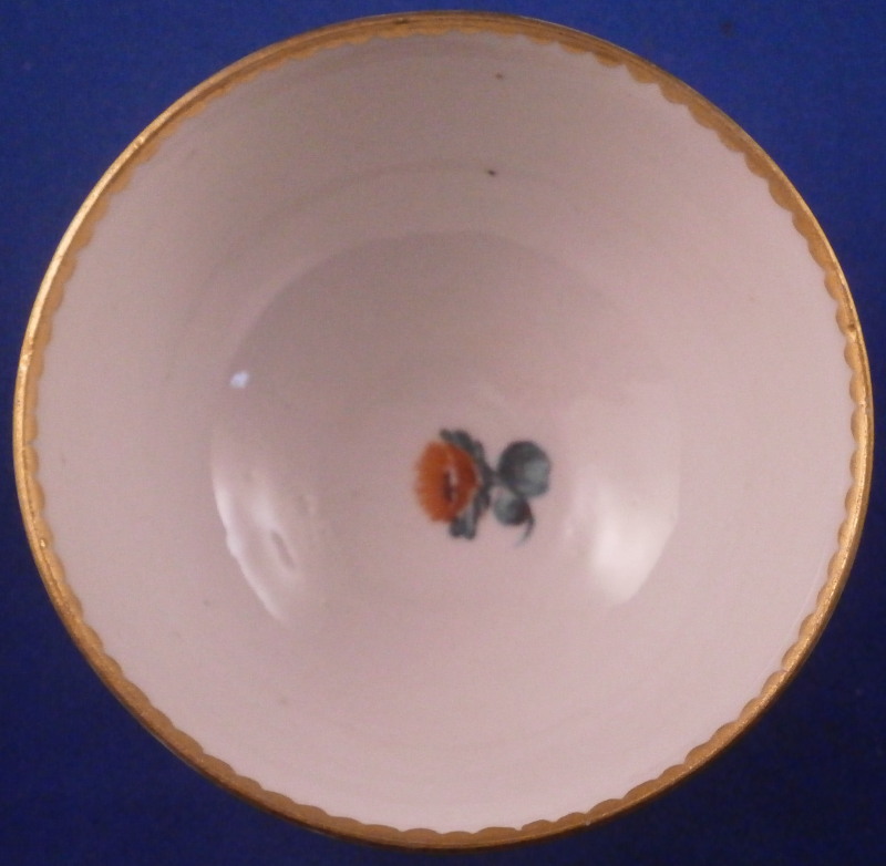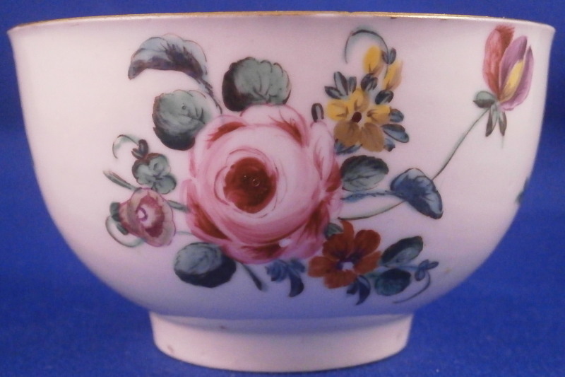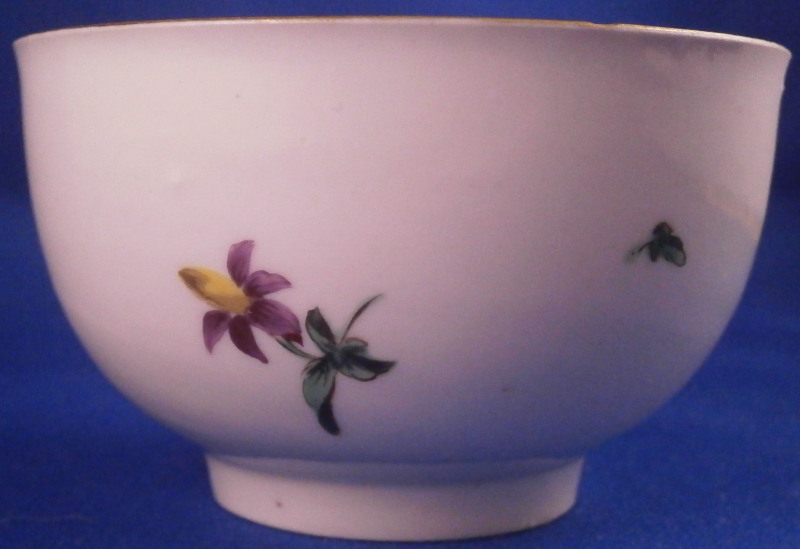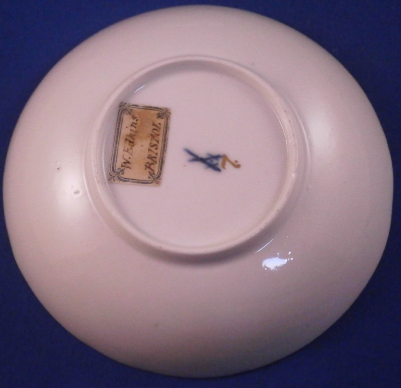 This is a rare teabowl shaped cup and saucer made by Bristol in about 1772. W. Cookworthy founded Plymouth around 1768 but soon after moved the factory to Bristol (around 1770) where he continued to make hard paste porcelain with the help of Richard Champion. Champion bought the factory from him around 1773. He sold the factory in 1781 after which it was closed. Their wares are really nice and hard paste is unusual for early English porcelain! This cup and saucer are hand painted with a nice large floral arrangement as well as some smaller ones and just a few green leaves. The rim has a nice gold trim (the cup has the same trim as the saucer just on the top inside!). Both pieces are in superb condition - the rim ofthe saucer has two chips that happened when it was made and is gilded over as shown. The saucer also ahs a touch of crazing which are fines lines in the glaze but they do not go through to the other side and are not!! hairlines. They are hard to spot on top but there is a single line to the undersidenear the mark as shown. Again not considered damage just part of the early porcelain. They are both marked with a rare blue crossed swords with a dot after Meissen as shown. There is also a gold 7. under the saucer as well as a very old label from a famous collection of the 19th century. The cup is 1.875 inches tall and 3.125 inches in diameter. The saucer is 1.125 inches tall and 5.125 inches in diameter. Please email me for more information or other pictures.