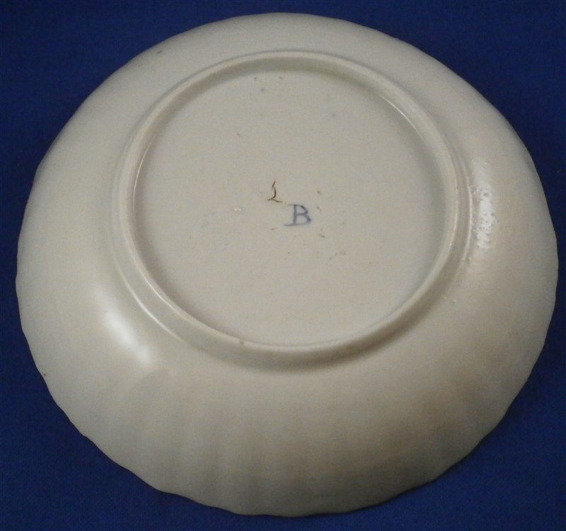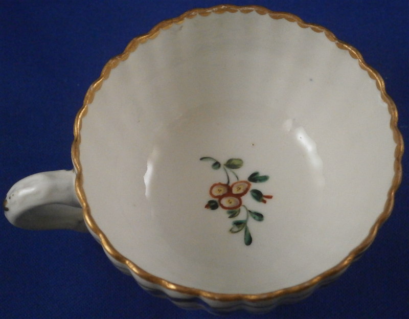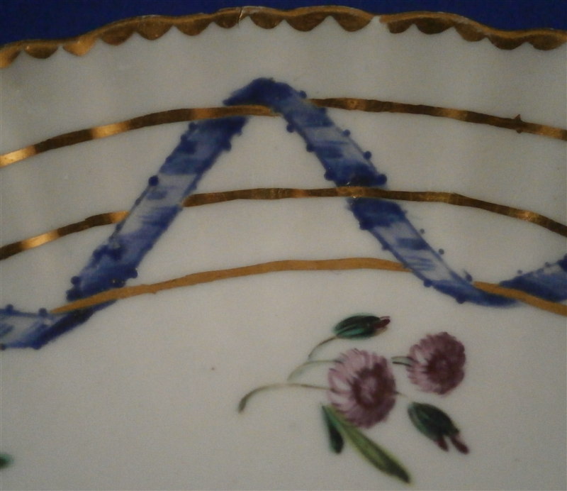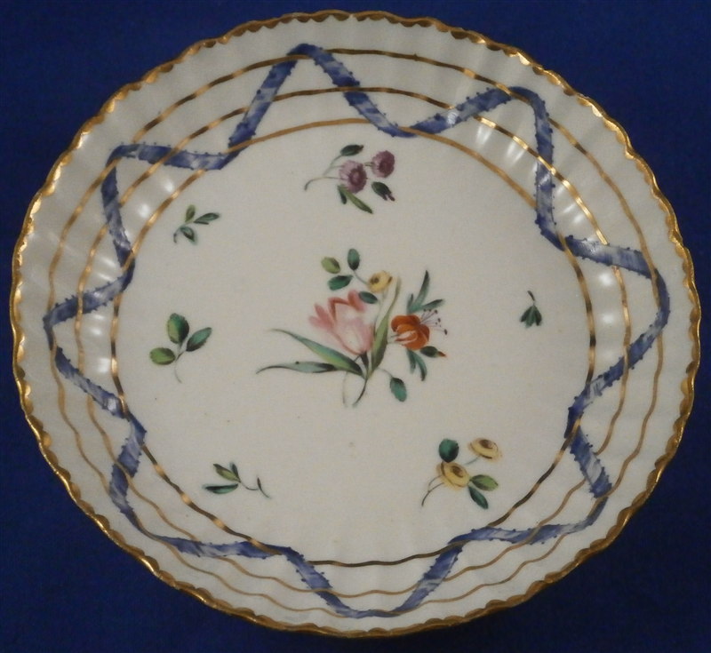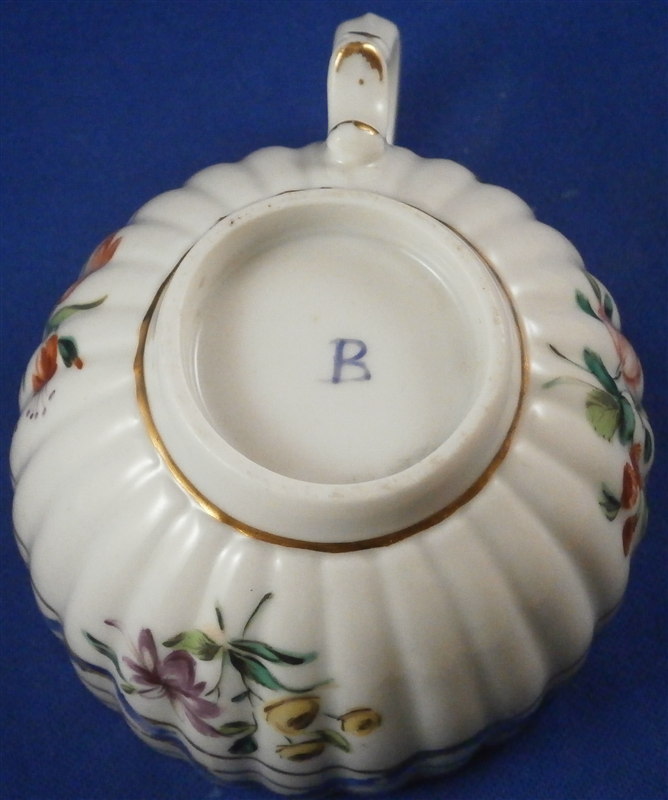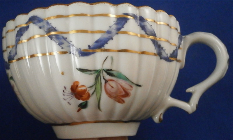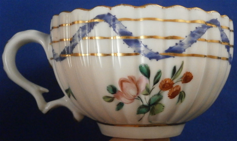 This is superb cup and saucer made by Bristol in about 1772. W. Cookworthy founded Plymouth around 1768 but soon after moved the factory to Bristol (around 1770) where he continued to make hard paste porcelain ( the only true hard paste in England!) with the help of Richard Champion. Champion bought the factory from him around 1773. He sold the factory in 1781 after which it was closed. The porcelain from this factory has always been very popular with the collectors due to the rarity of their pieces as well as their designs. This set comes from the Nelson service named after the Countess Nelson who owned the service in the 19th century. The cup and saucer are hand painted with a fun blue ribbon that winds itself around some nice gold trim with flowers to the center of the saucer as well as around the cup and inside of the cup as shown. Nice fluted shape and a superb handle shape typical to Bristol porcelain. The set is in amazing condition and it displays perfectly. The saucer has a few minor tiny chips to the outside edge as shown and a firing flaw to the underside center that does not affect the top. Both pieces are marked with their blue B mark as shown. The cup is just under 2 inches tall and 3 inches in diameter. The saucer is 1 inch tall and 5.25 inches in diameter. Please email me for more information or other pictures.