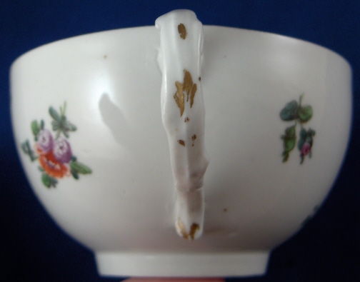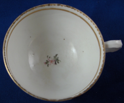 This is a rare tea cup and saucer made by Bristol in about 1772. W. Cookworthy founded Plymouth around 1768 but soon after moved the factory to Bristol (around 1770) where he continued to make hard paste porcelain with the help of Richard Champion. Champion bought the factory from him around 1773. He sold the factory in 1781 after which it was closed. This cup and saucer are handpainted with some nice large floral arrangements as well as some smaller flowers and leaves. There is also some nice gold trim as shown. Both pieces are in great condition with a mini chip to the saucer rim, two small firing cracks in the handle opposite of each other but they do not meet and some of the edge gilding was repainted by someone which isn't perfect but could be removed easily if desired. The flower on the bottom inside of the cup is worn from use. Neither one is marked which is not uncommon but they are definitely by Bristol and have an old reputable dealer sticker underneath from London. The cup is 1.875 inches tall and 3.375 inches in diameter. The saucer is 1.125 inches tall and 5 inches in diameter. Please email me for more information or other pictures.