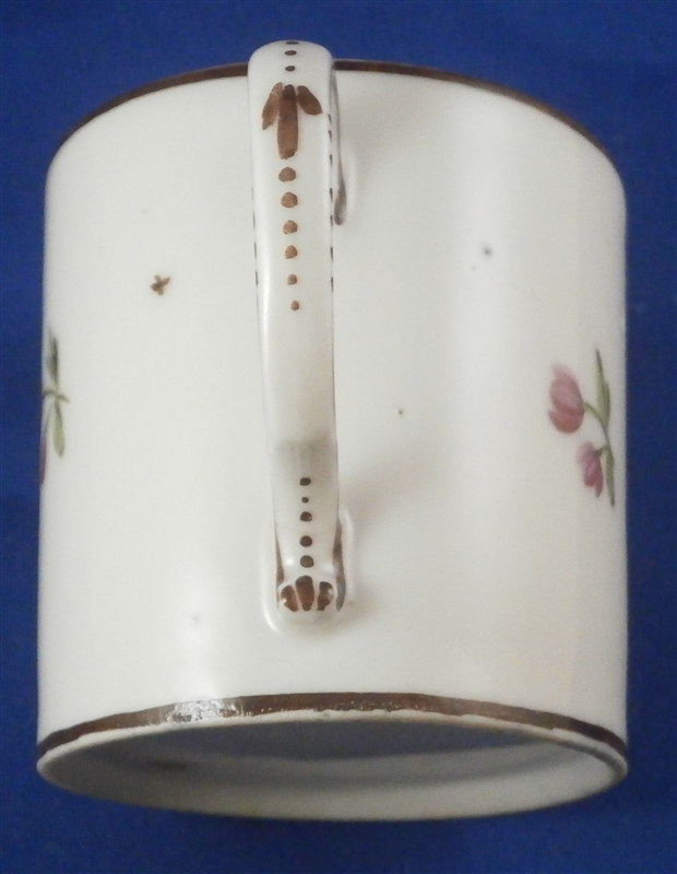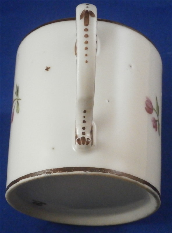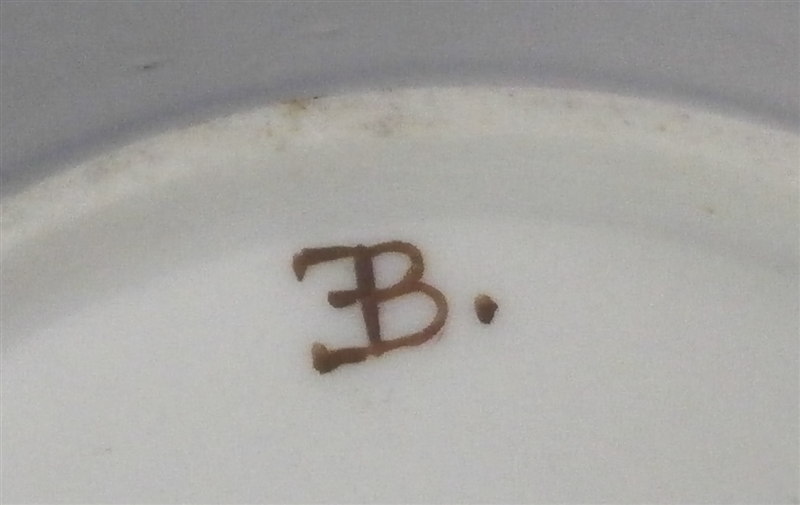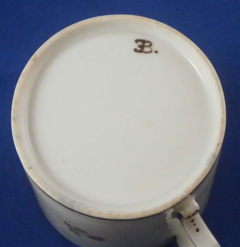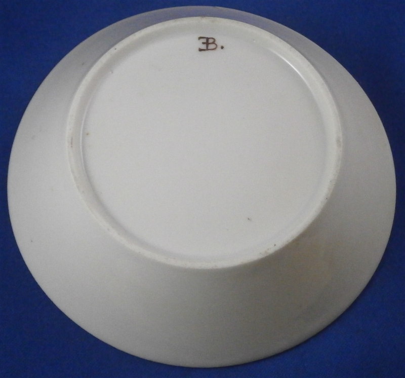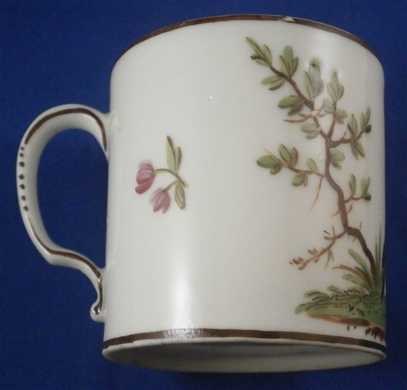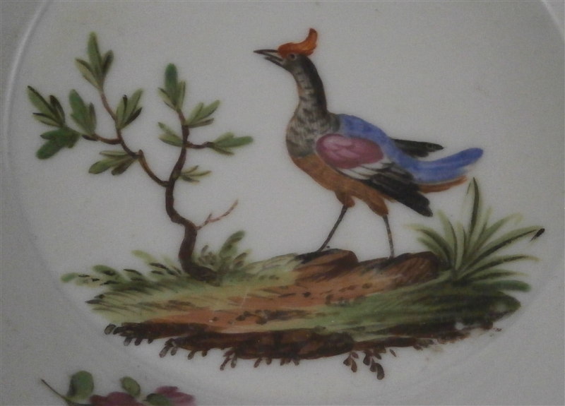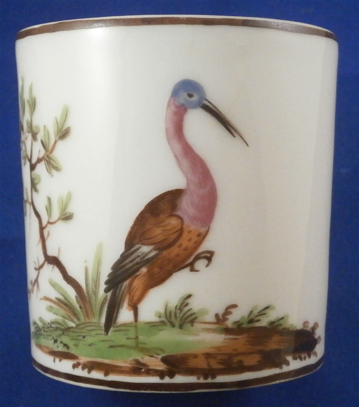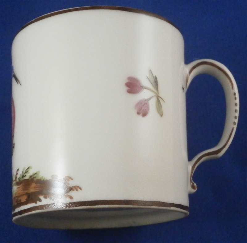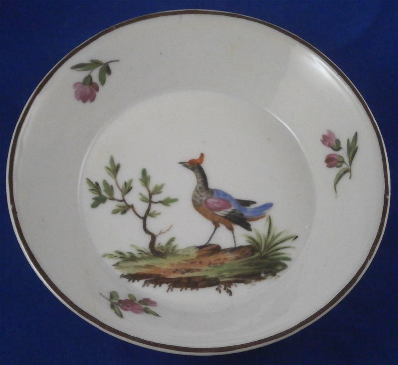 This is a rare treat made by a porcelain maker in Etterbeek near Brussels around 1790. Etterbeek was founded in 1787 by Chretien Kuhne who was German and they existed until about 1803 so not very long at all. The pieces were made in the French style. This cup and saucer here is a very nice example of their work and of superb quality. Both pieces are nicely handpainted with a bird scene as well as some scattered flowers and a brown trim. The set is in great condition with a small missing paint spot on the top rim of the cup from the making and the bottom part of the handle has a crack in it which is a pretty common thing to find on these antique cups. The saucer has a firing crack type flaw on the rim as shown but it's not a crack more of an almost crack that sealed itself suring the firing process. Doesn't take away from the piece at all! The set is marked underneath with their first mark of a connected EB. mark in brown. The cup is 2.625 inches tall and 2.5 inches in diameter. The saucer is 1.25 inches tall and 5.25 inches in diameter. Please email me for more information or other pictures.
