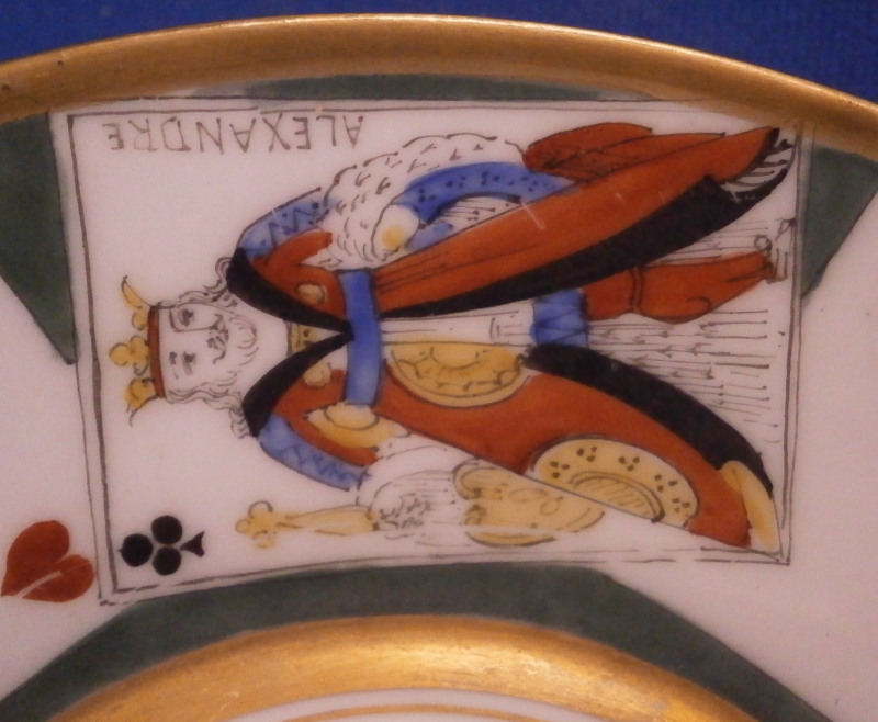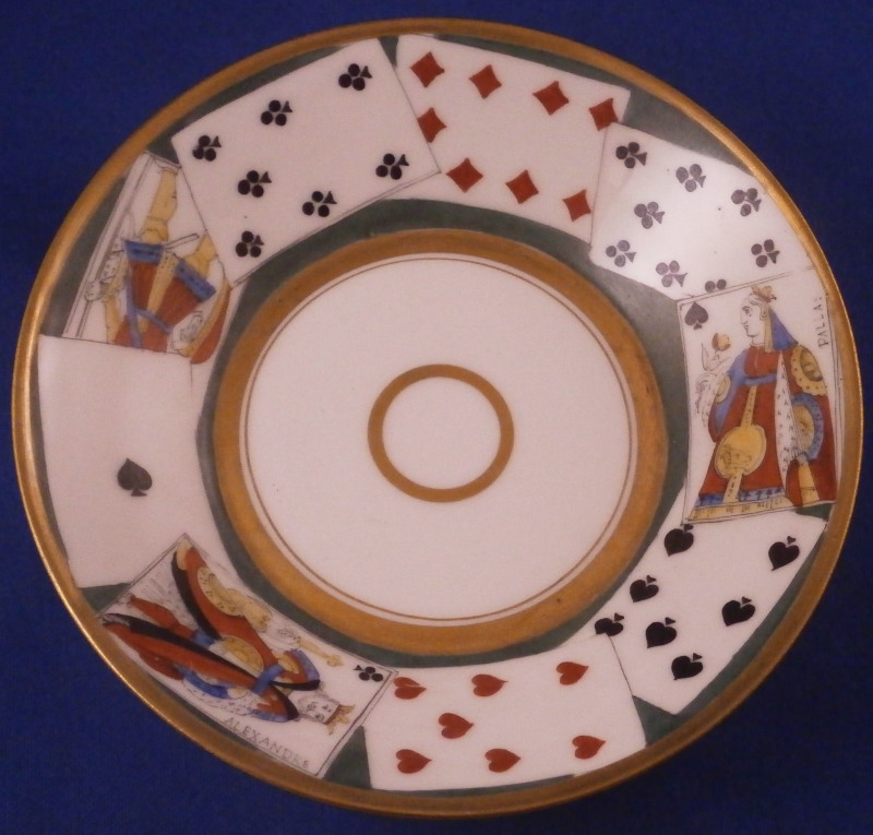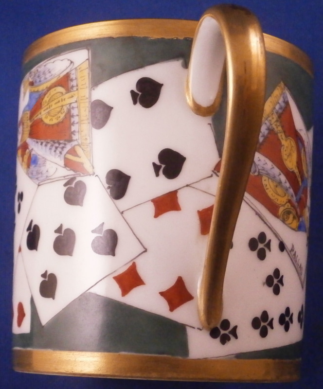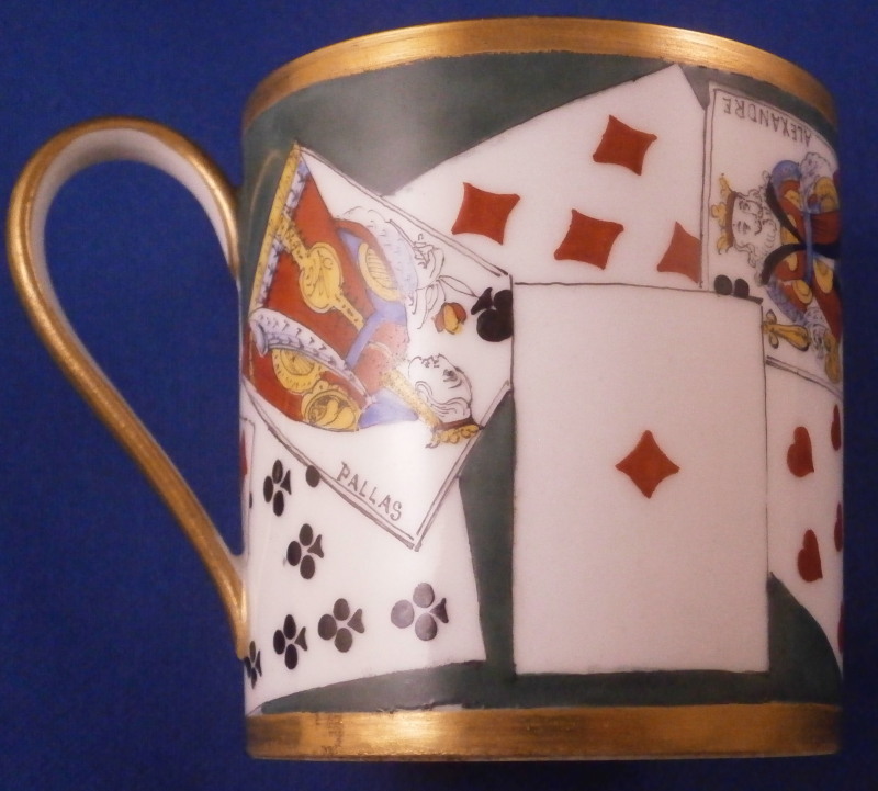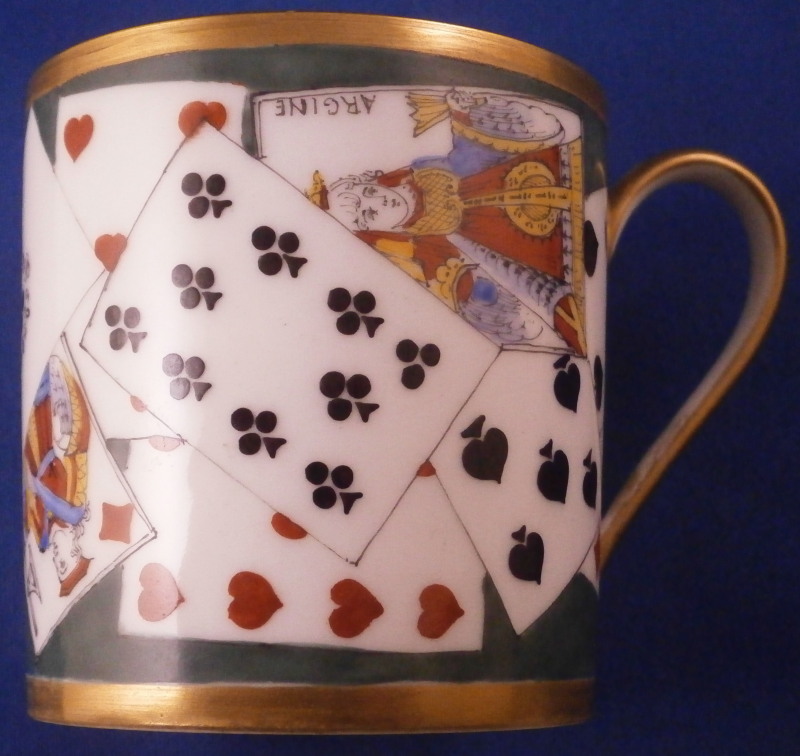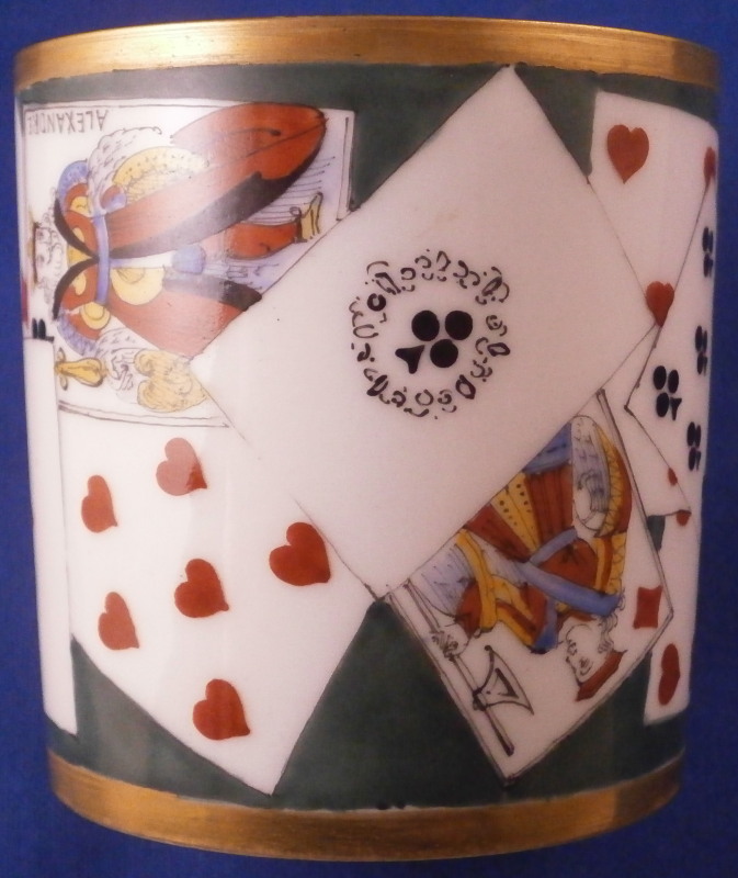 This is a rare treat made by the porcelain maker in Etterbeek near Brussels around 1790. Etterbeek was founded in 1787 by Chretien Kuhne who was German and they existed until about 1803 so not very long at all. The pieces were made in the French style. This cup and saucer here is a very nice example of their work and of superb quality. Probably the nicest piece that I ahve ever seen decorated with playing cards! Both pieces are nicely hand painted with lots of playing cards in different suits all over including some face cards which are fully hand painted not half transfer as one sees on most playing card decorated pieces. One face card is labeled Alexandre likely after Alexander the Great, another one Pallas after the Titan god of battle and the last Argine which is derived from Latin for Queen I believe. The rest of the set has a pleasant green ground and lots of gilding to it. The set is in perfect condition with some very minor wear if any at all. As nice as they come! The set is marked underneath with their first mark of a connected EB in red as shown. The cup is 2.5 inches tall and 2.5 inches in diameter. The saucer is 1.125 inches tall and 5.125 inches in diameter. Please email me for more information or other pictures.
