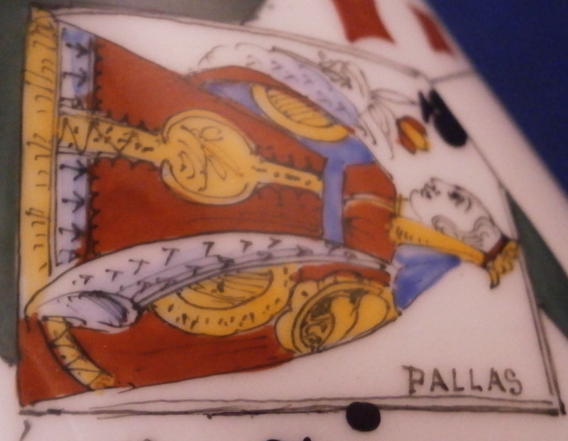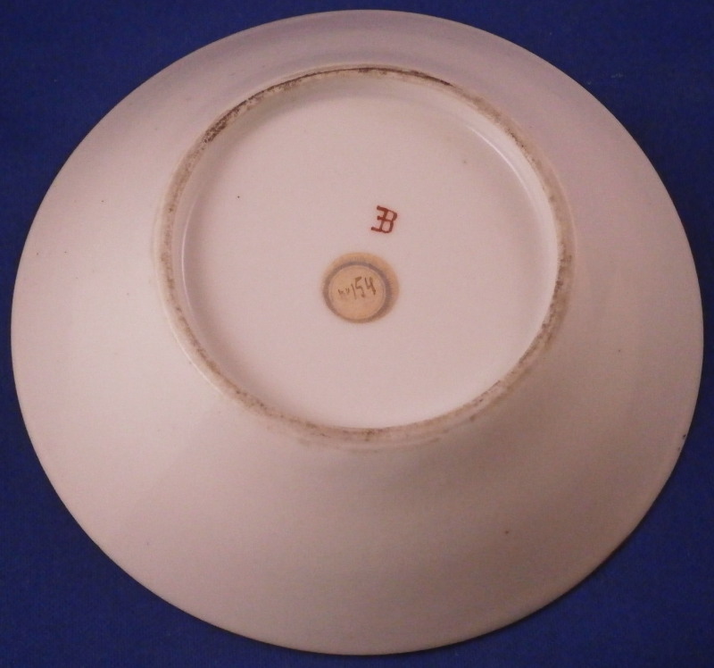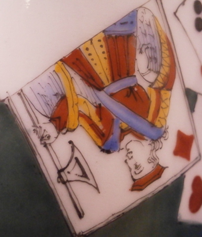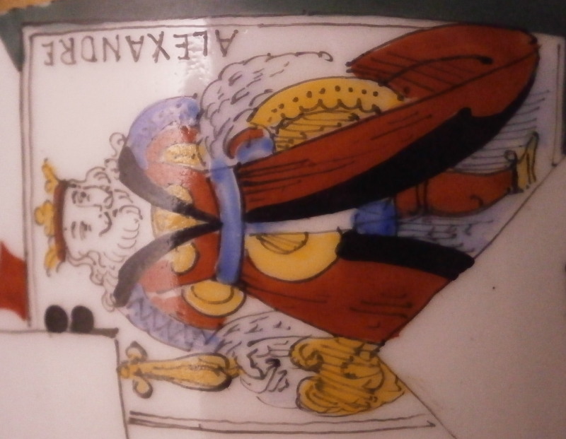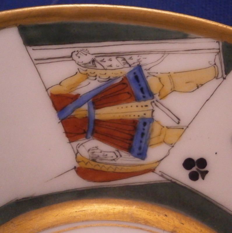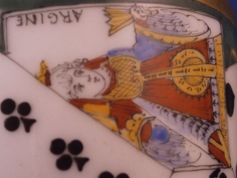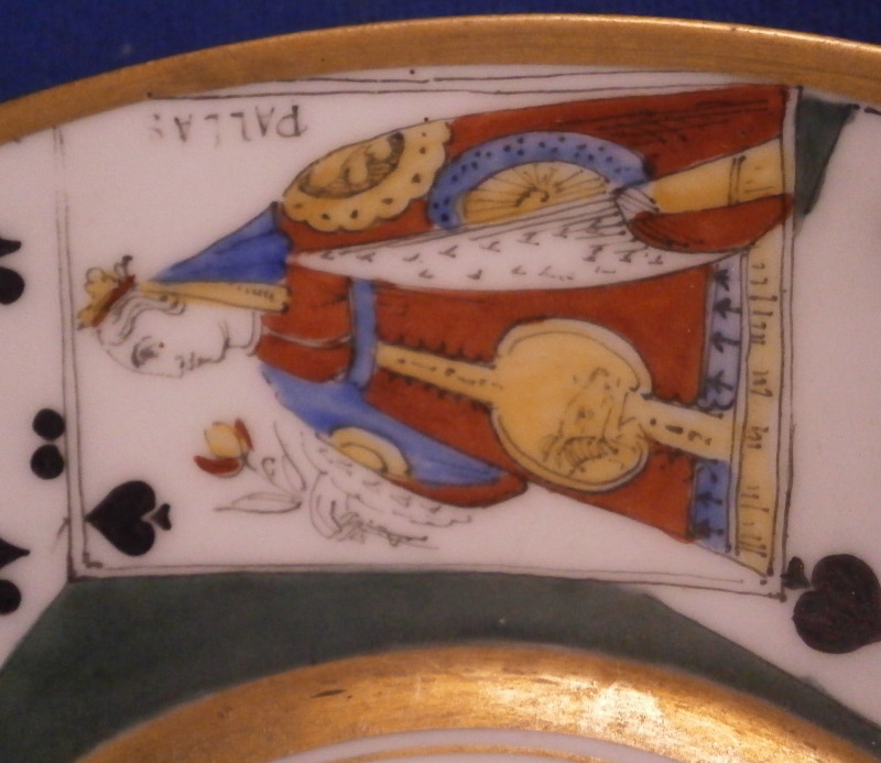 This is a rare treat made by the porcelain maker in Etterbeek near Brussels around 1790. Etterbeek was founded in 1787 by Chretien Kuhne who was German and they existed until about 1803 so not very long at all. The pieces were made in the French style. This cup and saucer here is a very nice example of their work and of superb quality. Probably the nicest piece that I ahve ever seen decorated with playing cards! Both pieces are nicely hand painted with lots of playing cards in different suits all over including some face cards which are fully hand painted not half transfer as one sees on most playing card decorated pieces. One face card is labeled Alexandre likely after Alexander the Great, another one Pallas after the Titan god of battle and the last Argine which is derived from Latin for Queen I believe. The rest of the set has a pleasant green ground and lots of gilding to it. The set is in perfect condition with some very minor wear if any at all. As nice as they come! The set is marked underneath with their first mark of a connected EB in red as shown. The cup is 2.5 inches tall and 2.5 inches in diameter. The saucer is 1.125 inches tall and 5.125 inches in diameter. Please email me for more information or other pictures.