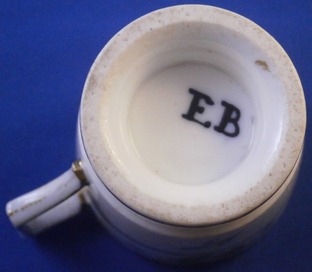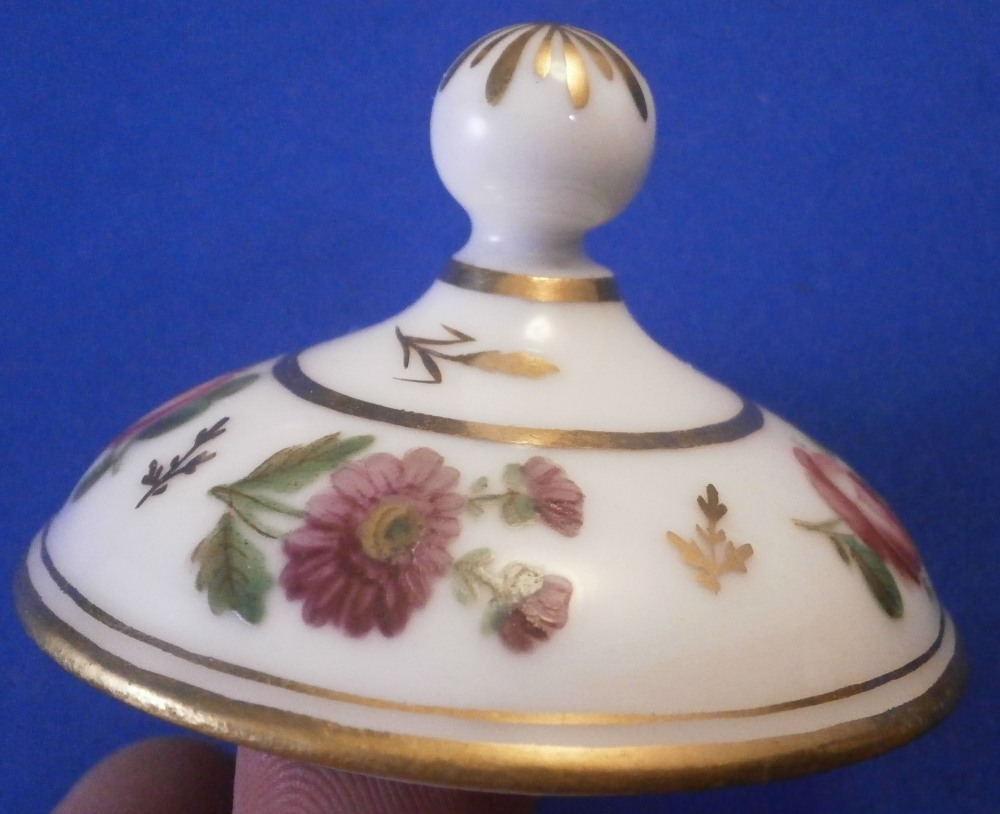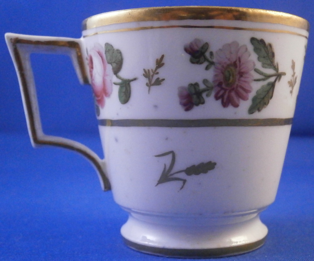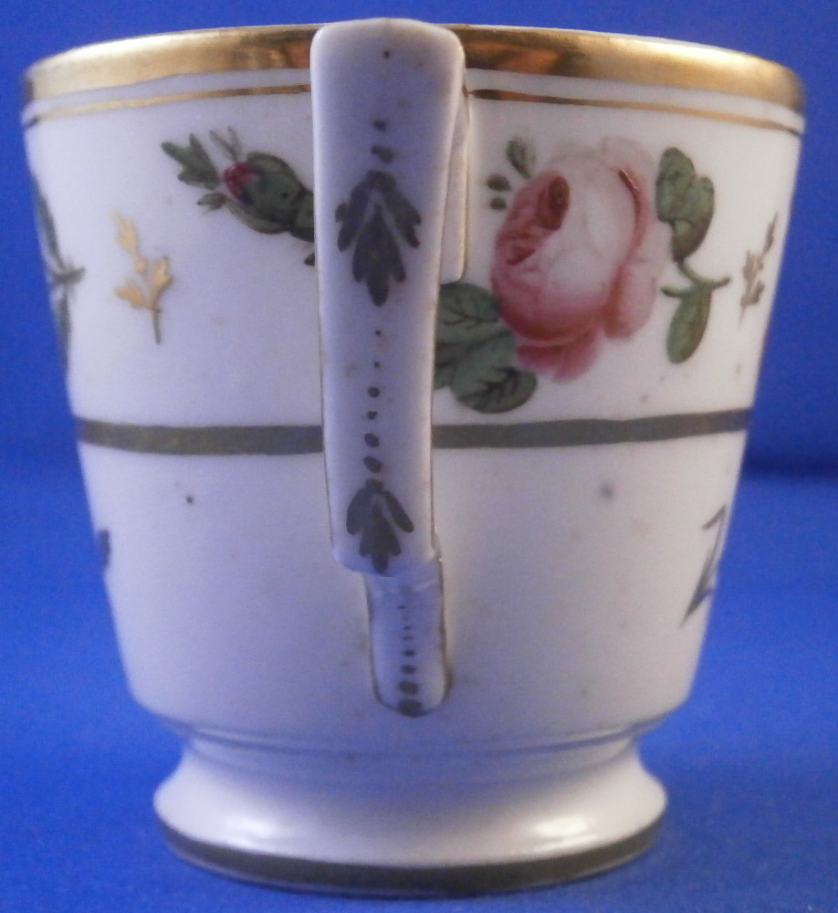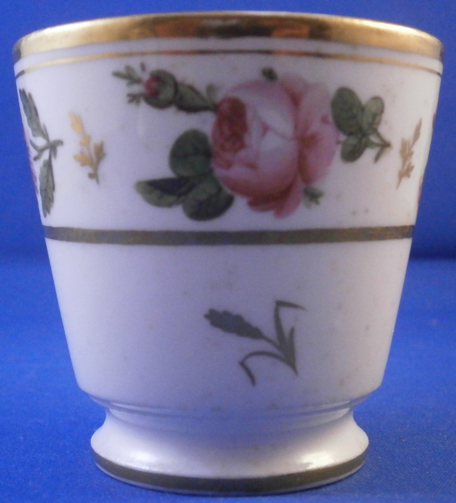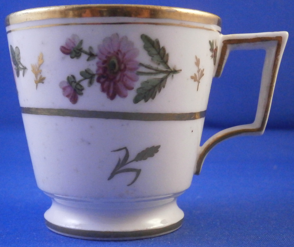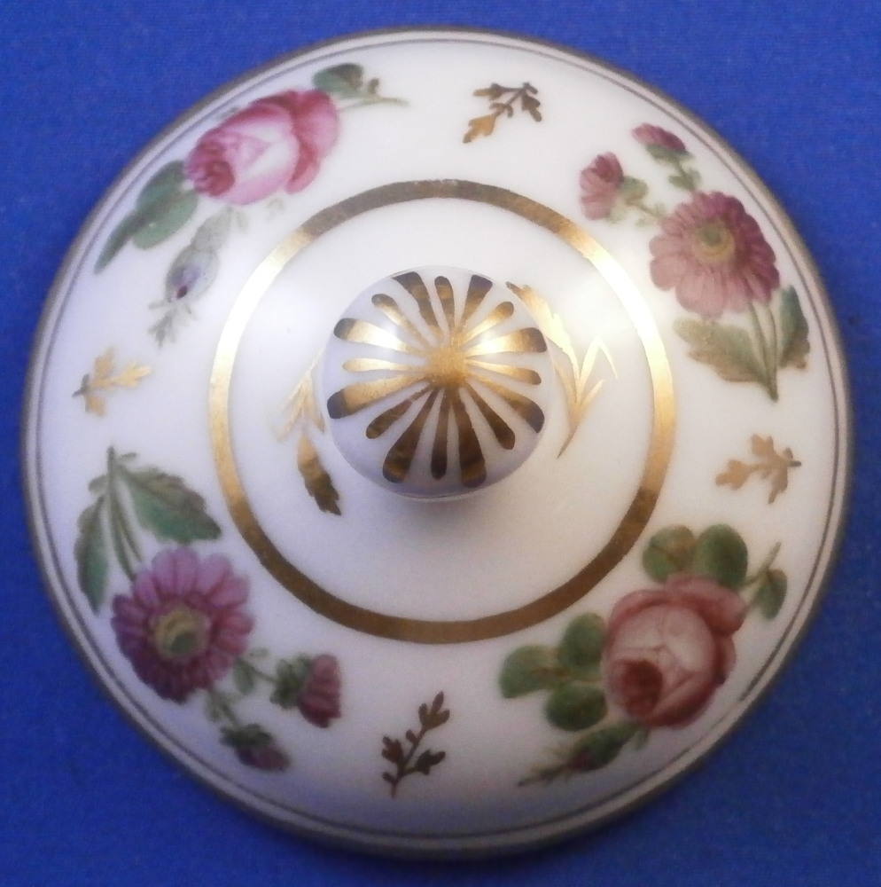 This is a rare treat made by a porcelain maker in Etterbeek near Brussels around 1790. Etterbeek was founded in 1787 by Chretien Kuhne who was German and they existed until about 1803 so not very long at all. Quite rare and all the pieces were made in the French style. This pot de creme or pot au jus here is a very nice example of their work and of nice quality. These lidded cups were used for hot chocolate or soup broth. Both pieces are nicely hand painted with flowers all around as well as lots of gilding. Typical handle shape for the period also highlighted with gilding. The set is in great condition with almost no wear at all but there are some firing flaws in the form of tiny black spots and a bit of staining to the isnide of the cup. A nice example and very rare! It displays perfectly. The cup is marked underneath with a connected EB mark in under glaze blue as shown. The cup with the lid in place is 4 inches tall and 2.625 inches in diameter. The cup itself is 2.375 inches tall. Please email me for more information or other pictures.