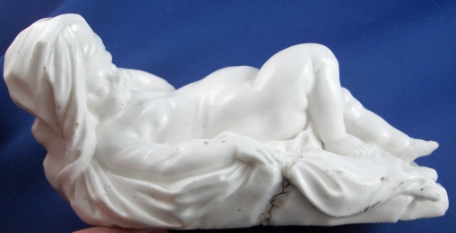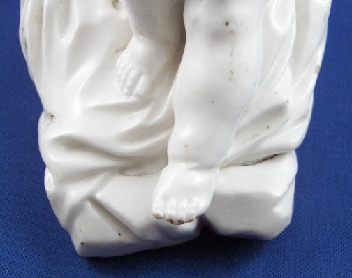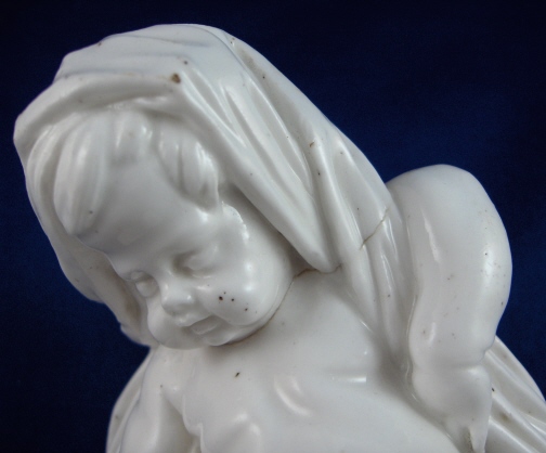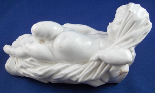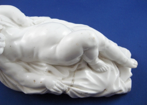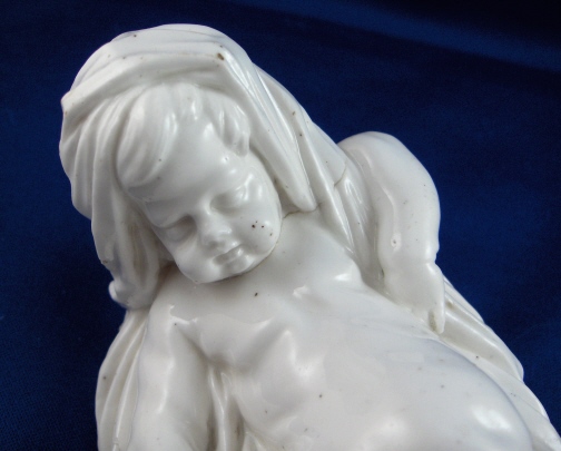 This is a figurine made by Vincennes around 1750. It is one of a group of figures modelled after the Flemish sculptor Francois Duquesnoy (aka Le Flamand) and that are entitled 'Les Enfants Francois'. It is of baby or child sleeping peacefully. A very rare and decorative figurine. All in white softpaste porcelain with lots of detail. The figurine is in superb condition for the age with no restorations or chips but it does have manufacturing flaws like black firing specs and firing cracks one of which was filled at during the making. The figure is unmarked which is typical of Vincennes figures during this time period and is 3.125 inches tall, 3.125 inches wide and 6.375 inches long. Please email me for more information or other pictures.