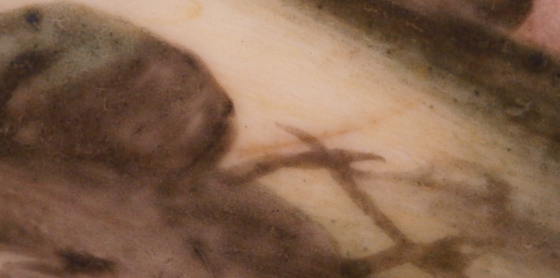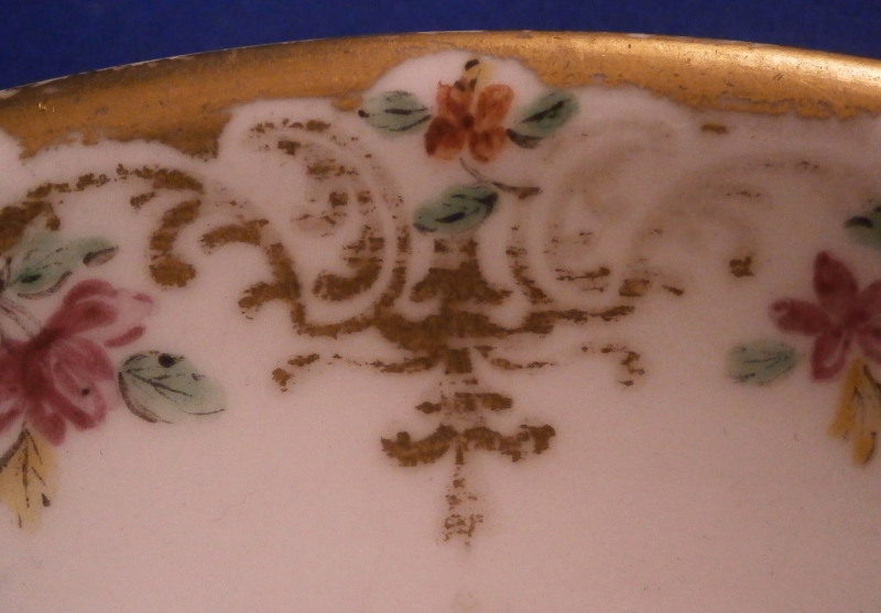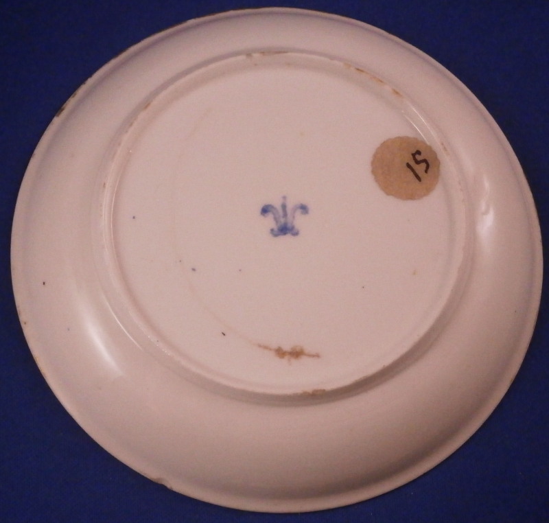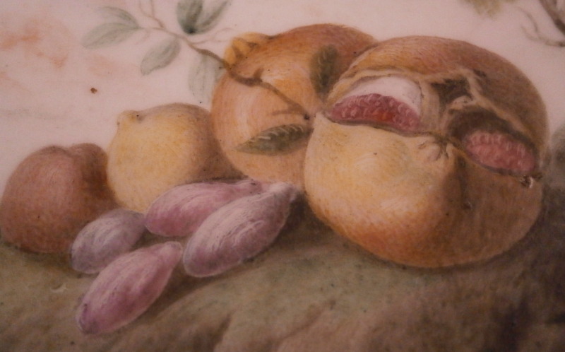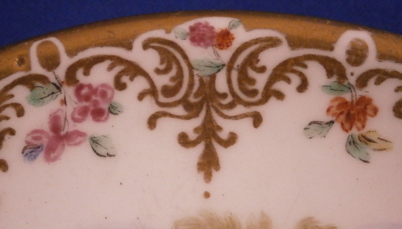 This is a very rare and superb saucer made by Capodimonte in about 1750. It is made of soft paste porcelain and has a hand painted baroque fruit scene to the center. These scenes are known as natura morta and are often associated with the painter Giovanni Caselli and it looks like he painted this saucer as well. The scene is of native Neapolitan fruit on a naturalistic grassy base surrounded by clouds with the edge of the saucer decorated with an elaborate gilt strapwork border with some nice polychrome flowers as part of the trim. Capodimonte porcelain from this period is exceedingly rare and a cup and saucer from this rare service in good condition goes for around 6K. The piece is 0.75 inches tall and has a diameter of 5.25 inches. It is marked underneath with the blue fleur de lis mark of Capo di Monte which is not something you see often at all! These are often messy and this one here is barely decipherable as a fleur de lis but it is a nice clear example here. The piece is in great condition with some wear to the gold trim especially in one spot as shown and there is a stained hairline as shown which can be seen from the underside but does not show when on display from the top and is hard to spot unless you really look for it from that side. Please email me for more information or other pictures.