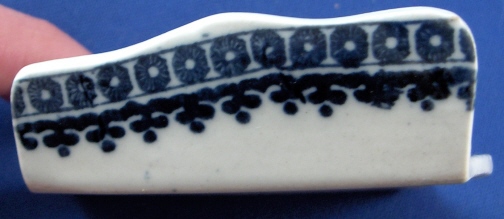 This is a rare asparagus server made by Caughley around 1780. It is superbly decorated with the printed fisherman pattern in underglaze blue and has a nice shape to it as well. The piece is in perfect condition. The piece is 1 inch tall, 3 inches long and 3.125 inches wide on one end and 2.25 inches wide on the other end. It is not marked underneath which is not uncommon for Caughley pieces. Please email me for more information or other pictures.