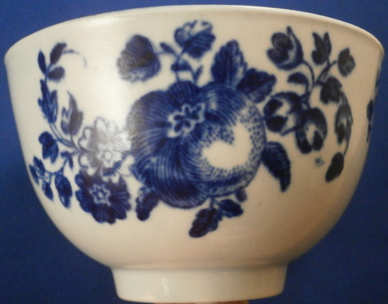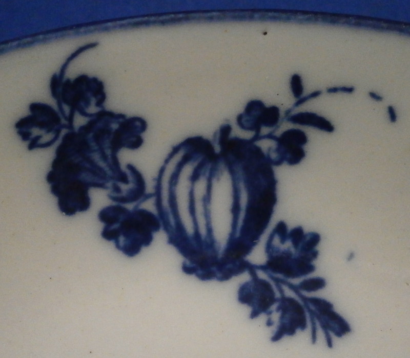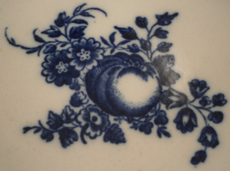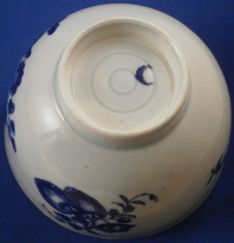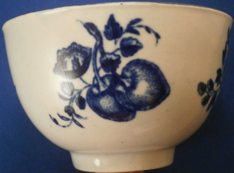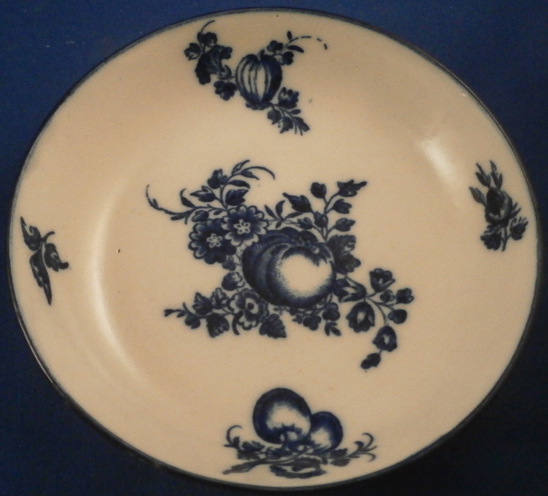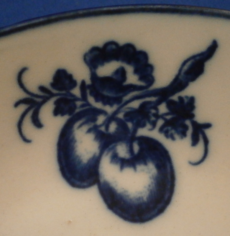 This is a tea bowl style cup and saucer made by Caughley in the 18th century. Both pieces are decorated in under glaze blue with a fruit scene pattern - I have seen this being called the Sliced Apple as well as the Apple and Damson pattern. Either way the two piece look superb with the deep blue decoration of flowers and fruits with a blue trim to the edge. The set is in perfect condition which is always amazing on pieces that are over 200 eyars old. The saucer is not marked but the cup has the blue crescent mark to it as shown. The cup is just over 1.875 inches tall and 3 inches in diameter. The saucer is 1.125 inches high and has a diameter of 4.75 inches. Please email me for more information or other pictures.