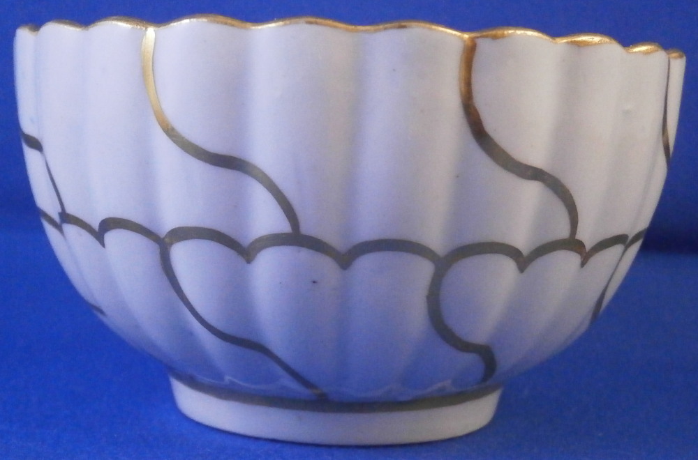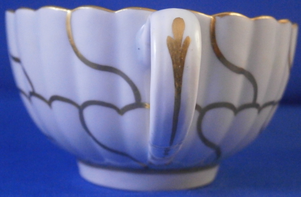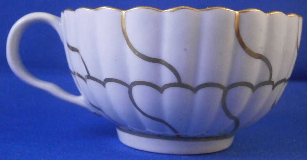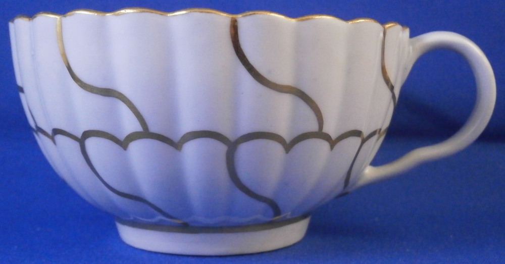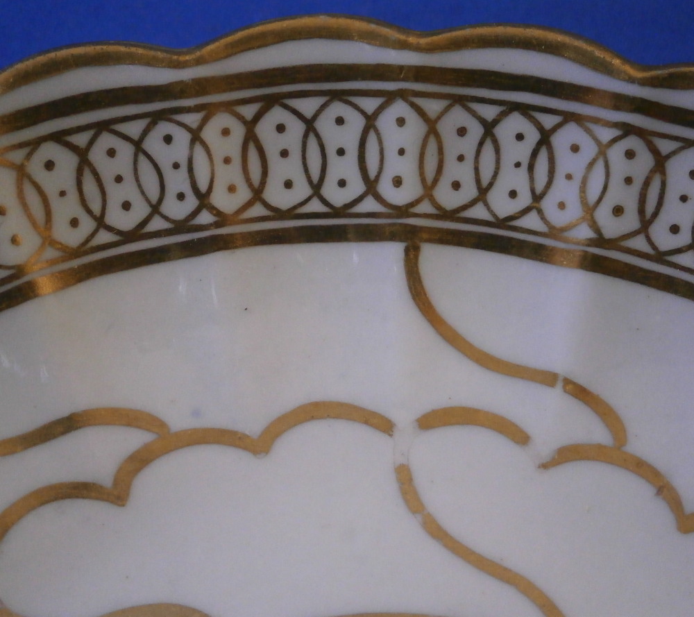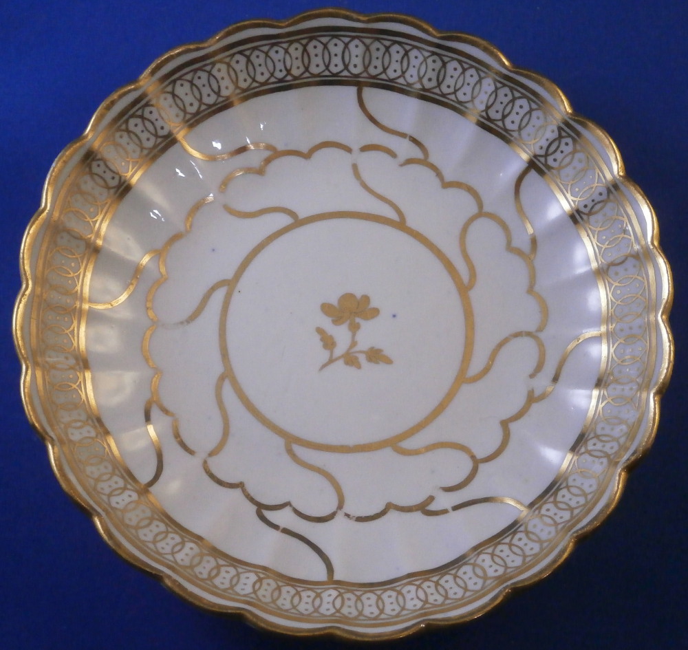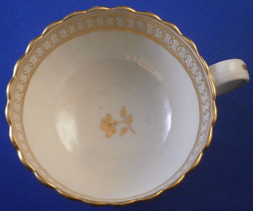 This is a really nice cup and saucer made by Caughley in the 18th century. Both pieces are decorated with the Queens pattern in gold with a flower in the center and a nice gold trim to the inside edge. Typical handle shape with a touch of gold trim. A gorgeous set and not something you see often from this maker especially in this pattern. The set is in superb condition with just some minor wear to the high points of the saucer between the well and the rim as shown. As good as they come! Neither piece is marked but that is not unusual. The cup is 1.75 inches tall and 3.25 inches in diameter. The handle sticks out 0.75 inches on the side. The saucer is 1 inch high and has a diameter of 5.5 inches. Please email me for more information or other pictures.