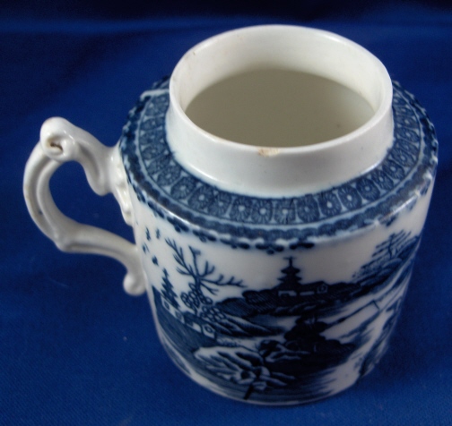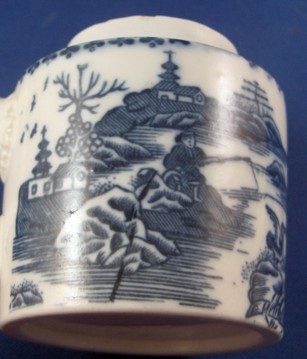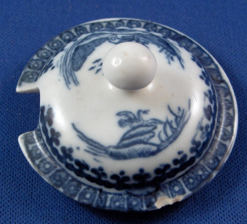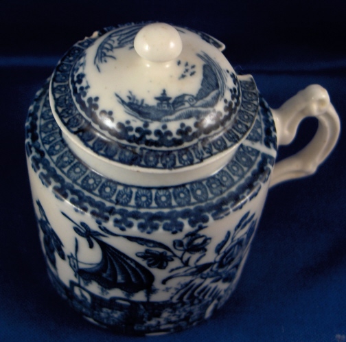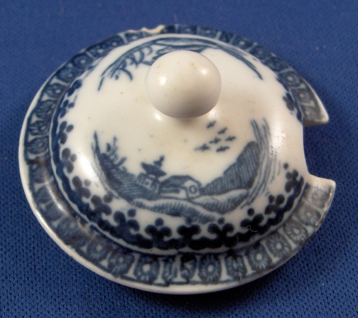 This is a nice early mustard dish with its lid made by Caughley around 1775. It is superbly decorated with an underglaze blue printed fisherman pattern and has a nicely shaped handle. An earlier version than most one sees plus it is in good condition with just two small side by side chips on the lid rim and an even smaller one on the top rim of the main body. The piece including lid is 3.25 inches tall and has a diameter of about 2.5 inches. It is marked underneath with the underglaze blue So mark. Please email me for more information or other pictures.