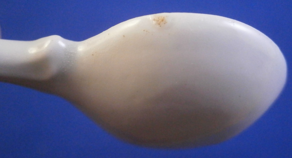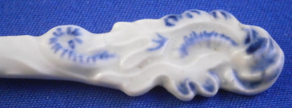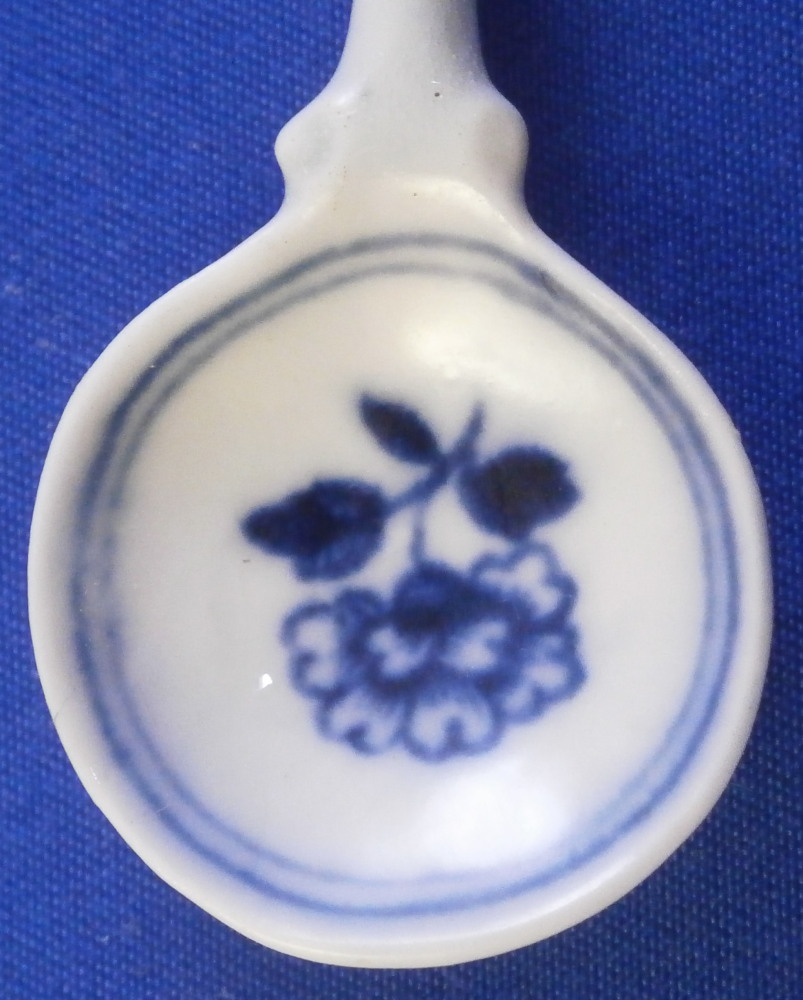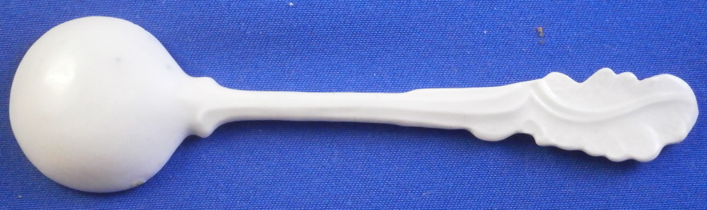 This is a rare mustard spoon made by either Caughley or Worcester around 1775. I think it is either for a Three Flowers or Mansfield pattern mustard pot. Not sure. These spoons are very hard to find and having one in perfect condition is a real treat. A very delicate piece that has a blue flower in the bowl part, a double blue line trim around the rim of the bowl and some blue trim to the end of the spoon which is nicely molded. It is in perfect condition with a tiny ground down spot to either side of the boel part where a firing support would ahve been attached. Invisible when on display. The piece is 4 inches long with the bowl part having a diameter of 1 inch. It is unmarked which is the norm. Please email me for more information or other pictures.