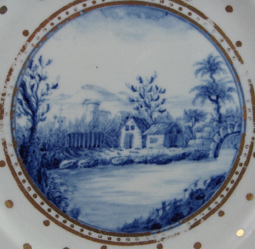 This is a plate made by Caughley in the 18th century and it is from the "Bright Landscape" service. This is a great example why Caughley is so famous for their soft paste porcelain. It is handpainted with a scene in blue and lots of super detail in gold. It is pretty rare to find handpainted pieces by Caughley so this is a very special plate. It is in great condition which just a bit of gold wear. It has the impressed Salopian mark underneath. I also have a matching plate for sale. The plate is 1.125 inches tall and 8.125 inches in diameter. Please email me for more information or other pictures.
