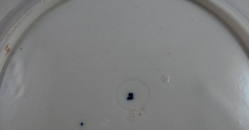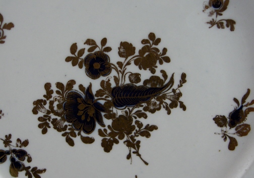 This is a plate made by Caughley in the 18th century. It is made of soft paste porcelain and handpainted with dark blue and gold flowers as well as a nice dark blue rim with a gold design on top of it. The blue has a purplish hue to it. The plate is in super condition with almost no wear. It is marked with a blue S mark for Salopian and a gold 64 on the footrim. The gold might have been applied at Worcester for this plate. Size of the plate is 1 inch tall and 8 inches in diameter. Please email me for more information or other pictures.