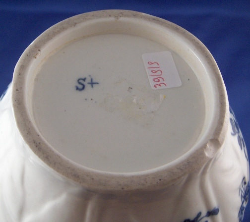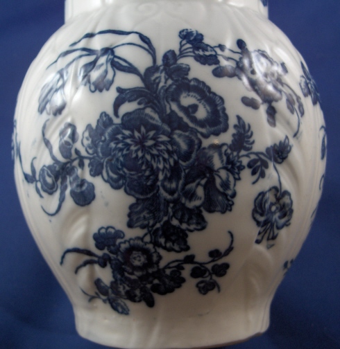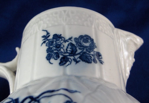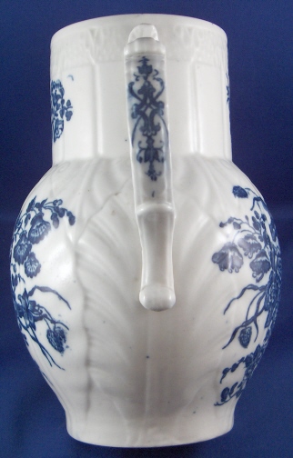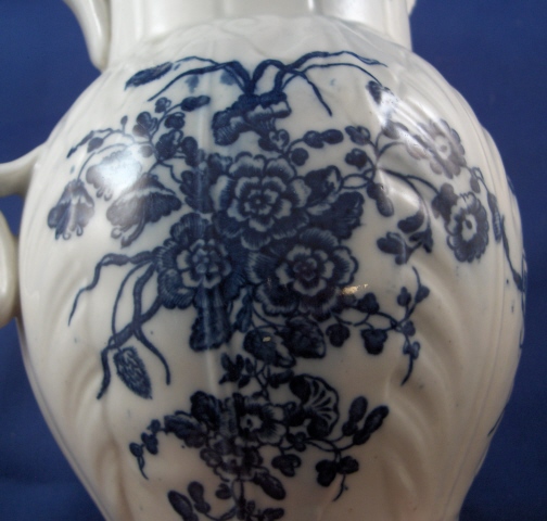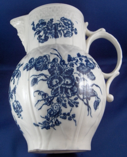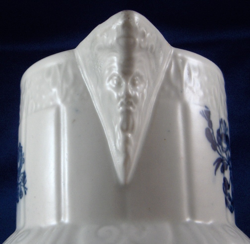 This is a nice early jug made by Caughley around 1775. It is superbly decorated with an underglaze blue printed floral design and has lots of molded detail that I believe are supposed to be cabbage leaves to it and also including the mask head spout. An earlier version than most one sees plus it is in good condition with just a mostly inside rim chip to the side of the spout and an original to the making chip to the footring. The jug is 7.5 inches tall and has a diameter of about 5 inches. It is marked underneath with the underglaze blue S+ mark. Please email me for more information or other pictures.
