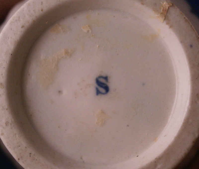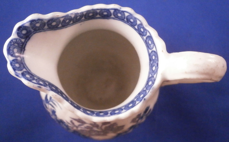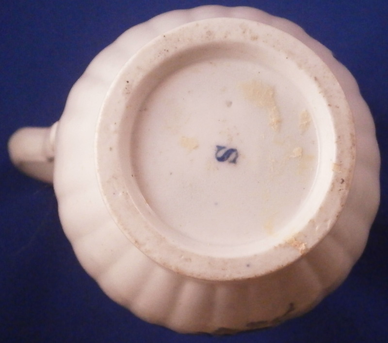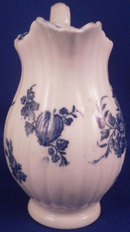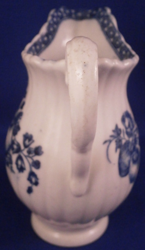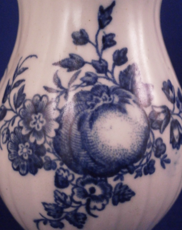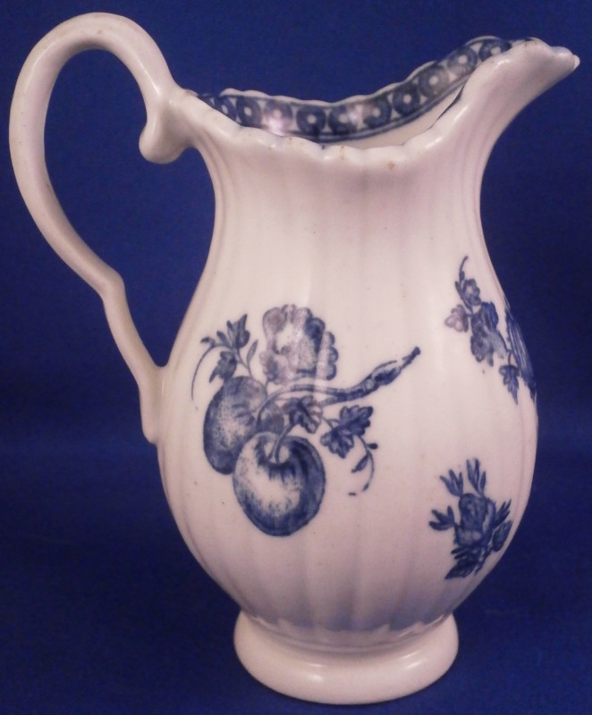 This is a superb little creamer / milk jug / small pitcher made by Caughley in the 18th century. It has a really nice shape to it with a ribbed design to the paste and is decorated in under glaze blue with a large fruit and flower arrangement on one side with smaller fruit scenes to the other side and a nice blue trim to the top inside. I have seen this pattern being called the Sliced Apple as well as the Apple and Damson pattern. Either way the piece looks superb with the deep blue decoration on white ground. The cream jug is in perfect condition which is always amazing on pieces that are over 200 years old. The piece is marked with the under glaze blue S for Salopian mark as shown. It is 3.875 inches tall, 3.25 inches from spout to handle and 2.25 inches wide. Please email me for more information or other pictures.