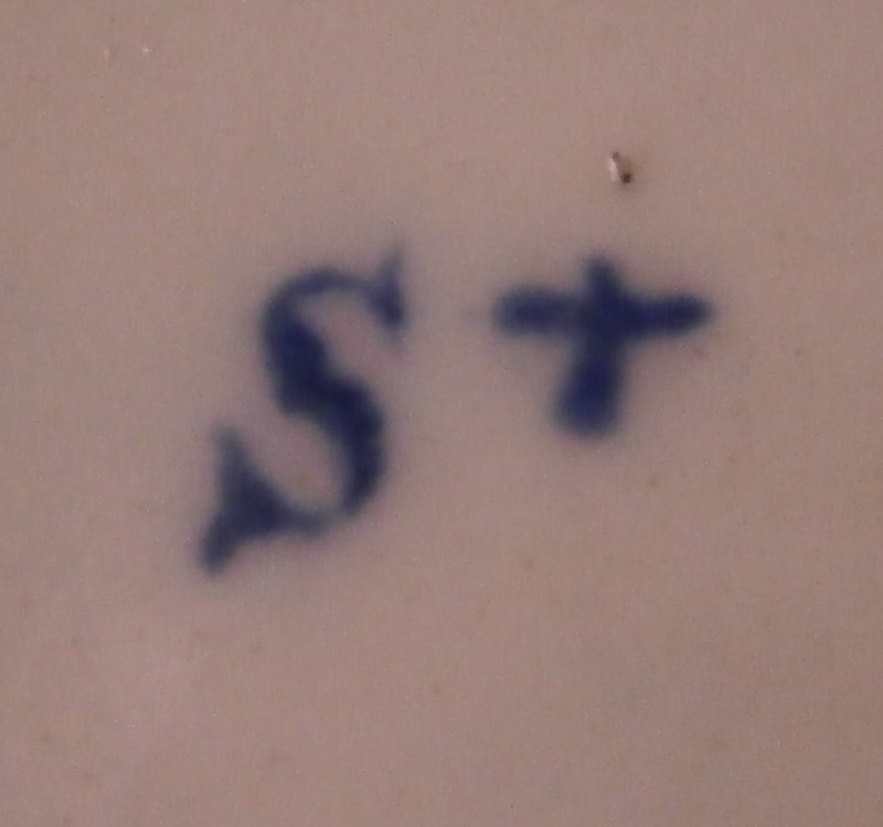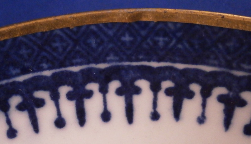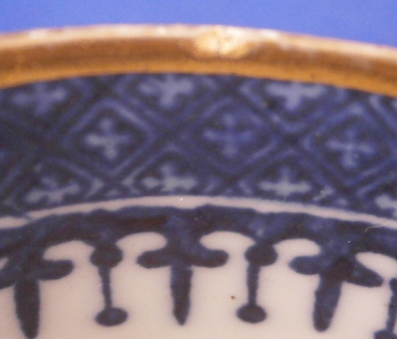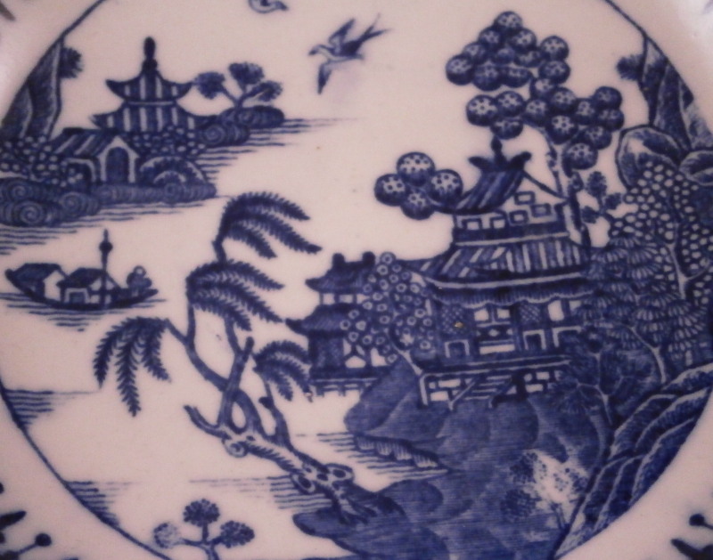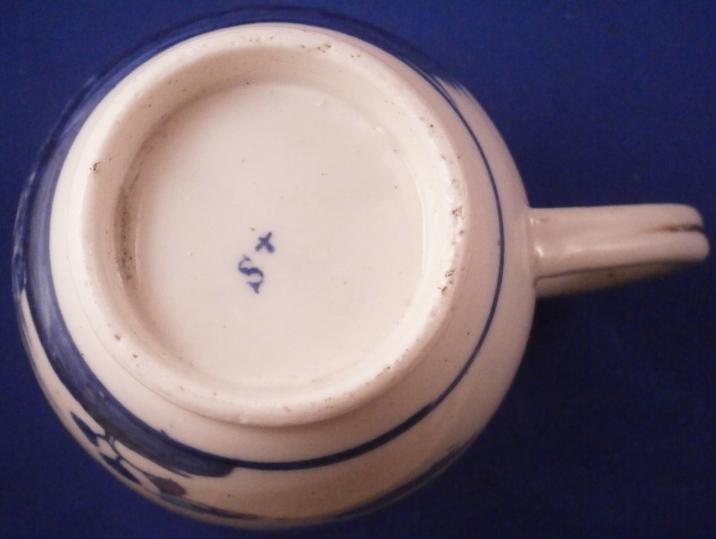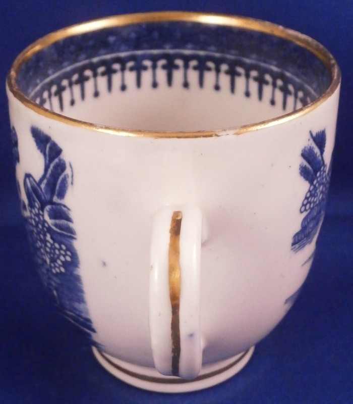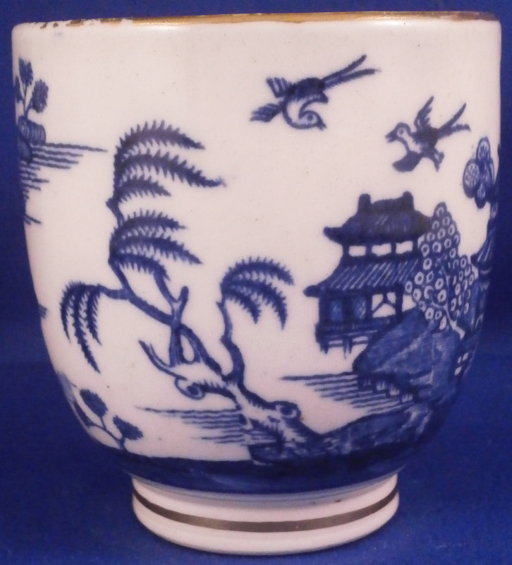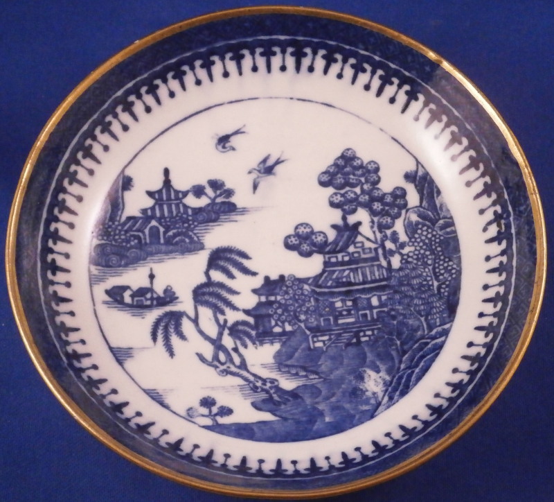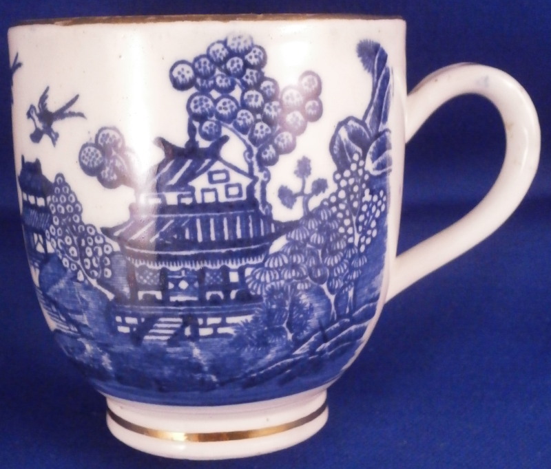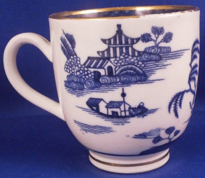 This is a nice cup and saucer made by Caughley in the 18th century. It is decorated in under glaze blue with the hard to find Nankin pattern (often referred to one of the blue Willow patterns) and a bit of gilding to the edges and handle. The pattern is very nice and crisp and it is not a pattern one can find that easily so it was a nice addition to my collection. The set is in great condition with some minor wear to the gilding and a tiny nibble to the top edge of the cup gilded over to hide it nicely. The set displays perfectly! Both are marked - the cup with a blue S+ mark on the underside and the saucer with just a + mark to the underside as shown. The cup is just under 3 inches tall and 2.75 inches in diameter. The saucer is about 1.125 inches tall with a diameter of 5.375 inches. Please email me for more information or other pictures.