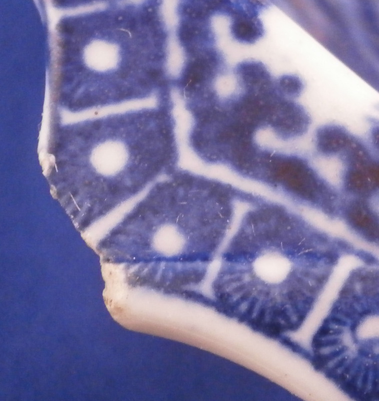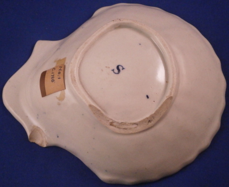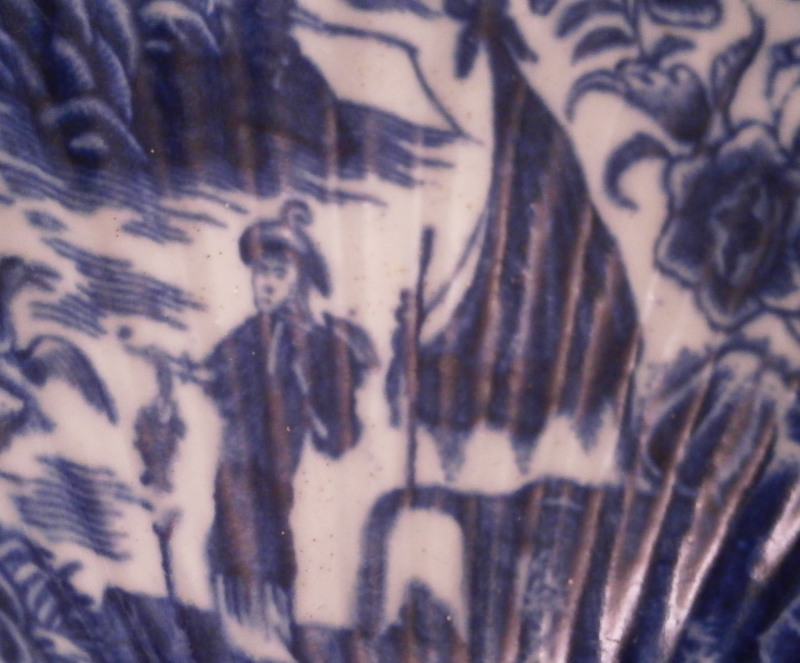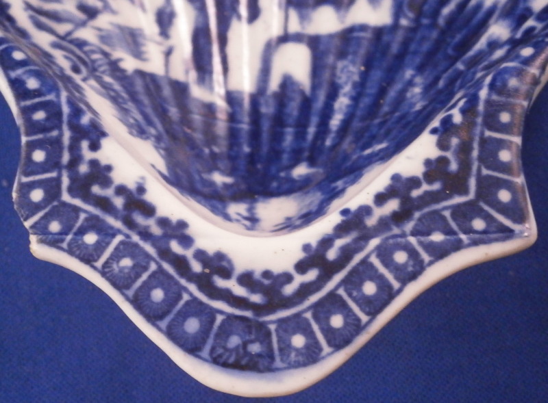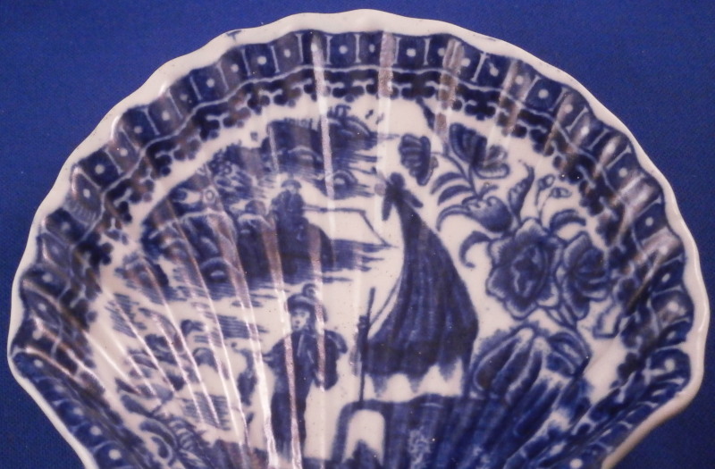 This is a nicely shaped dish made by Caughley in the 18th century during their Salopian period. Likely used for pickles or such. It is in the shape of a scallop shell and decorated in under glaze blue with the Pleasure Boat aka Fisherman pattern with a nice design to the rim as well. The piece is marked underneath with their under glaze blue S - nice and large. The piece is in good condition with a chip to one of the corners which is not terribly obvious and can mostly be seen from the underside as shown. A section of the foot ring is also missing. The dish is just over 1.375 inches tall, 4.75 inches wide and 5.625 inches long. Please email me for more information or other pictures.