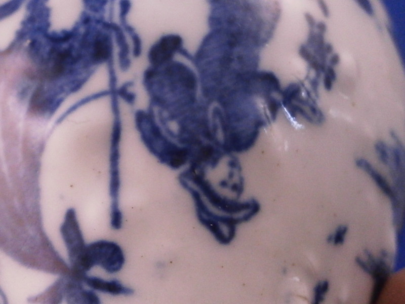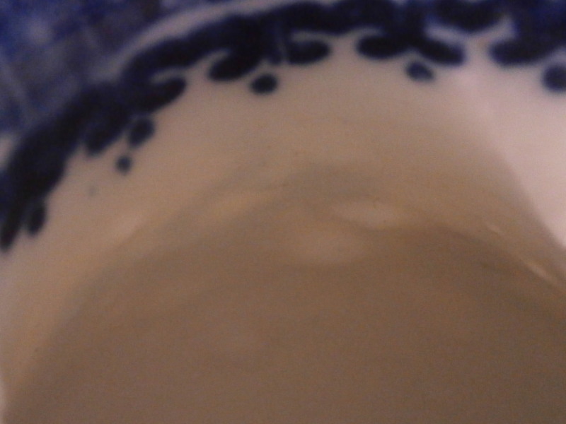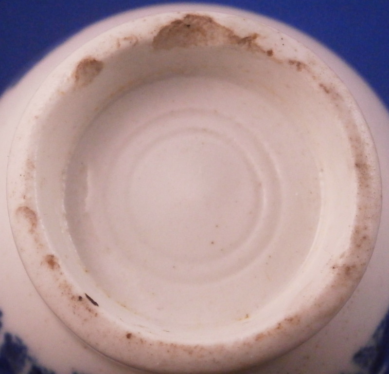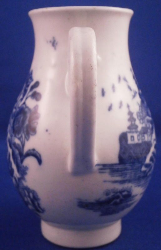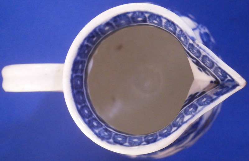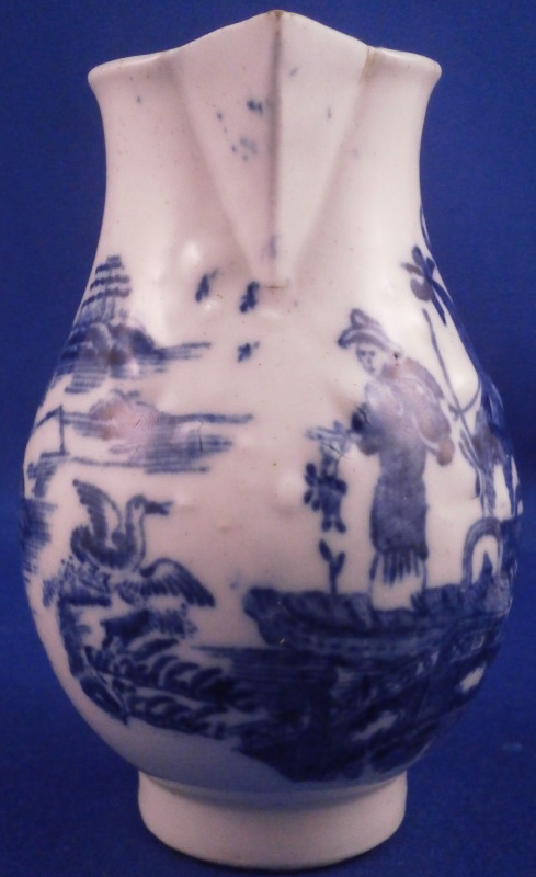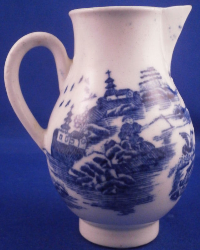 This is a nice early creamer made by Caughley in the 18th century. Looking at it I would say it was still made during the Salopian period so around 1775. It is nicely decorated with their under glaze blue fisherman pattern with a nice trim to the inside edge. Typical handle shape. The cream jug is in good condition with a small stain to the top left corner where the beak shaped spout meets the body and a slightly rough tip though that is how it was made. The foot ring has two chips to the inside that do not affect the piece when on display! Odd is that the paste has lots of lumps to it like blisters in the paste to the outside and inside. They must be impurities in the paste. It's not obvious when on displays but you can feels and see them when handling the piece. It's a really ncie early piece and not that easy to find either. The piece is 3.5 inches tall and has a diameter of about 2.375 inches. It is not marked underneath but that is not very unusual at all. Please email me for more information or other pictures.