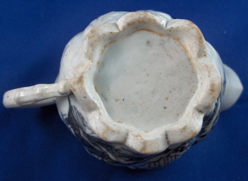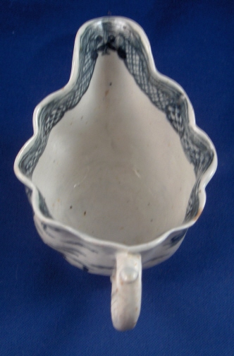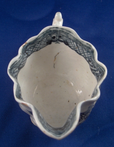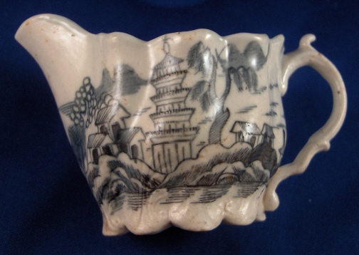 This is a creamer made by Caughley around 1780. It is superbly handpainted with the Tower pattern in underglaze blue and has a nice shape to it as well. The piece is in great condition with just some firing flaws but no damage. There is some brownish staining, black specs and a firing crack only seen on the inside. The creamer is 2.625 inches tall, 4.25 inches long and 2.75 inches wide. It is not marked underneath which is not uncommon for Caughley pieces. Please email me for more information or other pictures.