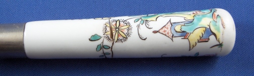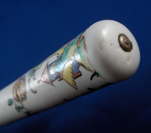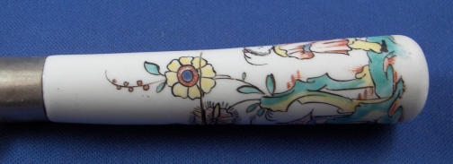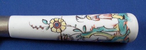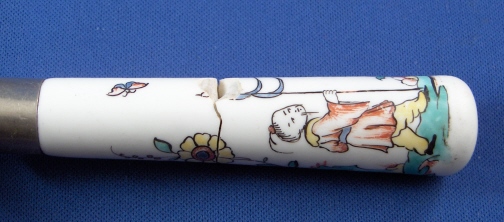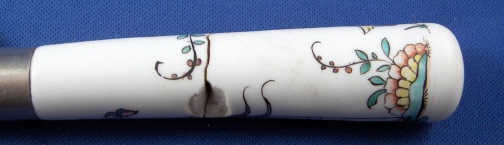 This is a second knife with the handle made by Chantilly around 1740. It is made of softpaste porcelain and is painted in the Kakiemon style derived from earlier Japanese designs. The colors and design are superb! The colors are unlike any other ones I have ever seen on porcelain which is why they are so famous (and not exactly cheap). The design is completely outlined in black which is important for them to be the real deal. The metal blade is marked with an impressed mark of a crown over the letter E (likely the makers mark of the blacksmith) as well as GAVET COU. DU ROI. which is the mark of Jean Gavet (he died in 1777) who had a store in Paris at 138 Rue Saint Honoré. The knife is amazingly complete with the blade which isn't that common. The handle has suffered a crack that goes through the center all the way around and a piece is missing of the porcelain in the same area. The blade is in great shape. The knife is 9.625 inches long of which the visible part of the porcelain handle being about 3.375 inches long. Please email me for more information or other pictures.