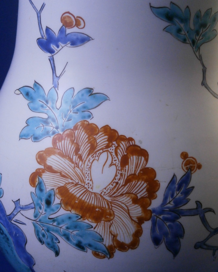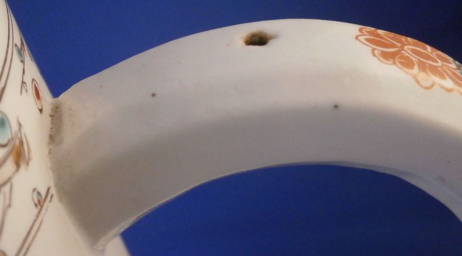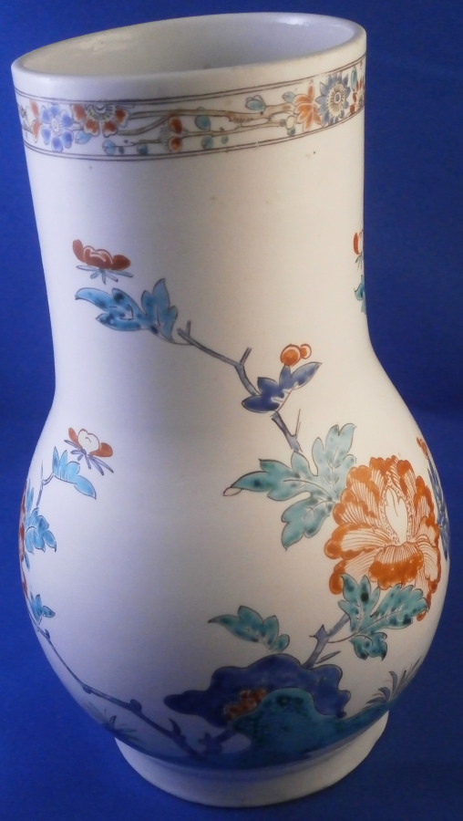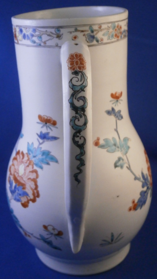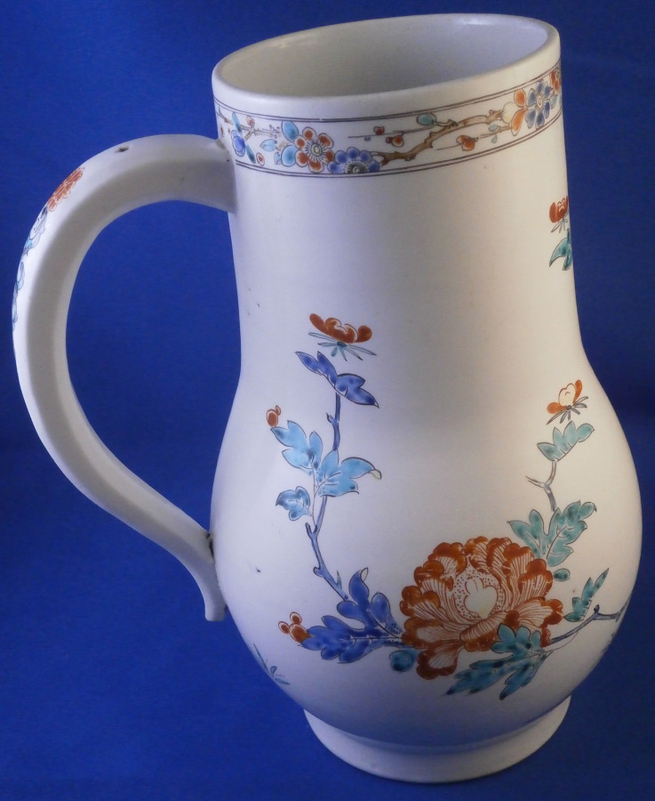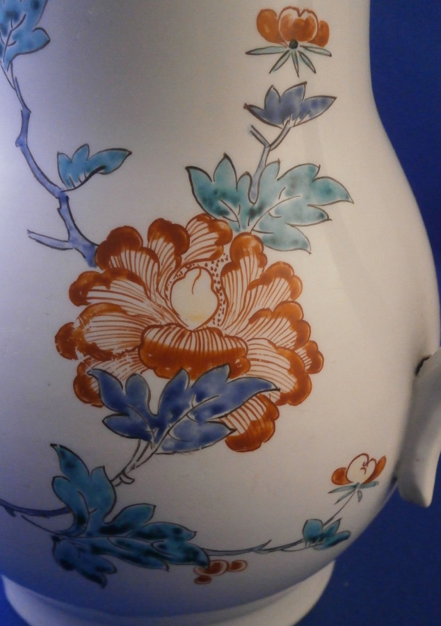 This is an amazing pitcher made by Chantilly around 1730-35. The largest piece I have owned by them an it is stunning. It is made of softpaste porcelain and painted with a polychrome Kakiemon design. The enamel colors are amazing! There is even some nice trim on the handle and along the top edge. The flowers are superb and after their Japanese originals as are the colors off course. The jug is in great condition with some expected wear from age and some firing flaws as shown. There is a hole on top of the handle which is typical and that is where they would have attached a lid to the piece. I don't know if this one ever had one but I have seen them with and without lids. Not that there are many of these around! The piece displays perfectly and is a new favorite of mine! It is marked underneath with the reddish hunting horn mark as shown. The piece is 7.375 inches tall and 4.5 inches in diameter at the widest part. A rare find and a real beauty! Please email me for more information or other pictures.