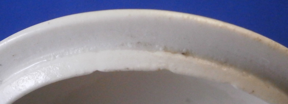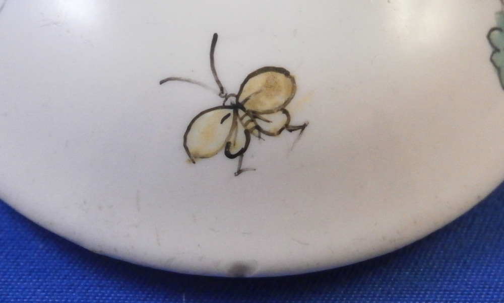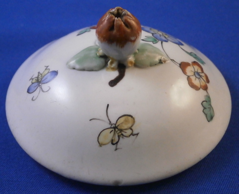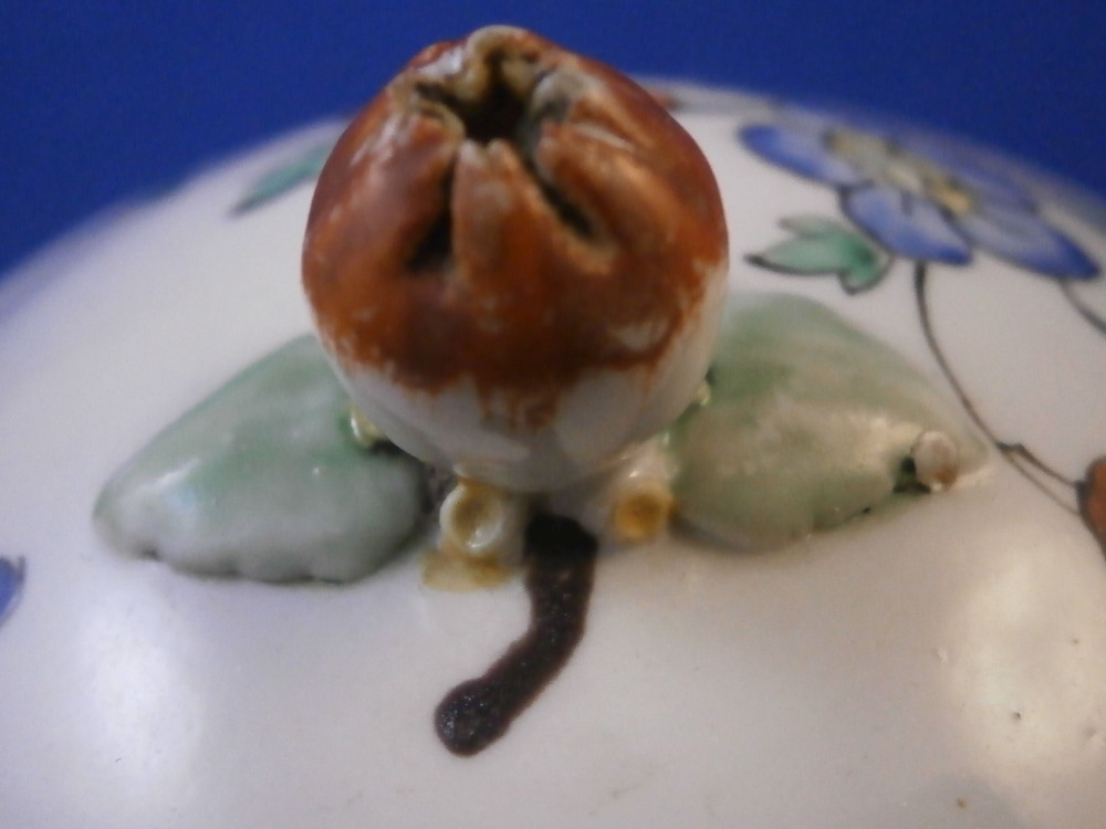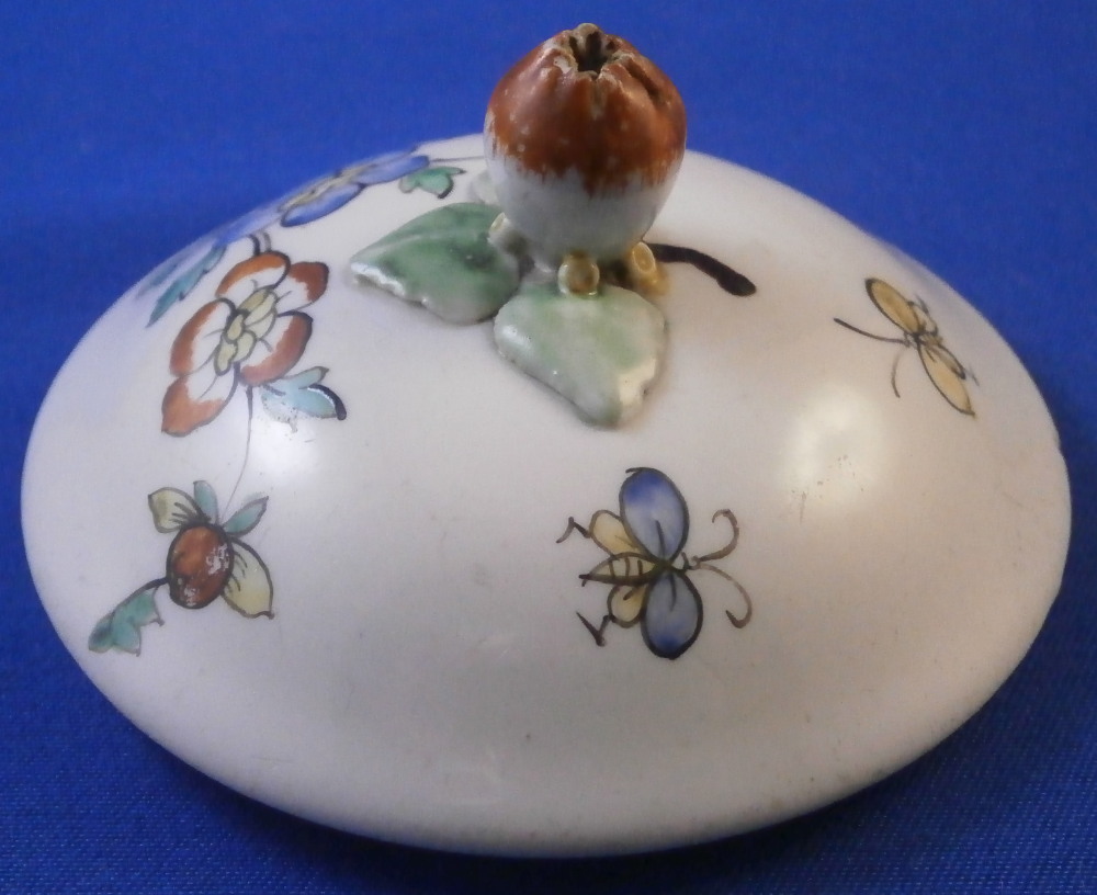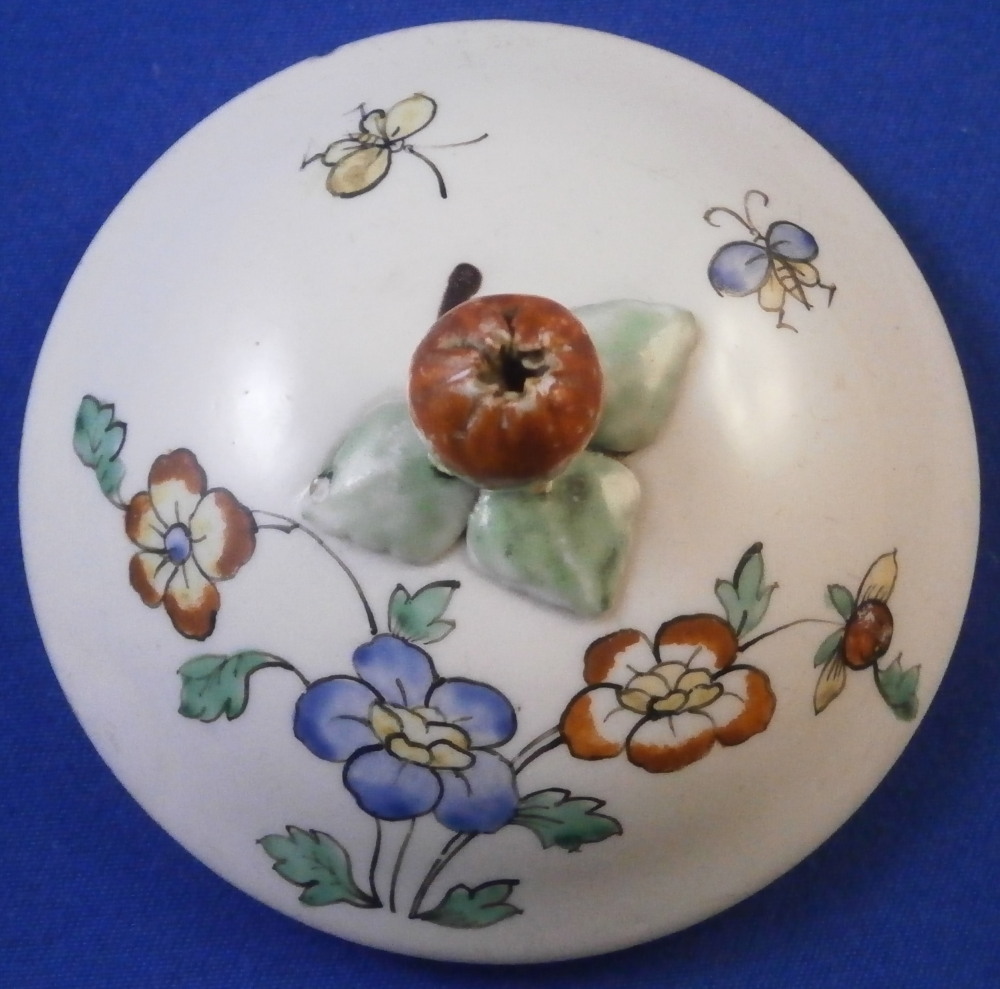 This is a superb lid made by Chantilly in the early to mid 18th century. It is made of soft paste porcelain and painted with a really nice Kakiemon style floral arrangement as well as two insects / butterflies and a typical floral finial with its leaves. Could be used as a repalcement piece for a teapot or even a pot de creme or ointment pot. The piece is in great condition with a tiny chip to the edge as well as a few nibbles to the ring that would sit inside the main piece. It displays perfectly and would do the job well! It is not marked underneath which is normal as the lids would never have been marked. The lid has a diameter of 2.5 inches with the outer diameter of the underside ring being just over 2.125 inches. The height without the udnerside ring is about 1.25 inches. Please email me for more information or other pictures.