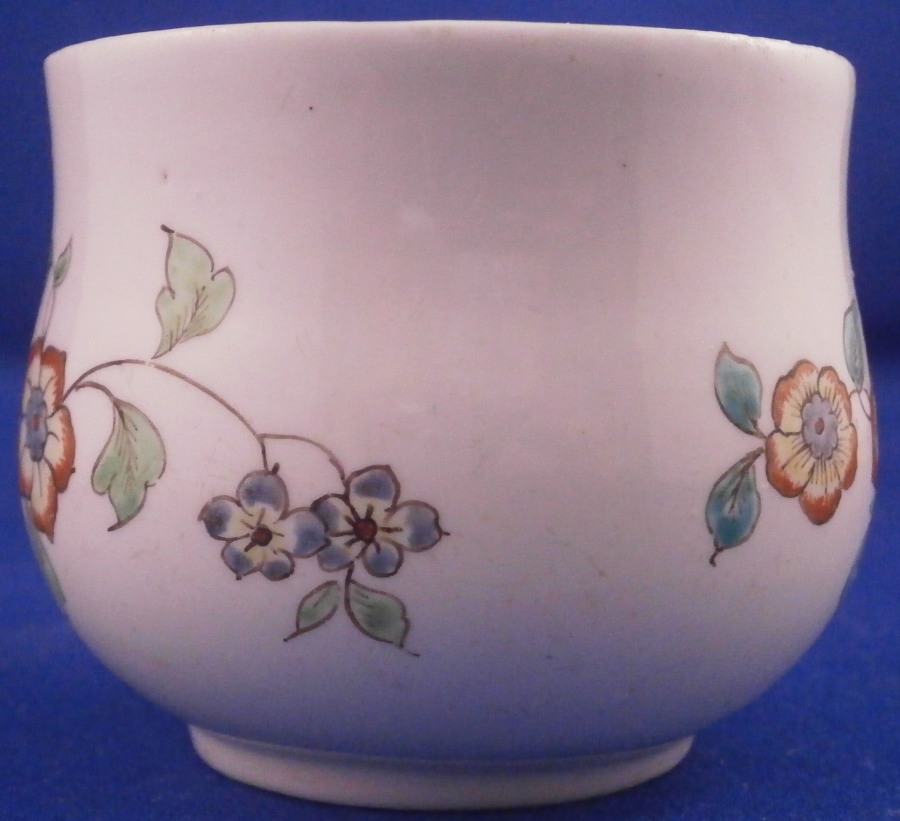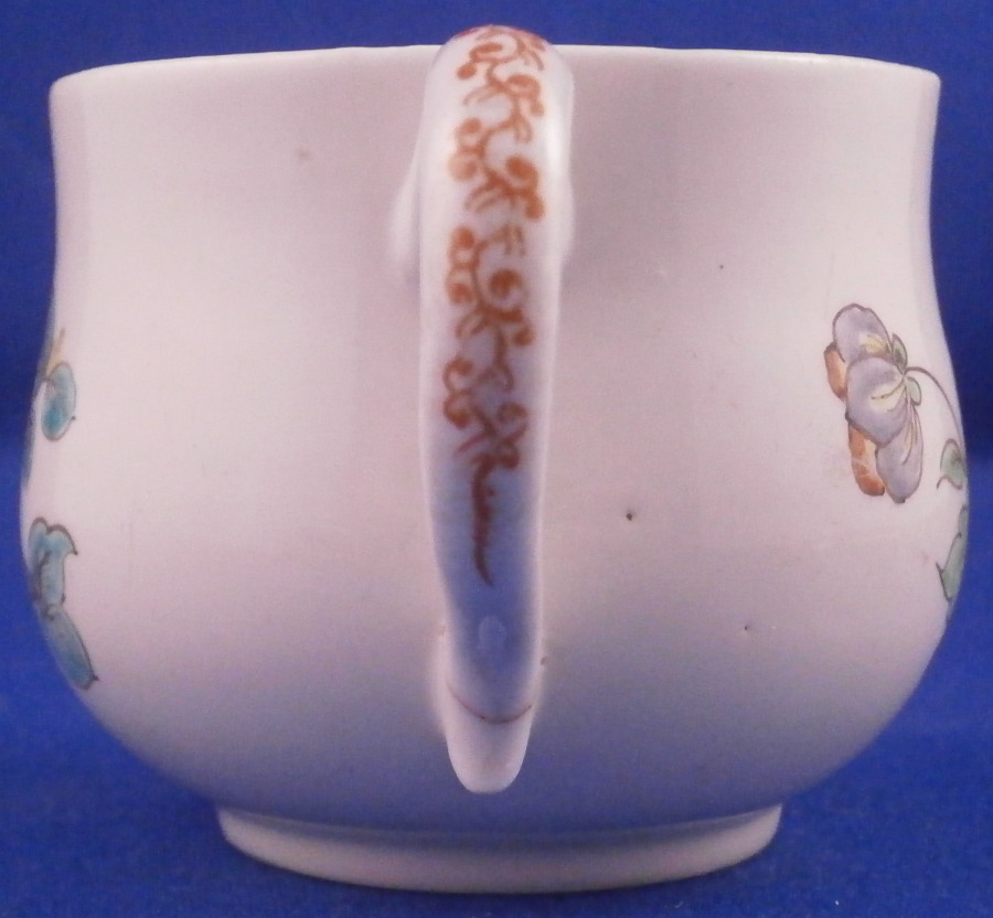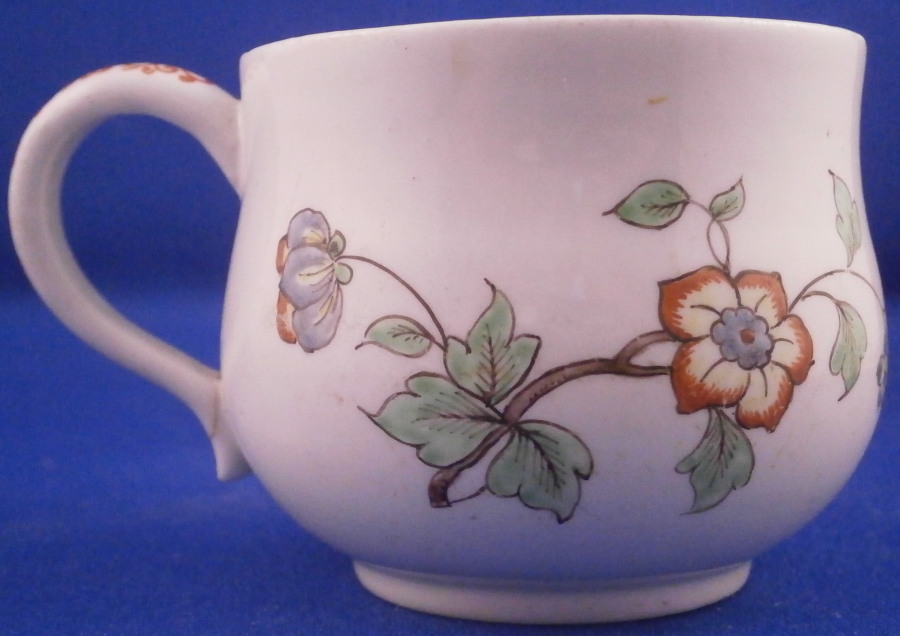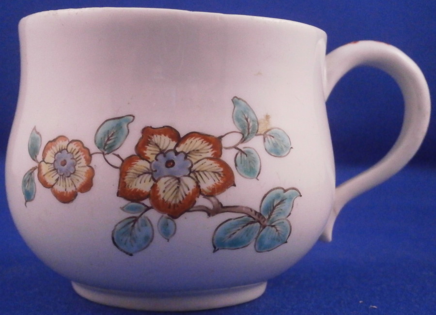 This is a superb pot de creme or pot au jus made by Chantilly around 1735. A covered cup for hot chocolate or meat broth . It is made of soft paste porcelain and hand painted with a polychrome flower design in the Kakiemon colors and style. Their enamel colors are just stunning! I think their pieces are among the very best in the porcelain world! The flowers are superb and there is even a bug on the lid which also has a nice flower finial. The flowers are after their Japanese originals as are the colors off course. The pot and lid are in great condition with a crack across the bottom terminal of the handle as shown. A common issue on 18th century pieces like this. The piece displays superbly! I just love these early soft paste pieces with the Kakiemon colors!!! The cup is marked underneath with their red hunting horn. It nice to have a marked example as many are not. The piece is 2.75 inches tall with a diameter of 2.625 inches at the widest point. A rare find and a real beauty! These did not come with saucers! Please email me for more information or other pictures.