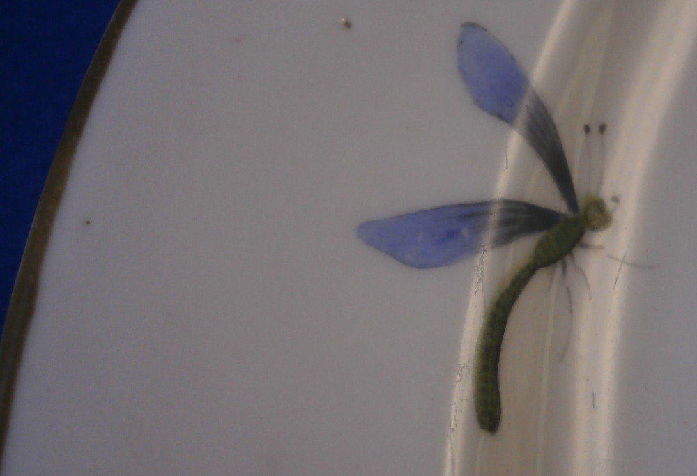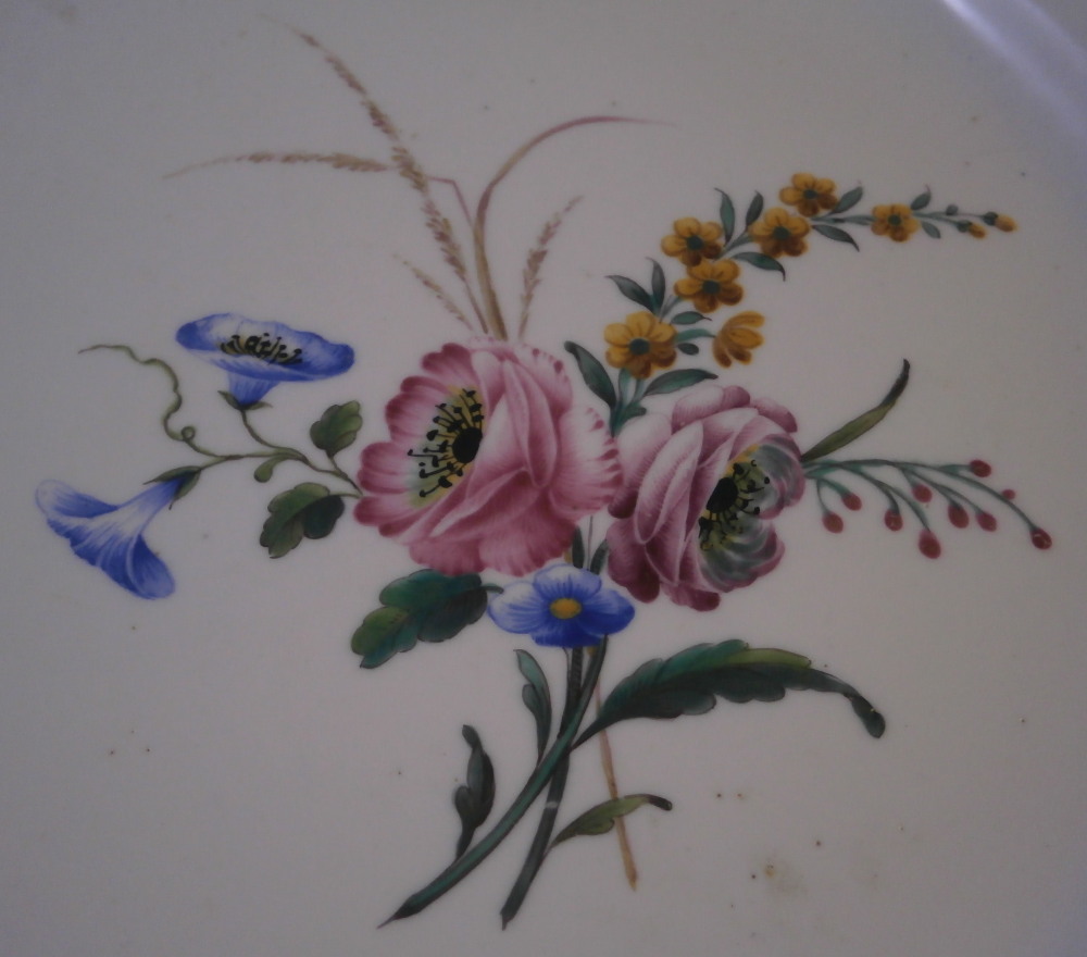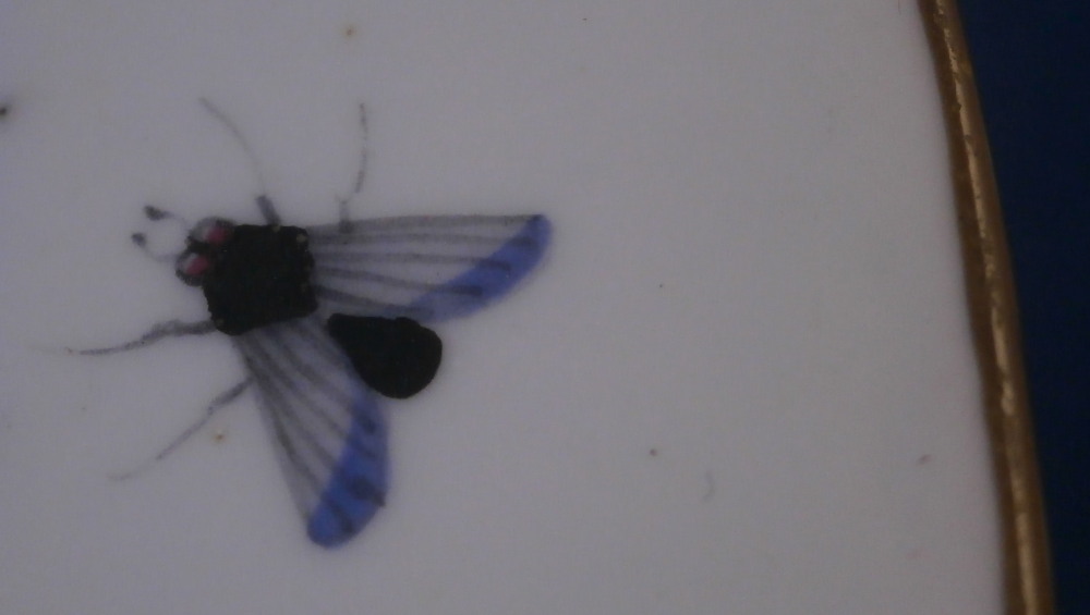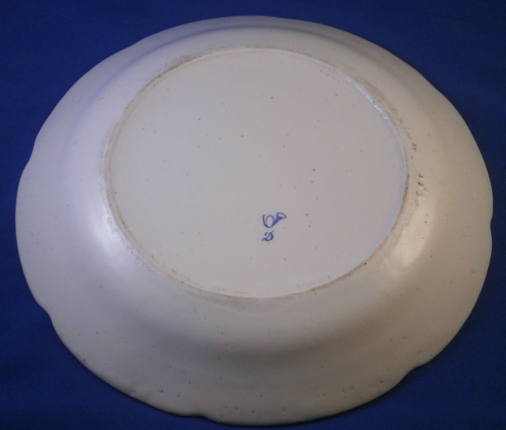 This is a really nice and rare plate made by the Chantilly factory of France in the 18th century. It is made of soft paste porcelain which has this warm creamy color to it and is hand painted with their super enamel colors which melt into the glaze. It's what makes soft paste pieces so much nicer than hard paste! The piece is decorated with a nice floral arrangement in the center as well as two smaller flowers and four bugs on the rim. The nicely shaped edge has a brown trim to it. The plate is in great condition with no chips, etc. but there is a touch of stacking wear to the white area and lots of firing spots which is a manufacturing flaw very common to these early pieces. It displays superbly and is a marked example which is nice! It has their blue hunting horn mark with the letter D below it as shown. The plate is 9.25 inches in diameter and 1.125 inches tall. Please email me for more information or other pictures.