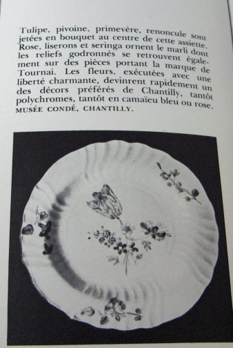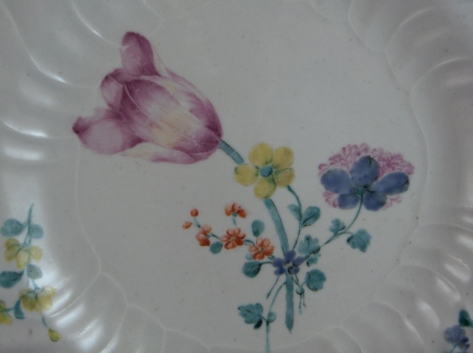 This is a very rare plate made by Chantilly around 1760. It is made of softpaste and painted with a nice flower arrangement in colors very different from what we are used to on hardpaste porcelain. This is probably my favorite plate. Nice basketweave relief to rim as well as a brown trim to the outside edge. The plate is in super condition - with a tiny bit of wear and a small chip to the underside of the rim. It is marked underneath with the iron red hunting horn mark as well as a black D. which is probably the painters mark. The plate is almost 9.5 inches in diameter and 1.25 inches tall. Please email me for more information or other pictures.