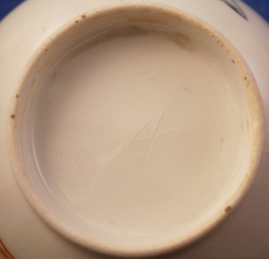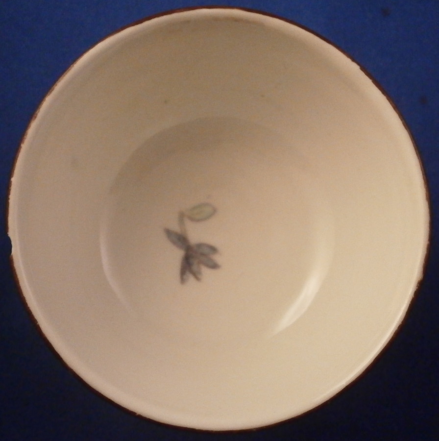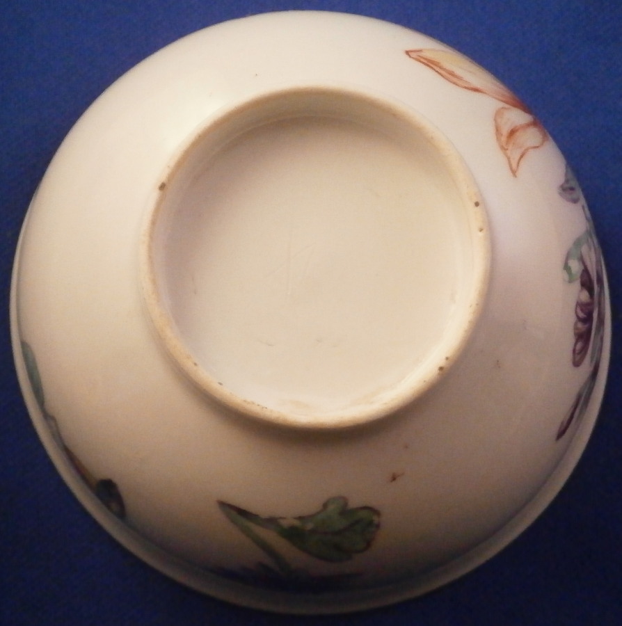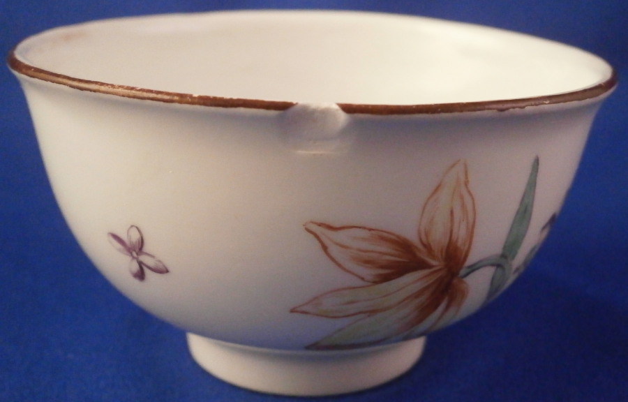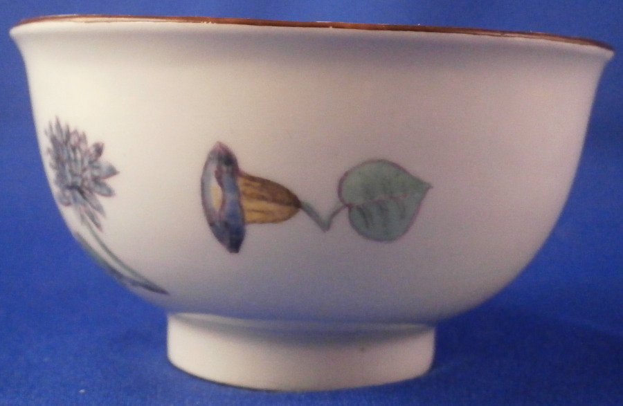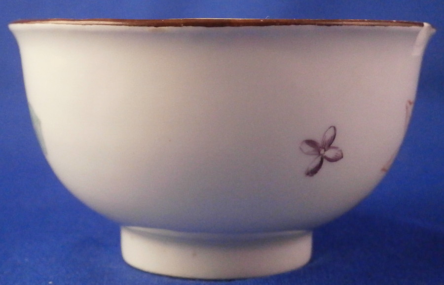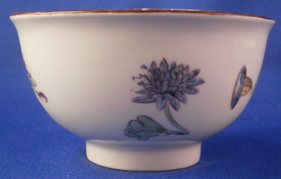 This is a superb teabowl shaped cup made by Chantilly in the first half of the 18th century. It is made of softpaste porcelain and very delicately potted. That in combination to the superb hand painted polychrome flowers all around make it a very elegant example of their work. It has a larger floral arrangement on one side with two smaller flowers to the other side and a blossom in between with another small single flower on the bottom inside. Brown trim to the edge. The flowers are superb and the piece looks very much like a Meissen piece from this period except nicer due to their amazing enamels and the soft paste porcelain. The cup displays nicely but has a flat chip to the top edge as shown and a few spots of green enamel flaking - a common issue on 18th century porcelain. An easy fix for any restorer and well worth it! It is not marked underneath except for an incised number 4 as shown. The piece is 1.625 inches tall and 3 inches in diameter. A rare find and a real beauty! Please email me for more information or other pictures.
