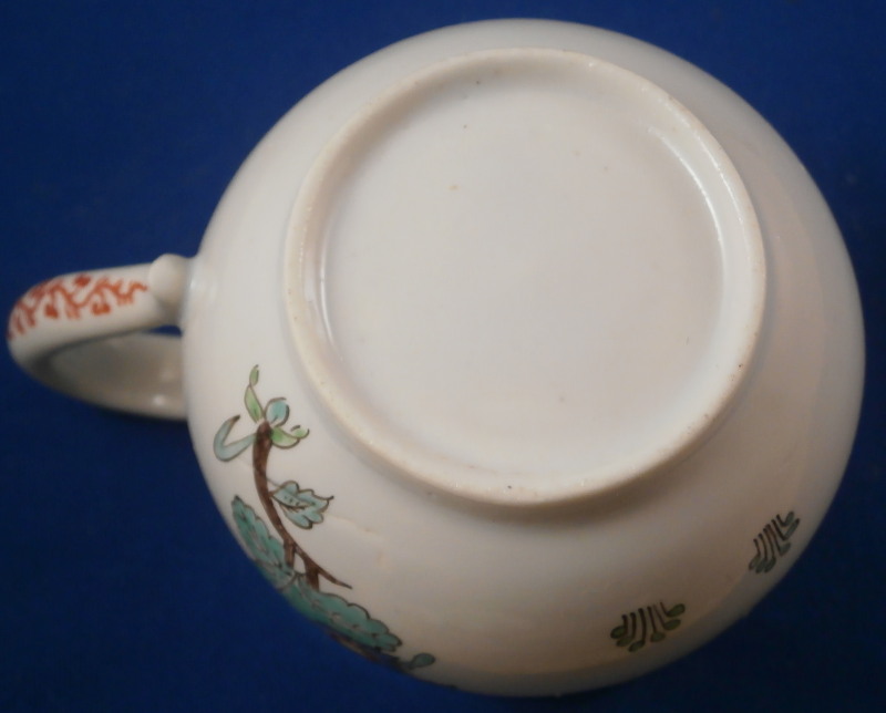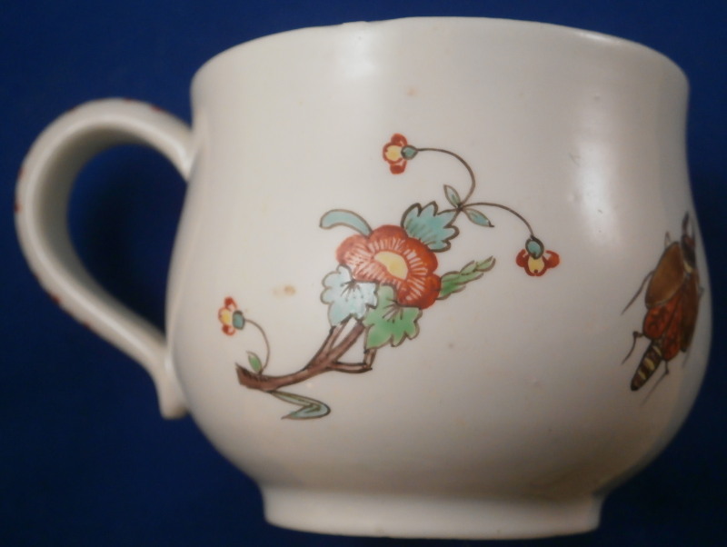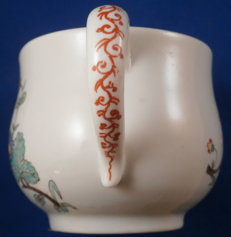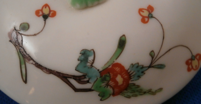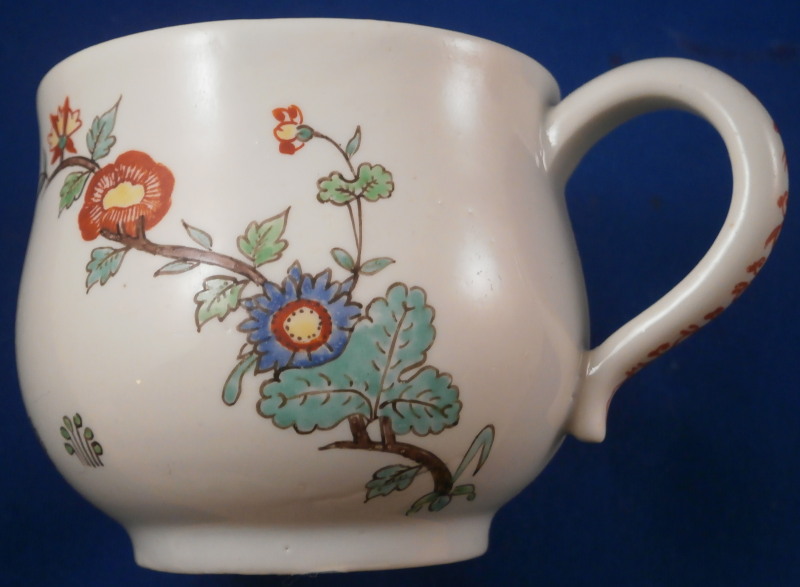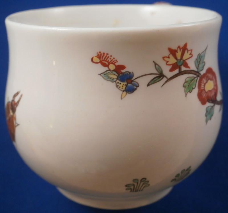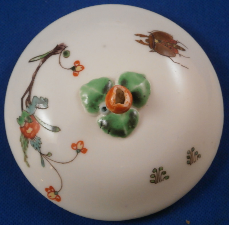 This is a superb pot de creme or pot au jus made by Chantilly around 1735. It is made of soft paste porcelain and painted with a polychrome flower design in the Kakiemon colors and style. Their enamel colors are just stunning! The flowers are superb and there is even a bug on one side and the lid has a nice flower finial. The flowers are after their Japanese originals as are the colors off course. The pot and lid are in great condition with just some issues from the making as is to be expected from these early pieces. Two minor chips to the top edge that are under the glaze, three small spots of staining on the inside near the handle and a couple of tiny black firing specs. The lid has an area where the glaze didn't take right but it is not a repair! All in all about as good a shape as one could hope for. I just love these early soft paste pieces with the Kakiemon colors!!! The cup is not marked underneath but that is not unusual. Definitely from the period and by this maker. The piece is 2.75 inches tall with a diameter of about 2.5 inches at the widest point. A rare find and a real beauty! Please email me for more information or other pictures.