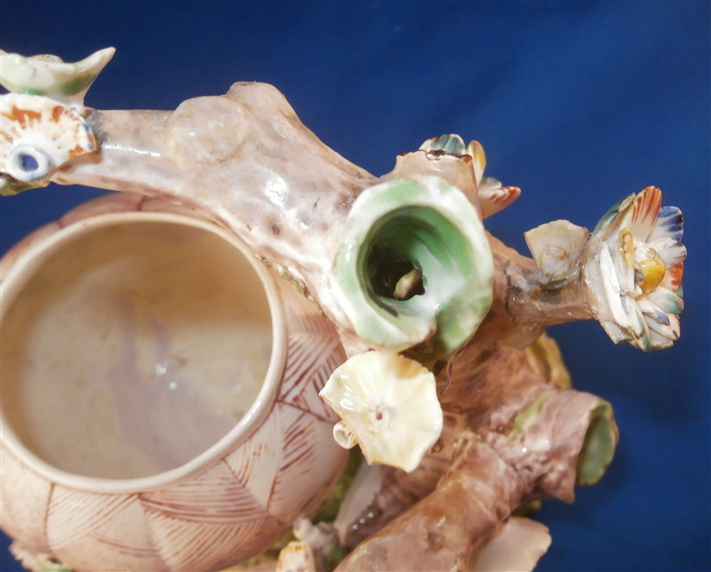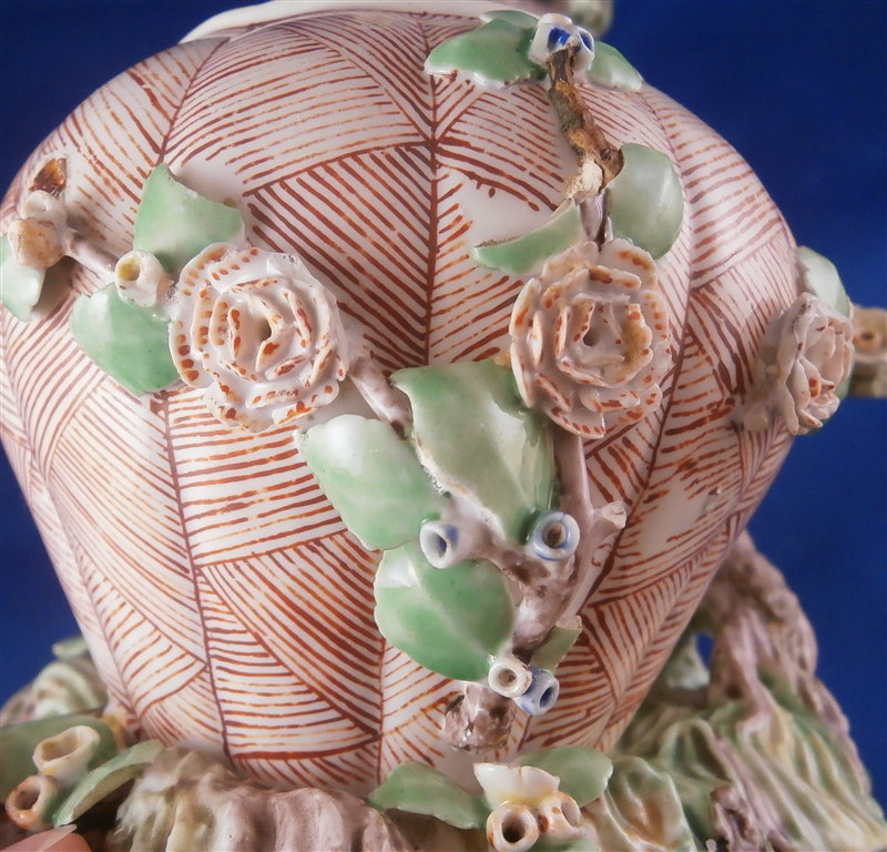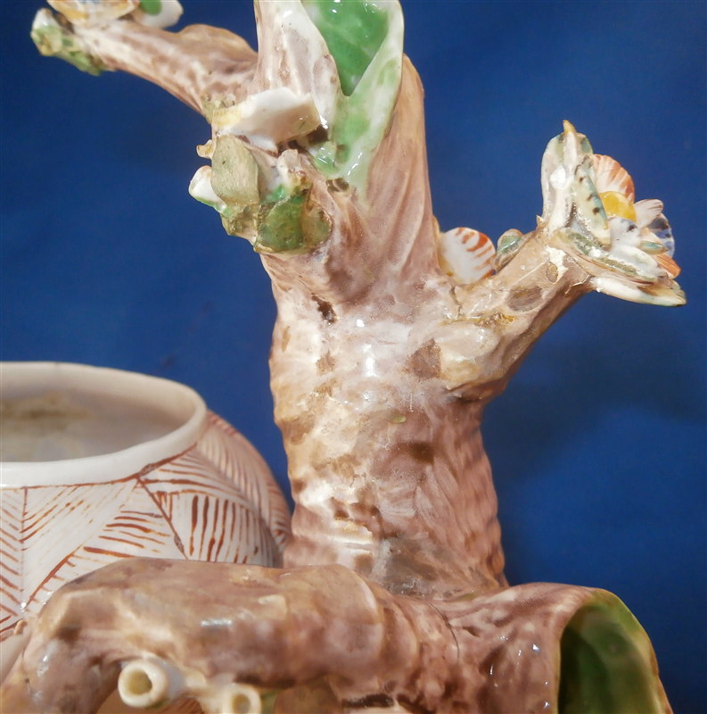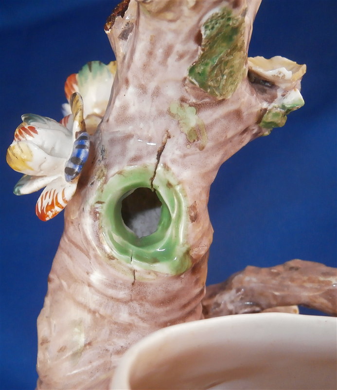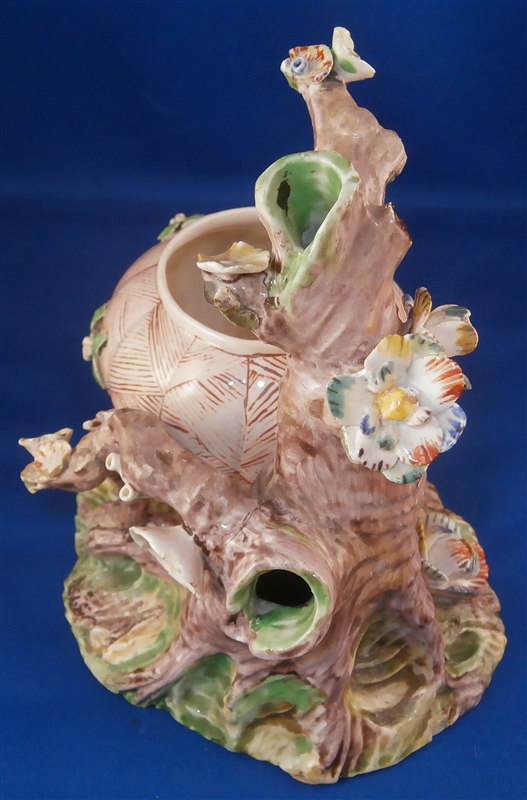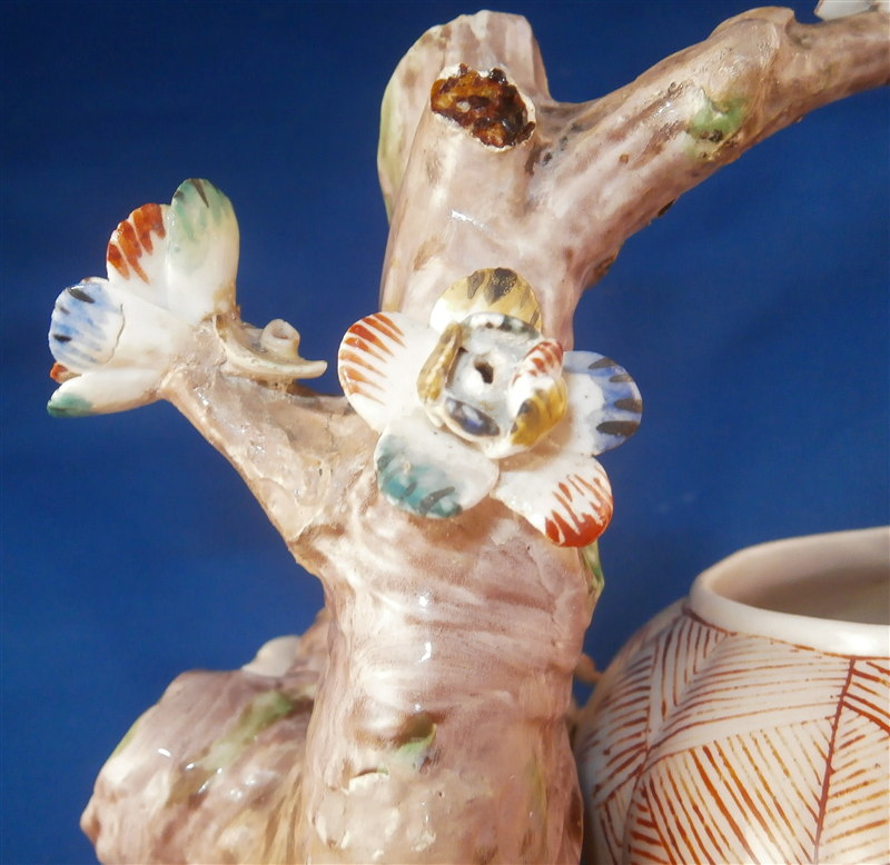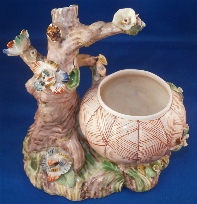 This is a superb potpurri vase (I think) which was made by Chantilly around 1735-40. It is made of softpaste porcelain and is in the form of a pot with a tree next to it. The pot is decorated with a red criss cross pattern and has floral vines attached to it. The pot sits on a nice base decorated in green and brown tones mostly with a few flower attached to it with a tree next to the pot that is nicely modeled and also has some flowers attached to it. All in all a fun piece and Chantilly porcelain is very ahrd to find these days especially pieces that are not dishes. The potpourri displays nicely but has its issues which is pretty common to porcelain this old. The pot would have had a lid either porcelain or possibly metal. There is a bit of damage to the floral vines on the pot with four leaves chipped, a piece of vine lacking and a flower missing but it's not bad. The base had a small piece broken out which was reattched and the damage painted over and a larger chunk was cleanly borken out through the tree and base and reattached and covered though no porcelain seems to be missing except a sliver. Damage to the branches of the tree and flowers much of it has been restored. The large multi colored petal flowers seem to be a bit odd so I am not sure they are original though they fit the colors of the other flowers so likely at least that they are Chantilly and probably original but I jsut figured I'd mention it. All in all a rare and fun piece to look at and it displays nicely. The piece is about 6 inches tall, 6 inches wide and 5 inches deep. The porcelain is not makred which is the norm! Please email me for more information or other pictures.