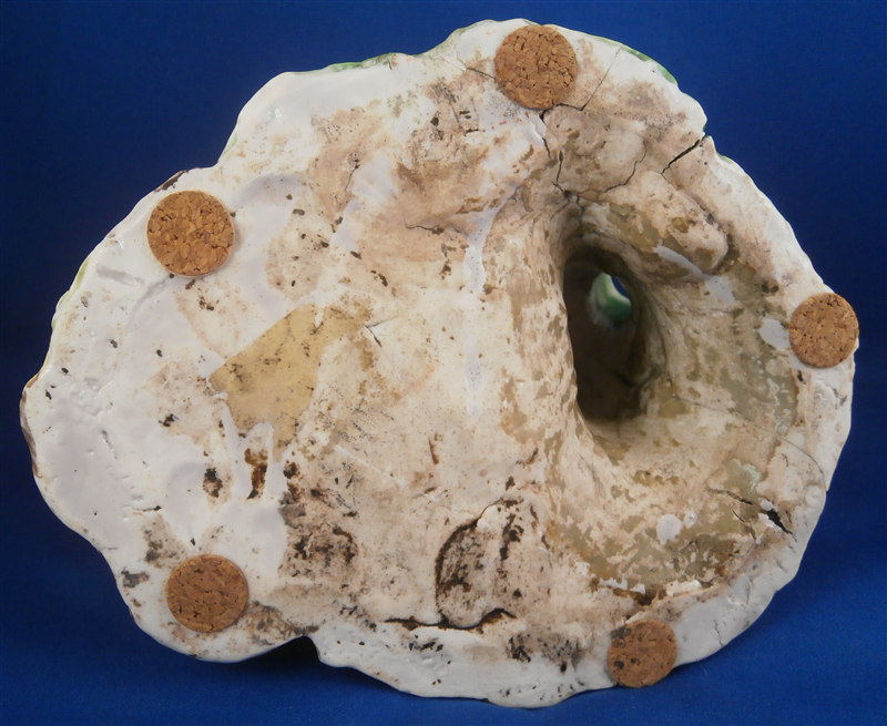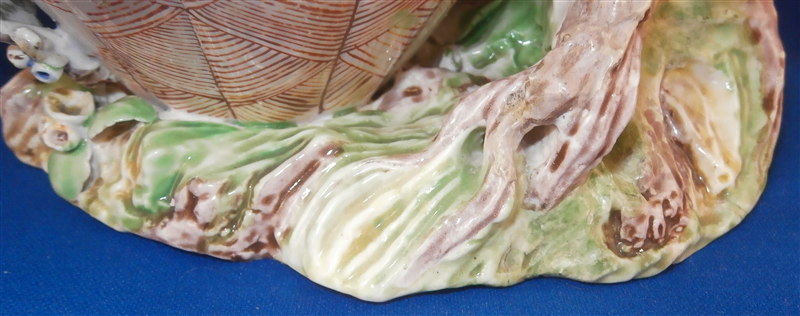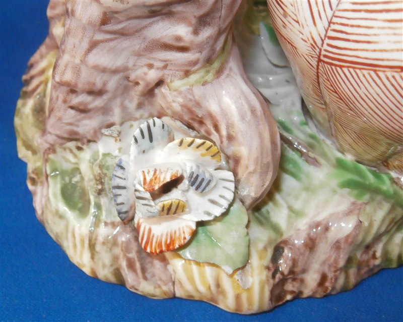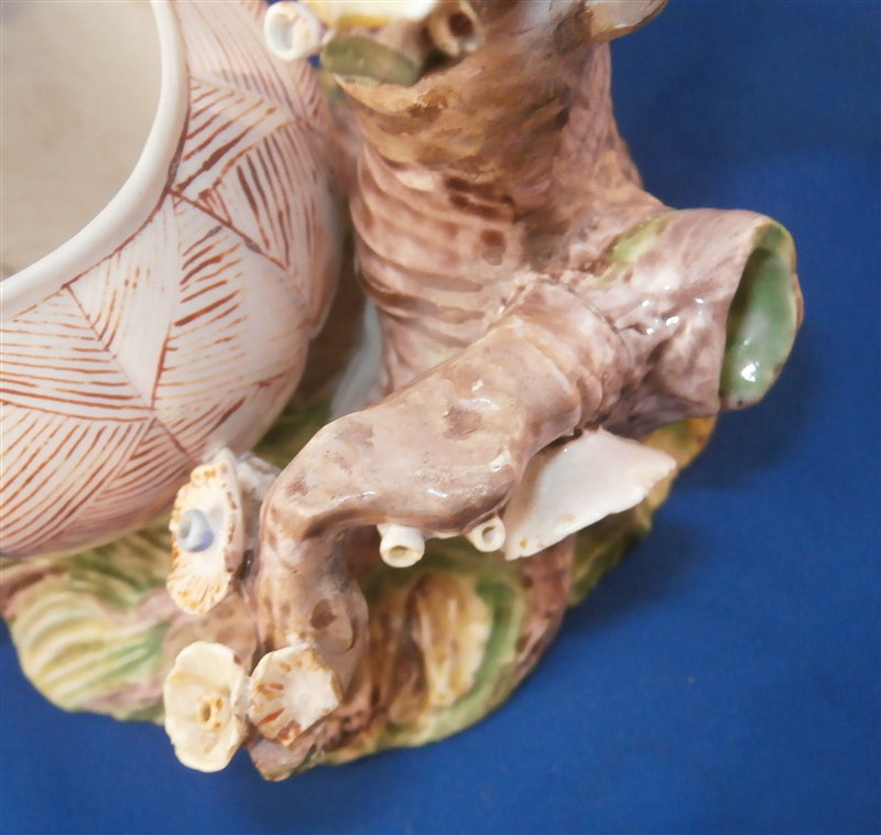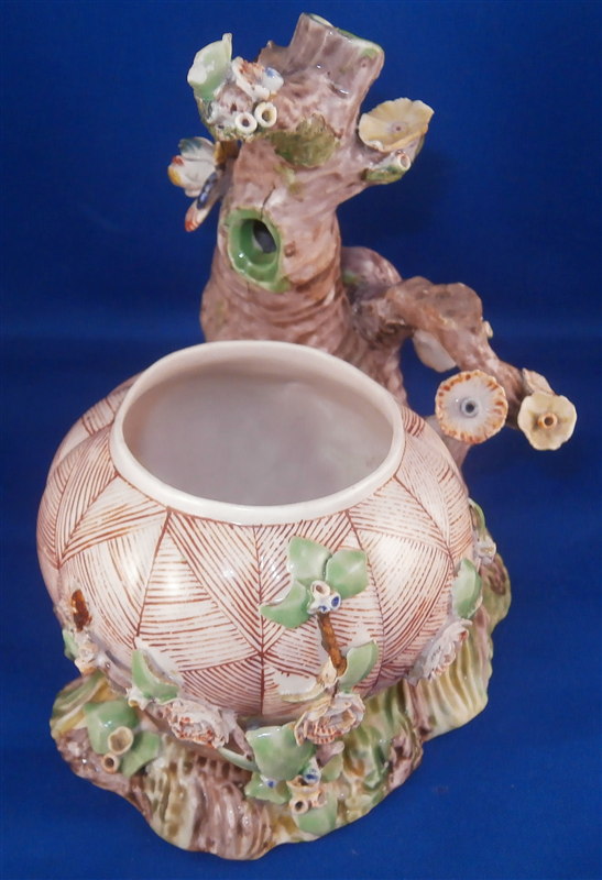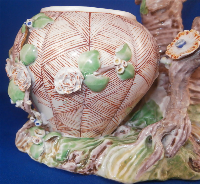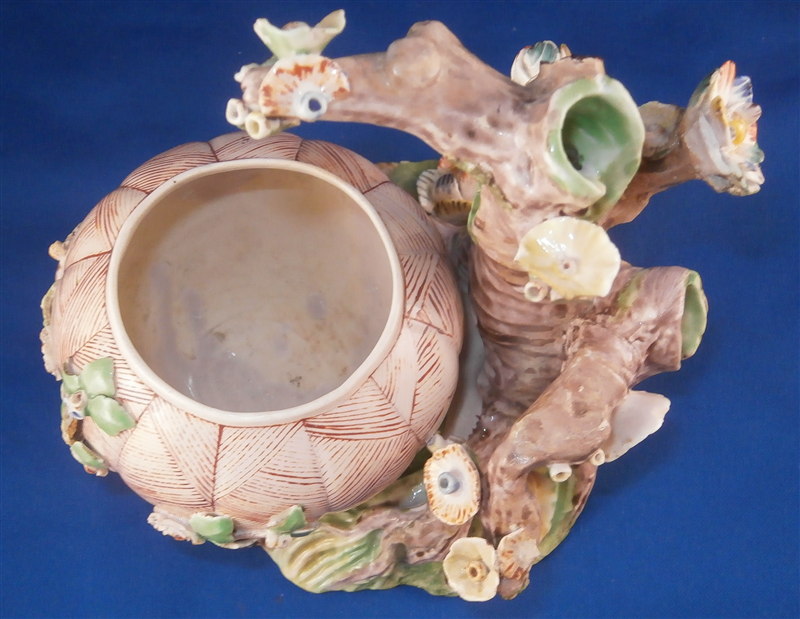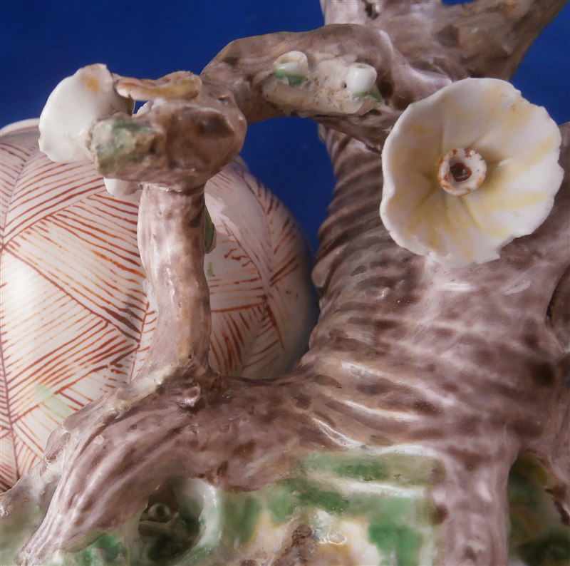 This is a superb potpurri vase (I think) which was made by Chantilly around 1735-40. It is made of softpaste porcelain and is in the form of a pot with a tree next to it. The pot is decorated with a red criss cross pattern and has floral vines attached to it. The pot sits on a nice base decorated in green and brown tones mostly with a few flower attached to it with a tree next to the pot that is nicely modeled and also has some flowers attached to it. All in all a fun piece and Chantilly porcelain is very ahrd to find these days especially pieces that are not dishes. The potpourri displays nicely but has its issues which is pretty common to porcelain this old. The pot would have had a lid either porcelain or possibly metal. There is a bit of damage to the floral vines on the pot with four leaves chipped, a piece of vine lacking and a flower missing but it's not bad. The base had a small piece broken out which was reattched and the damage painted over and a larger chunk was cleanly borken out through the tree and base and reattached and covered though no porcelain seems to be missing except a sliver. Damage to the branches of the tree and flowers much of it has been restored. The large multi colored petal flowers seem to be a bit odd so I am not sure they are original though they fit the colors of the other flowers so likely at least that they are Chantilly and probably original but I jsut figured I'd mention it. All in all a rare and fun piece to look at and it displays nicely. The piece is about 6 inches tall, 6 inches wide and 5 inches deep. The porcelain is not makred which is the norm! Please email me for more information or other pictures.