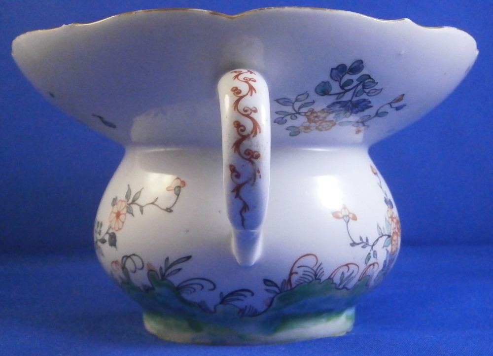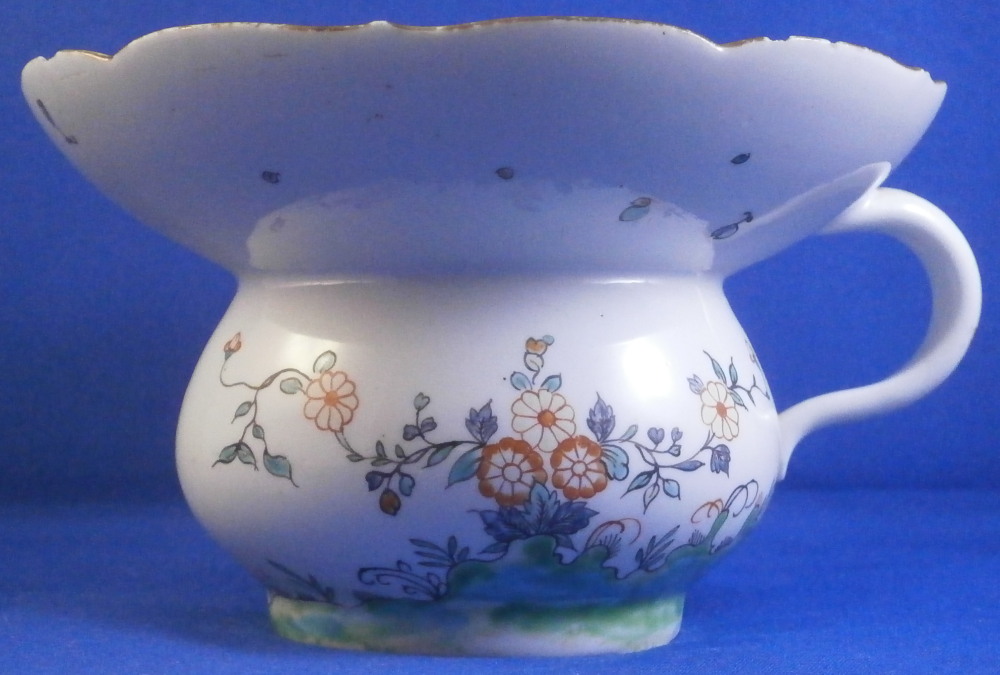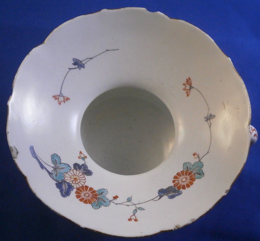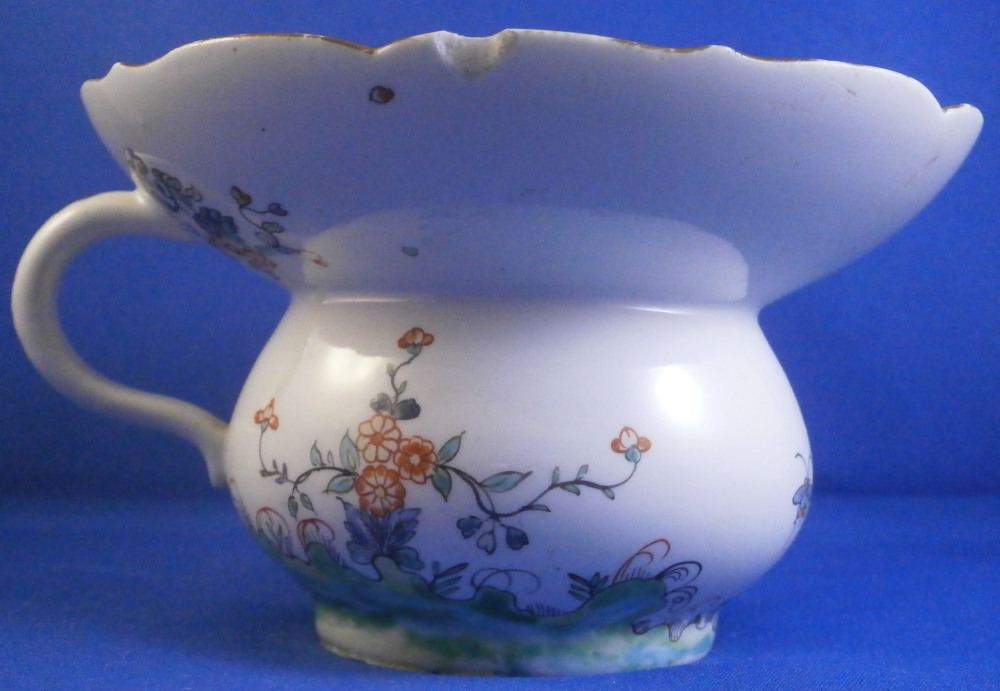 This is a very rare, fun and interesting piece made by Chantilly in the mid 18th century. It is a spittoon / cuspidor that has a typical shape to it with a nicely shaped to edge and a handle to one side. The piece is made of soft paste porcelain and hand painted in the Kekiemon palette. The inside top rim has a nice Kakiemon floral design to it as well as a smaller design to the other side. The underside rim has a kakiemon flower arrangement near the handle and some small leaves and spots painted all around likely to hide small firing flaws. The best part however is that the little bottom bulb part is hand painted all around with an imaginary landscape scene in the kakiemon style with grass, rocks and flowering branches as well as one insect/bug. Red design to the handle and brown trim to the edge. An amazing piece to look at and something you won't see again anytime soon! The piece is in good condition but does have two larger rim chips as well as some tiny ones as shown. I showed the larger rim chips from both the top and underside! If need be a decent restorer could hide them completely but I think it's part of its history and it oes display nicely the way it is. A fun piece to looks at and a great conversation starter. Great for the person that collects medical pieces or even chamber pots as well I think. The piece is marked underneath with the red hunting horn mark as well as a bunch of old dealer / collector stickers. The spittoon is 2.875 inches tall with a top diameter of 4.875 inches and the handle sticks out about 0.5 inches. Please email me for more information or other pictures.