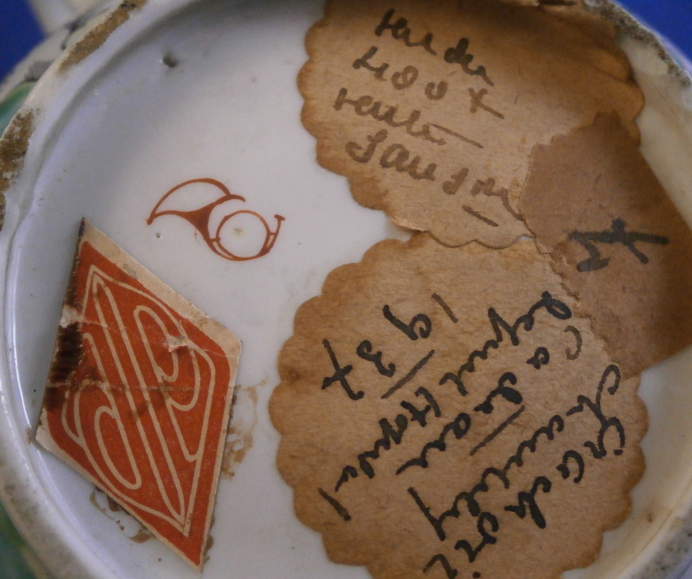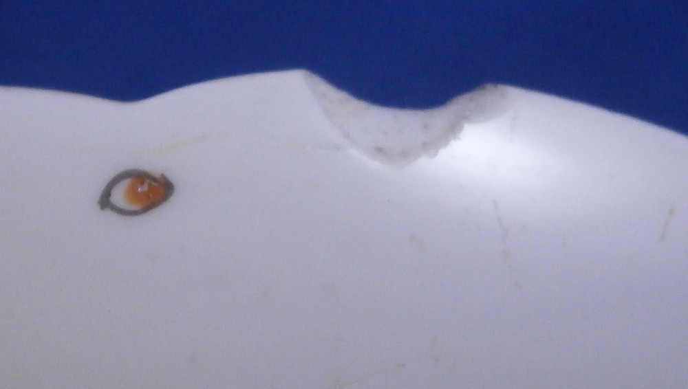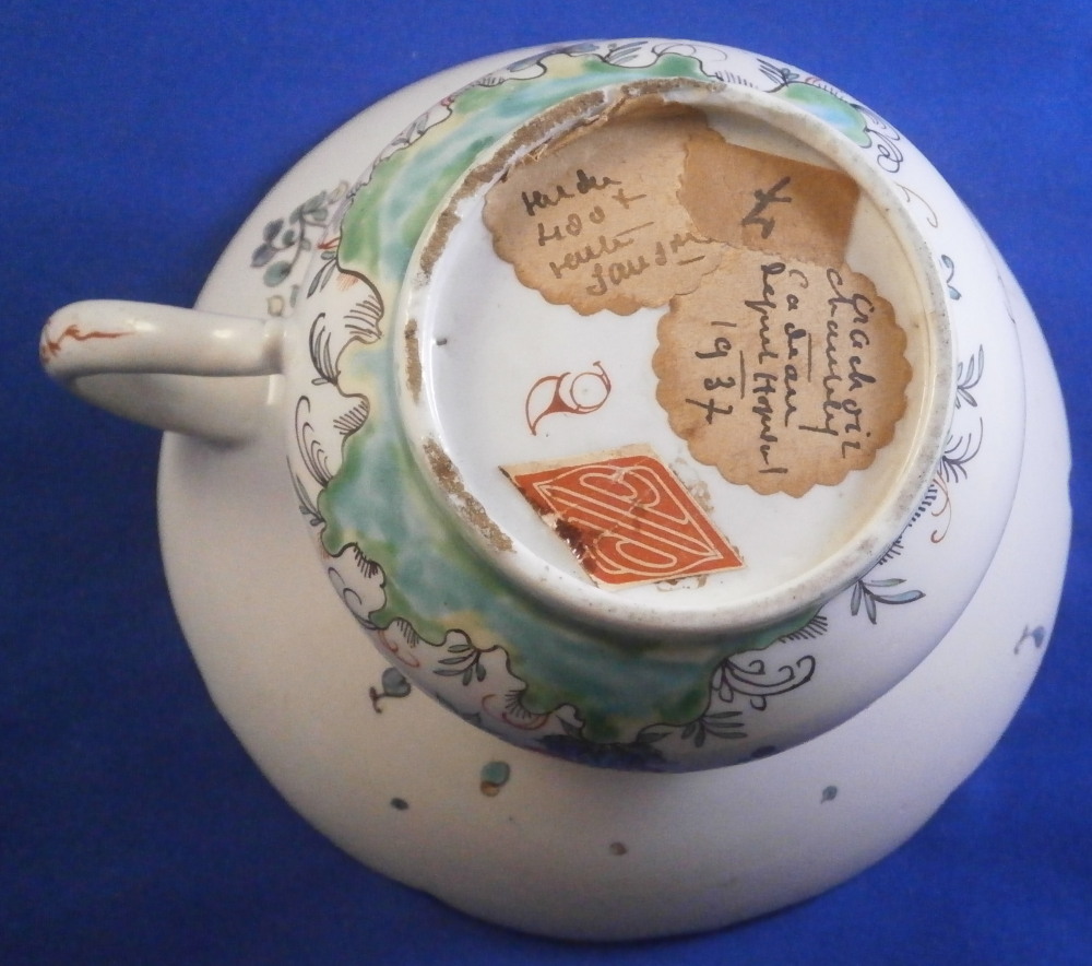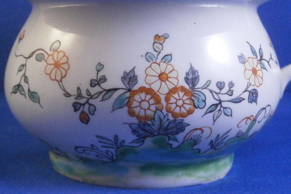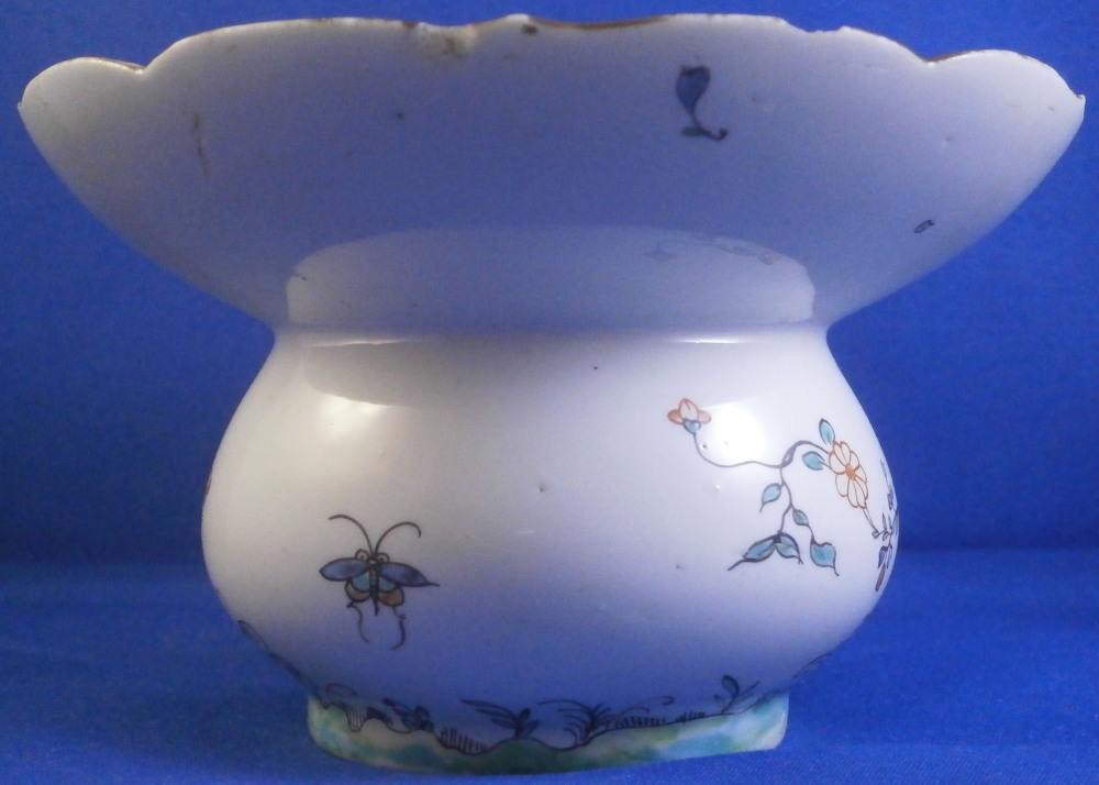 This is a very rare, fun and interesting piece made by Chantilly in the mid 18th century. It is a spittoon / cuspidor that has a typical shape to it with a nicely shaped to edge and a handle to one side. The piece is made of soft paste porcelain and hand painted in the Kekiemon palette. The inside top rim has a nice Kakiemon floral design to it as well as a smaller design to the other side. The underside rim has a kakiemon flower arrangement near the handle and some small leaves and spots painted all around likely to hide small firing flaws. The best part however is that the little bottom bulb part is hand painted all around with an imaginary landscape scene in the kakiemon style with grass, rocks and flowering branches as well as one insect/bug. Red design to the handle and brown trim to the edge. An amazing piece to look at and something you won't see again anytime soon! The piece is in good condition but does have two larger rim chips as well as some tiny ones as shown. I showed the larger rim chips from both the top and underside! If need be a decent restorer could hide them completely but I think it's part of its history and it oes display nicely the way it is. A fun piece to looks at and a great conversation starter. Great for the person that collects medical pieces or even chamber pots as well I think. The piece is marked underneath with the red hunting horn mark as well as a bunch of old dealer / collector stickers. The spittoon is 2.875 inches tall with a top diameter of 4.875 inches and the handle sticks out about 0.5 inches. Please email me for more information or other pictures.