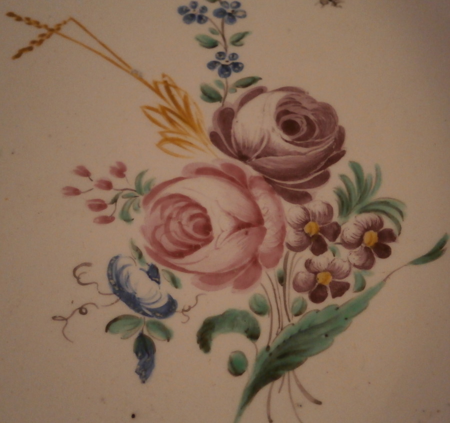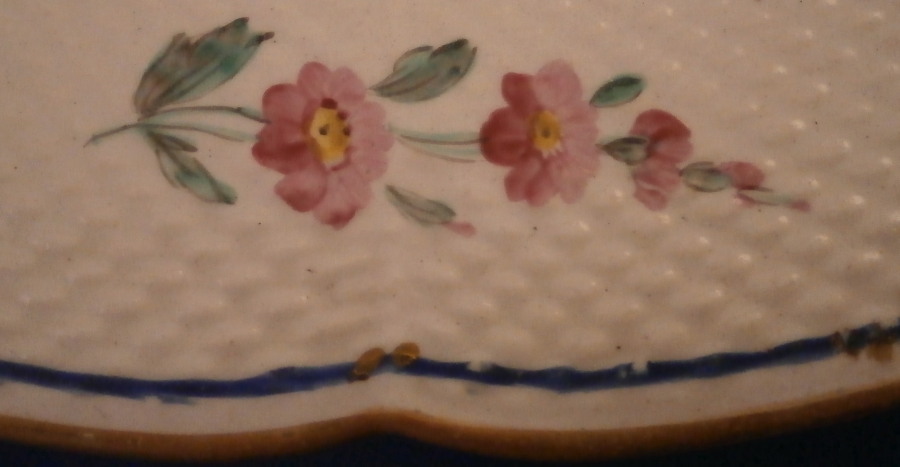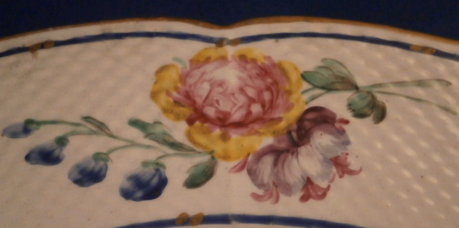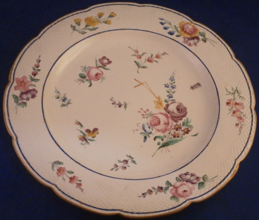 This is a nice plate made by Chantilly in the 18th century. It is made of soft paste porcelain and hand painted with a design after the famous Sevres designs for their larger dinner services that are still a favorite among collectors today. The two blue trim lines with the double small gold lines are the base of that design. Lots of floral arrangements as well as single flowers all over the plate as well as a small bug and a gold trim to the edge. The rim has a basketweave design to the paste. The plate even has a fake Sevres mark underneath but at least they also added their hunting horn mark to it to not totally try to fool the buyers. Never seen anything like that from them. The plate is in superb condition with some very minor age related wear and use marks but about as good as you can hope for. It displays perfectly and looks great! Marked as mentioned with the interlaced double L mark as well as a purple hunting horn with a letter A underneath and an incised hunting horn as well. Another thing I have not seen before. Really a very itneresting plate that might have been intended as a replacement piece back then. The piece is 9.625 inches in diameter and 1 inch tall. Please email me for more information or other pictures.